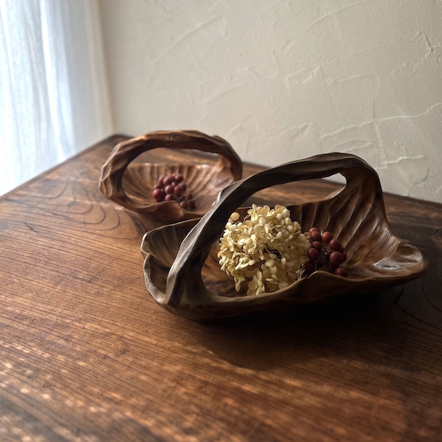 木彫りバスケット 籠 サイズ違い2個セット◆天然木くり抜き 手仕事