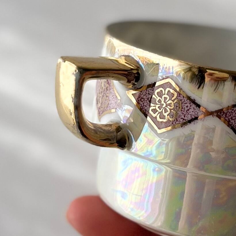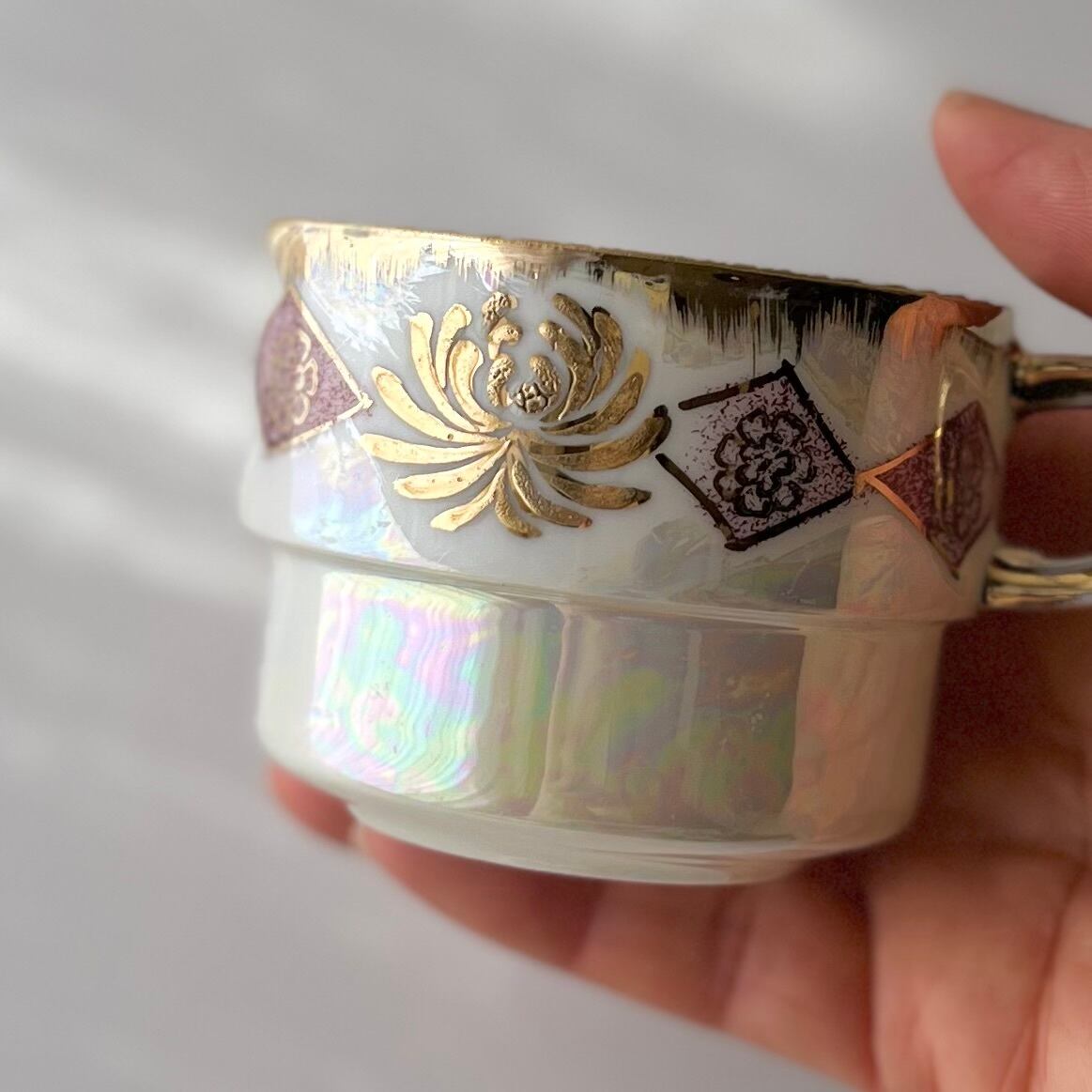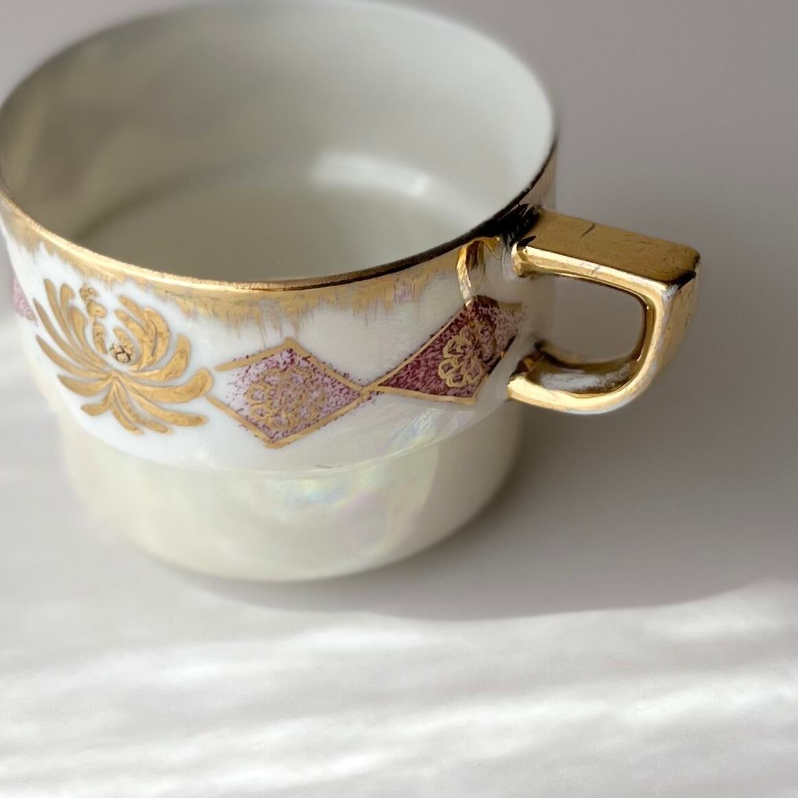 ラスター彩◆小さめコーヒーカップ ビンテージ 金彩 ピンク色のガーランド