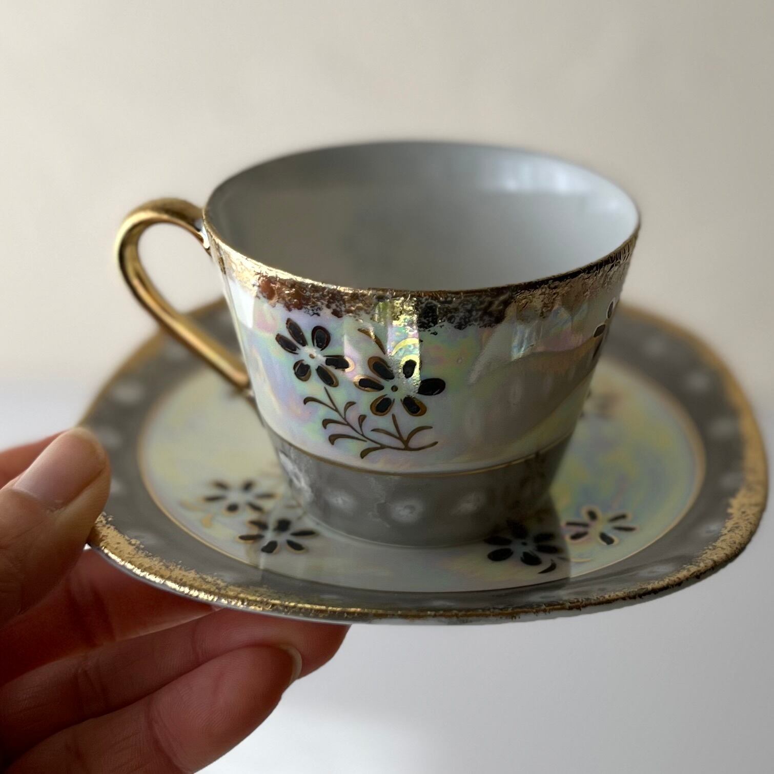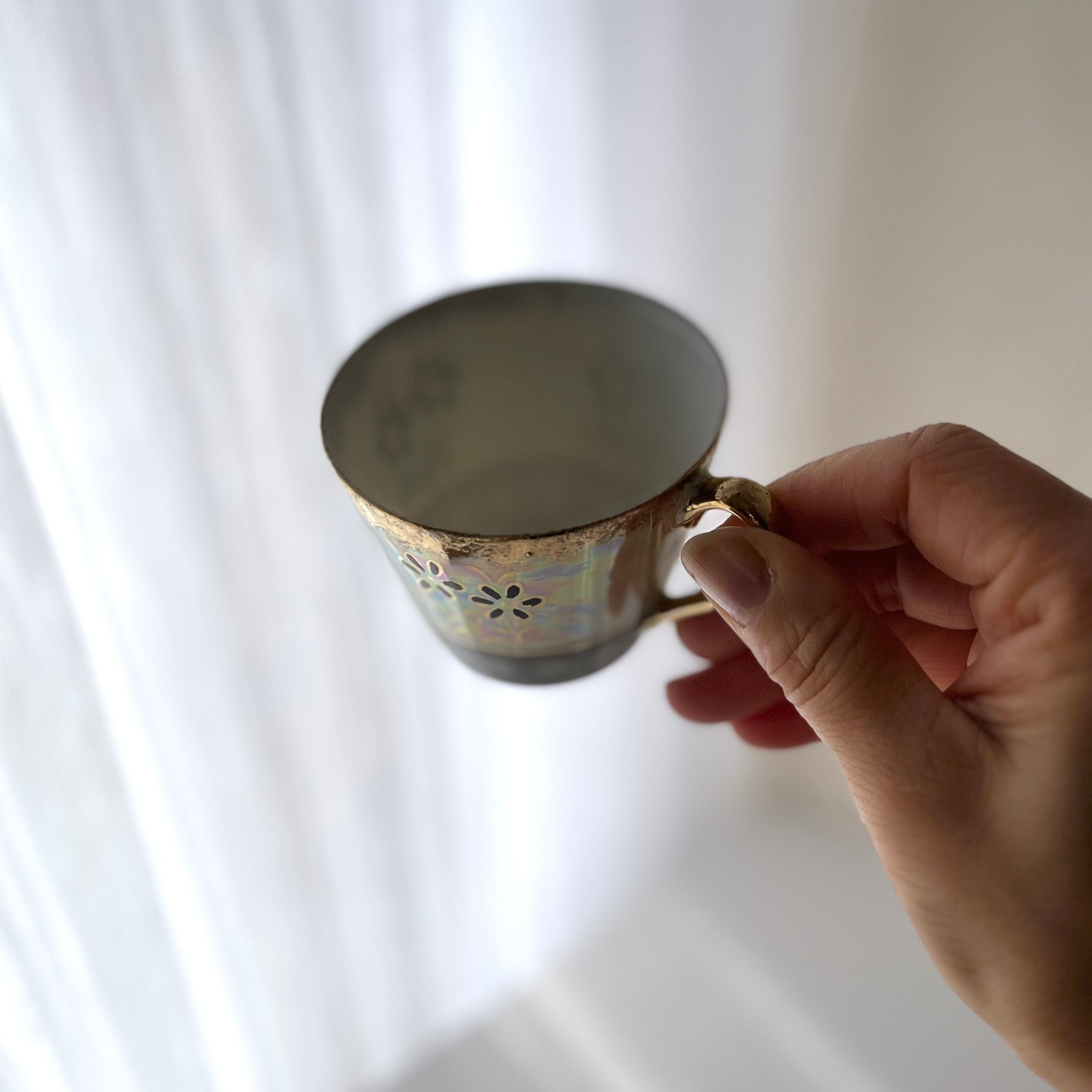 【ラスター彩◆小さめコーヒーカップ ビンテージ 厚めの金彩 素朴な花柄】