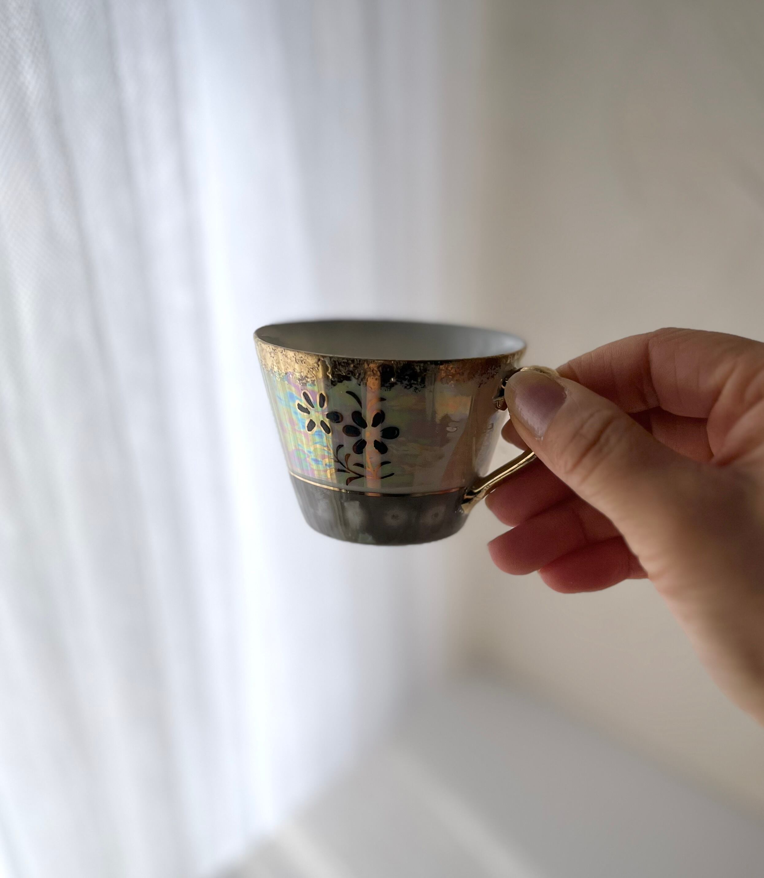 ラスター彩◆小さめコーヒーカップ ビンテージ 厚めの金彩 素朴な花柄