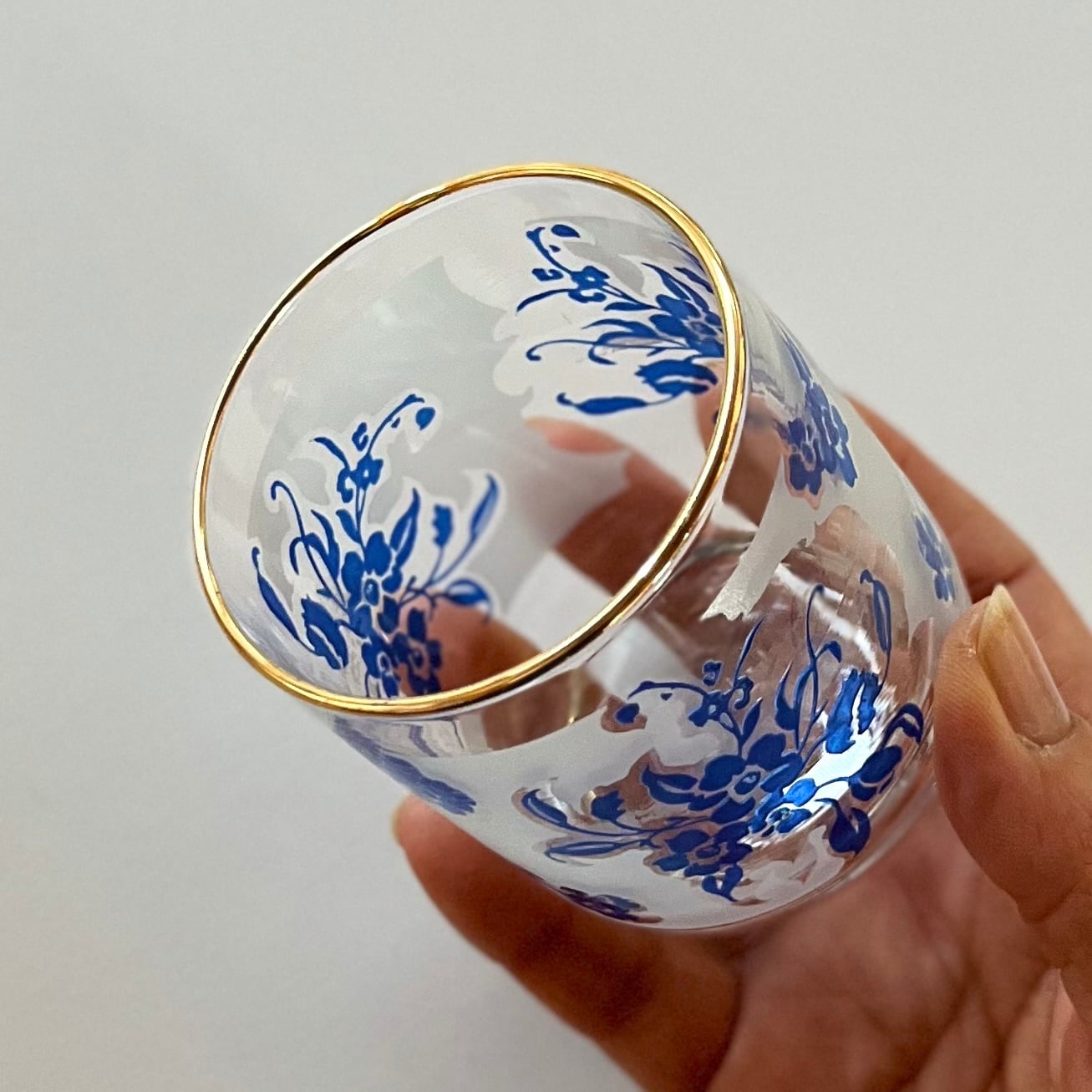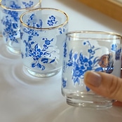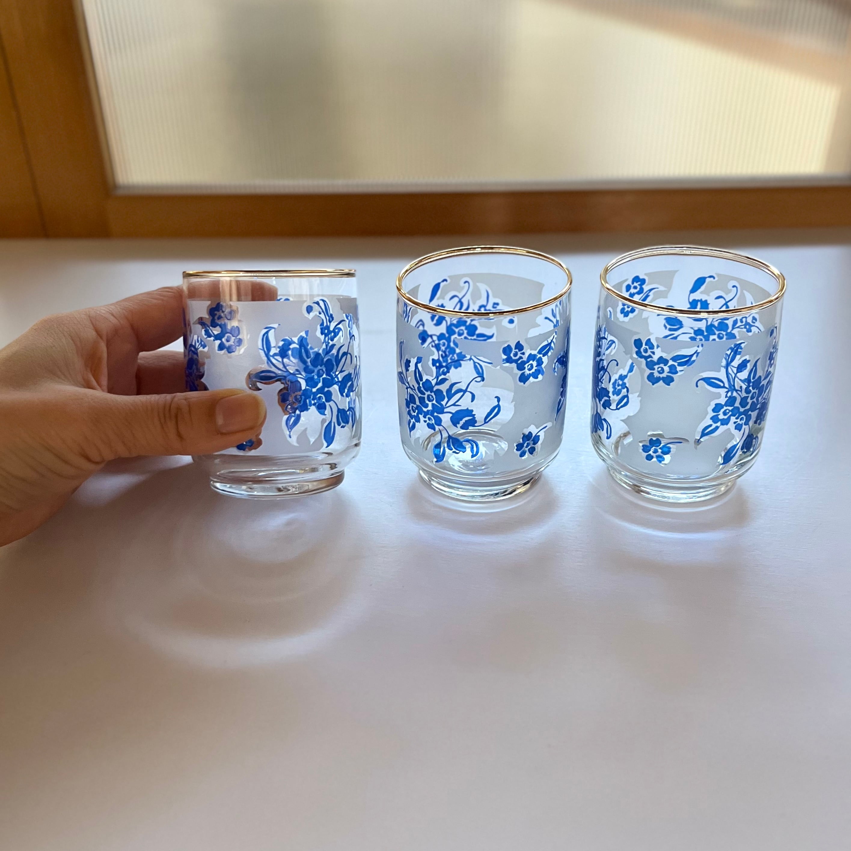 青い花柄のショートタンブラー3個セット。