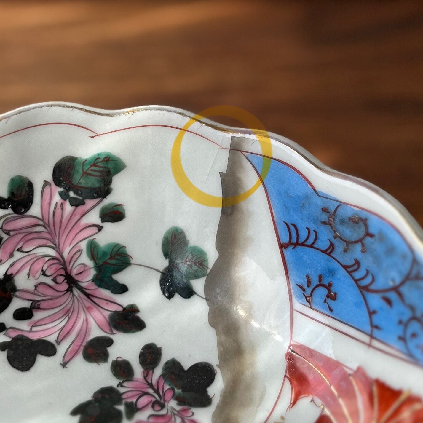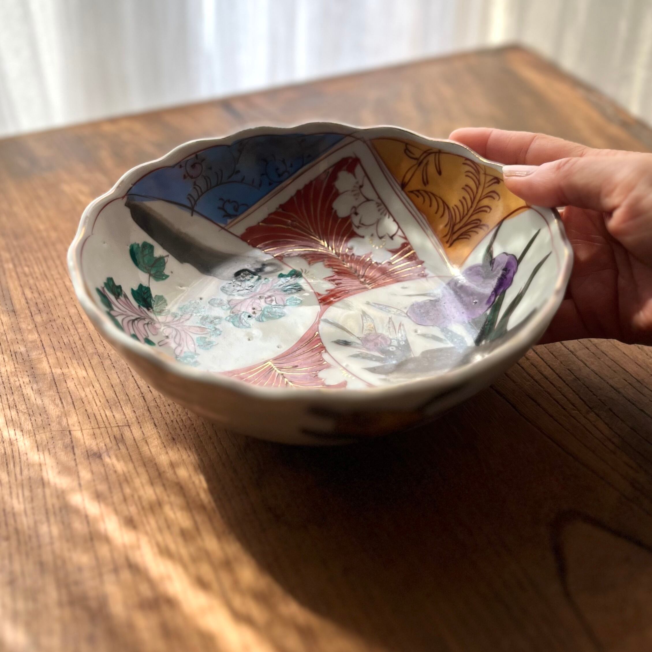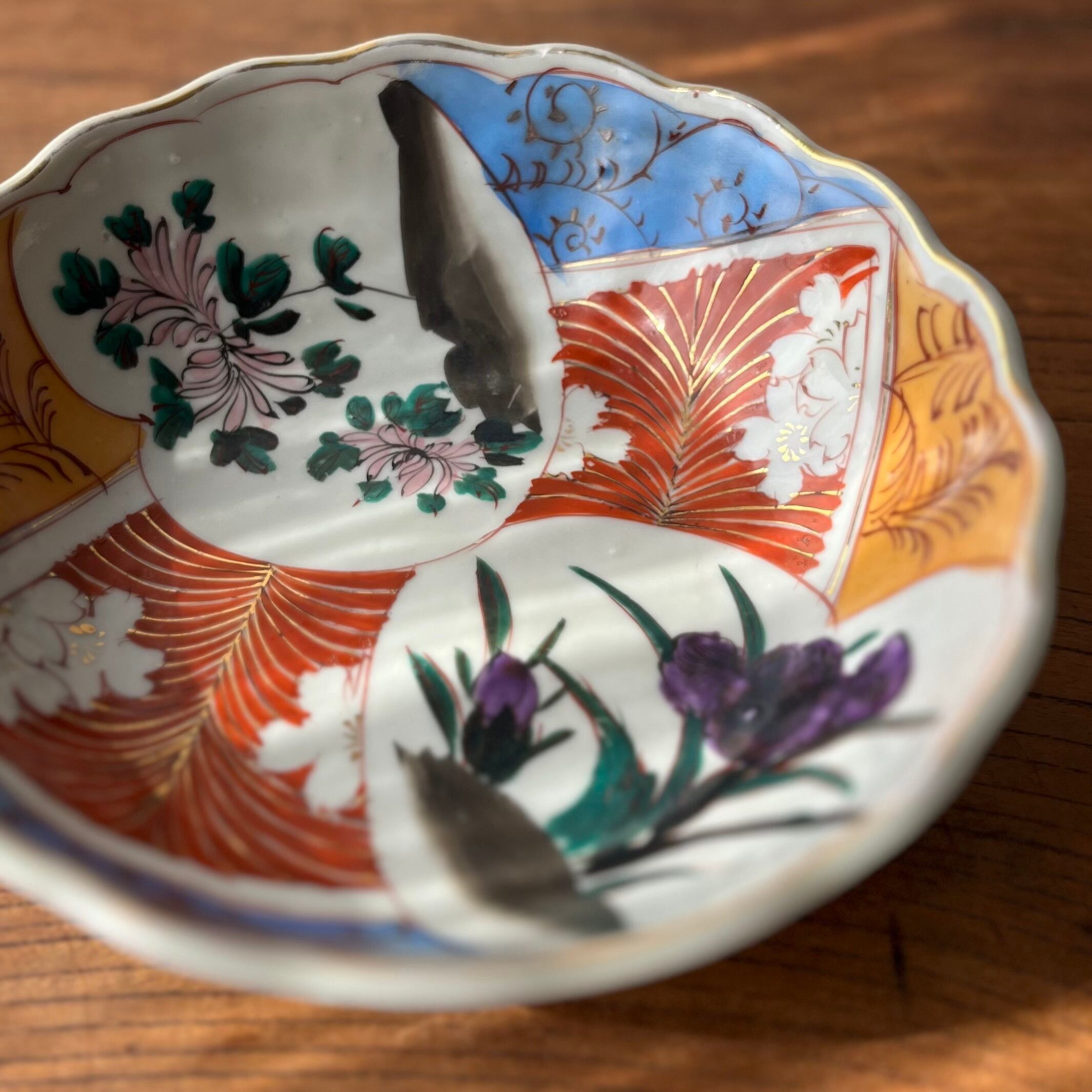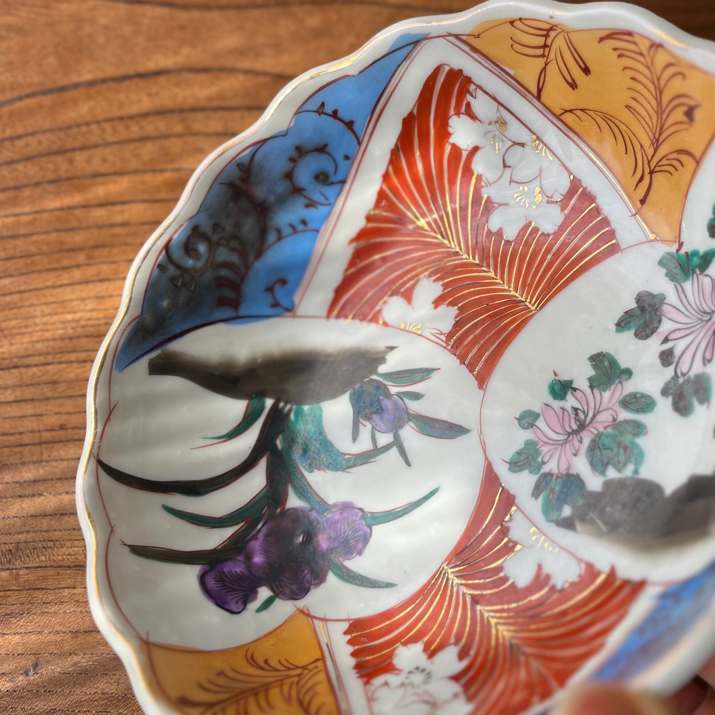 ・古い時代のものです。フリモノやピンホールなどの窯きず(焼成時にできた傷)や、染料の色ムラ、色移り、貫入(画像17枚目)などございます。
