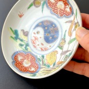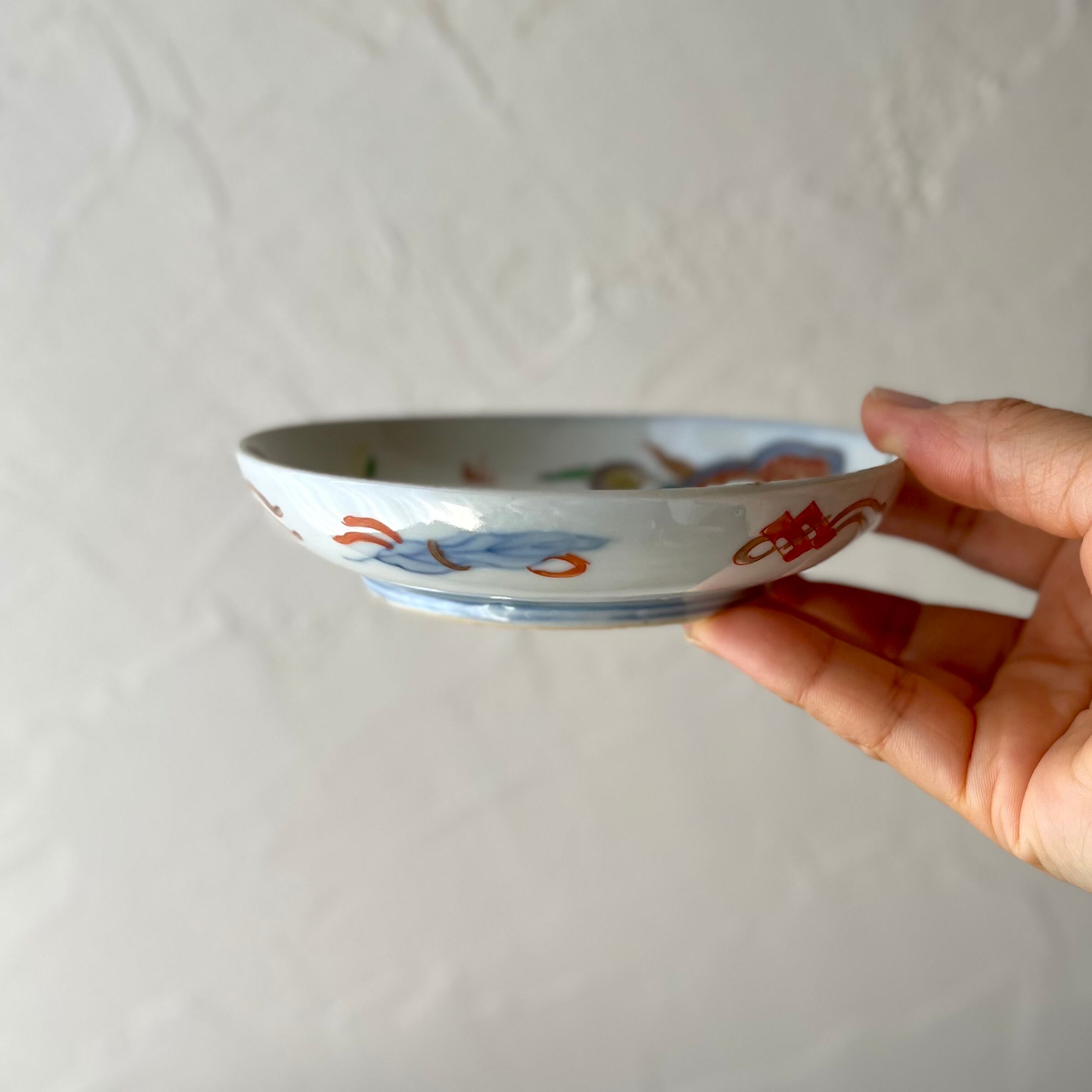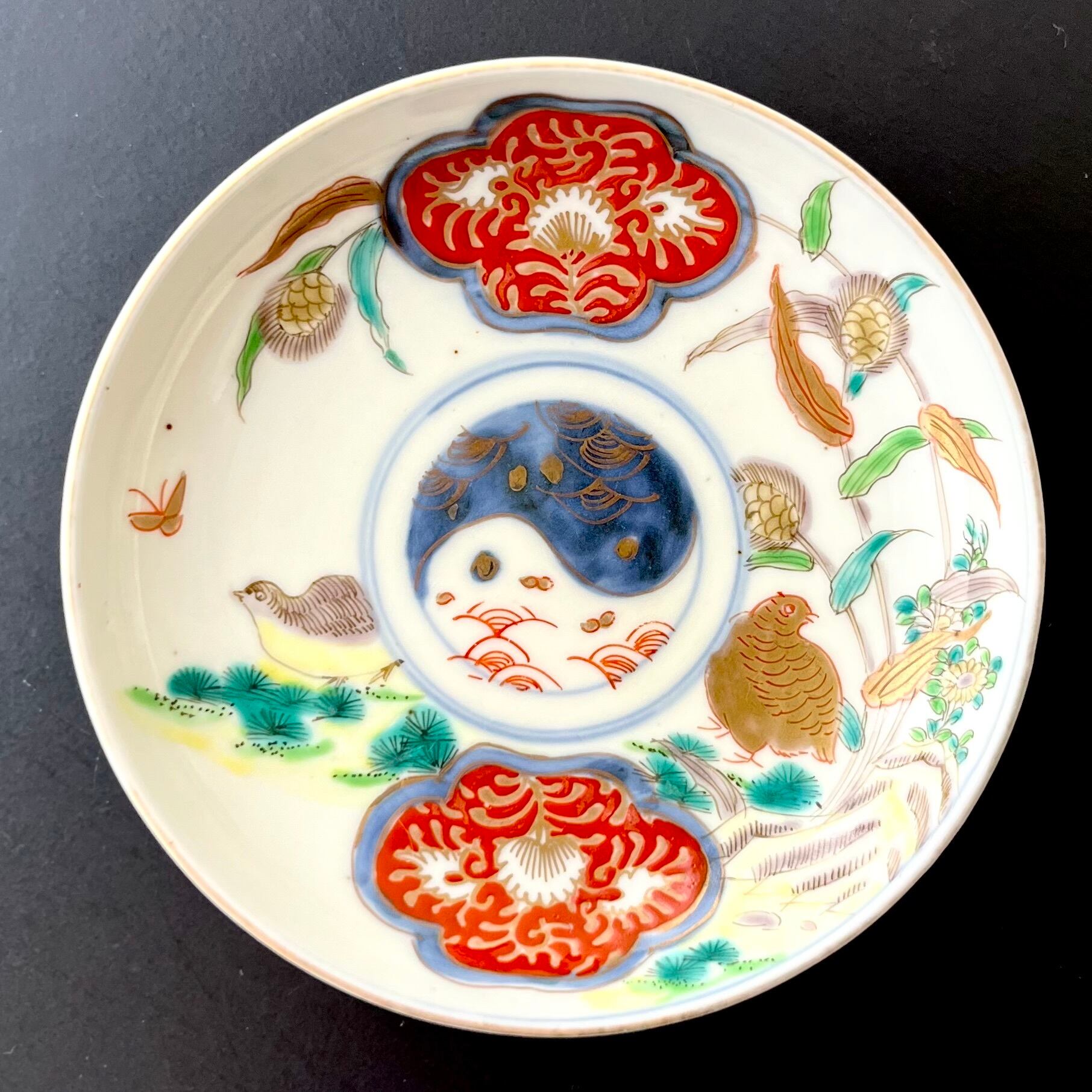 【伊万里 色絵金彩小皿 鶉図 右回りの陰陽文◆明治前期】