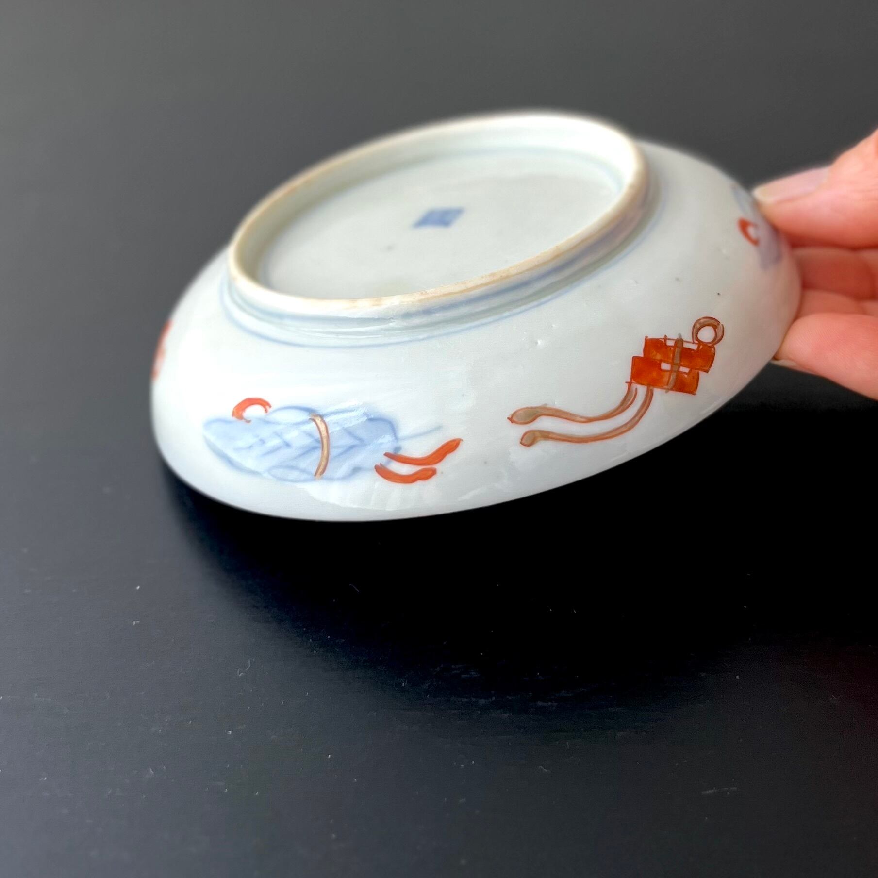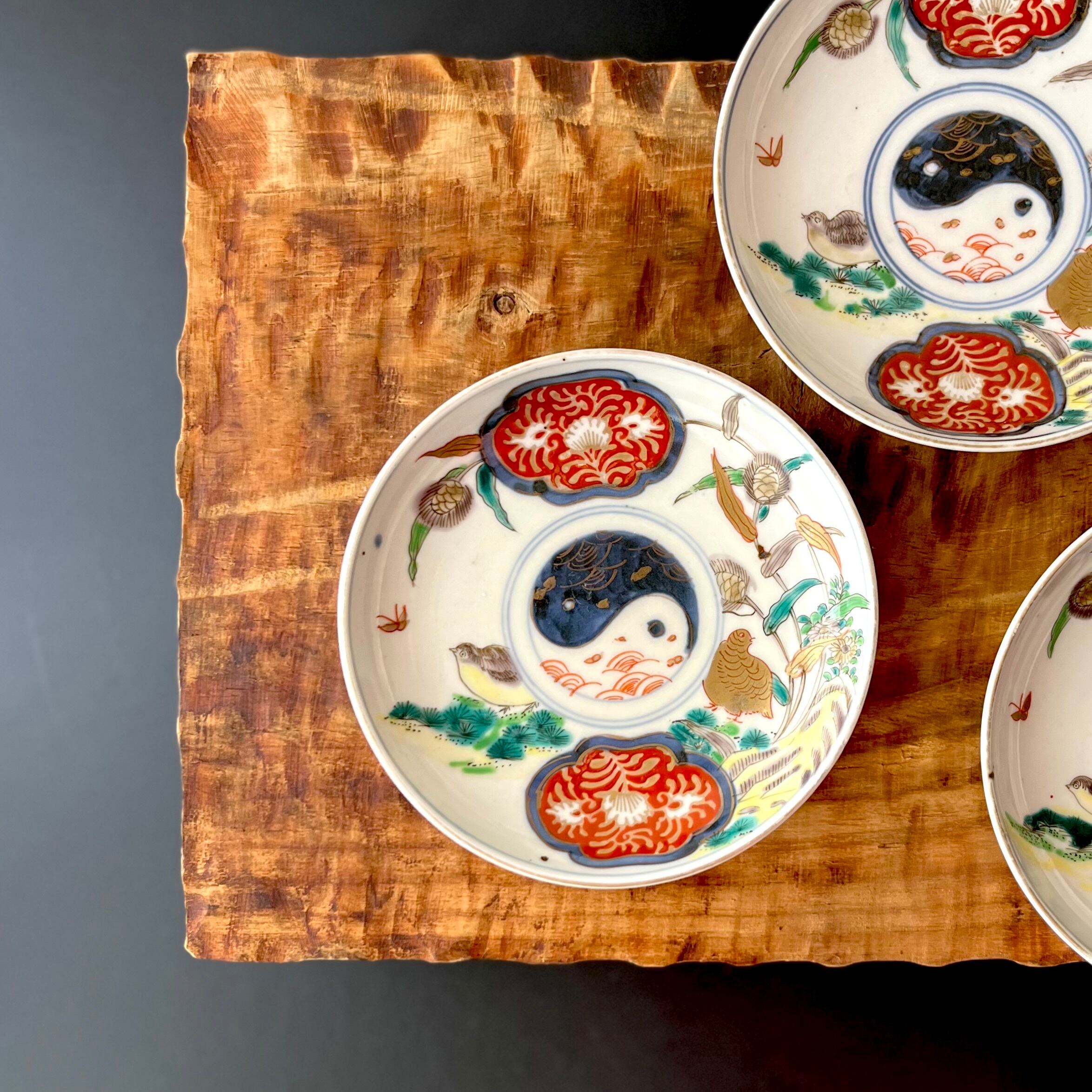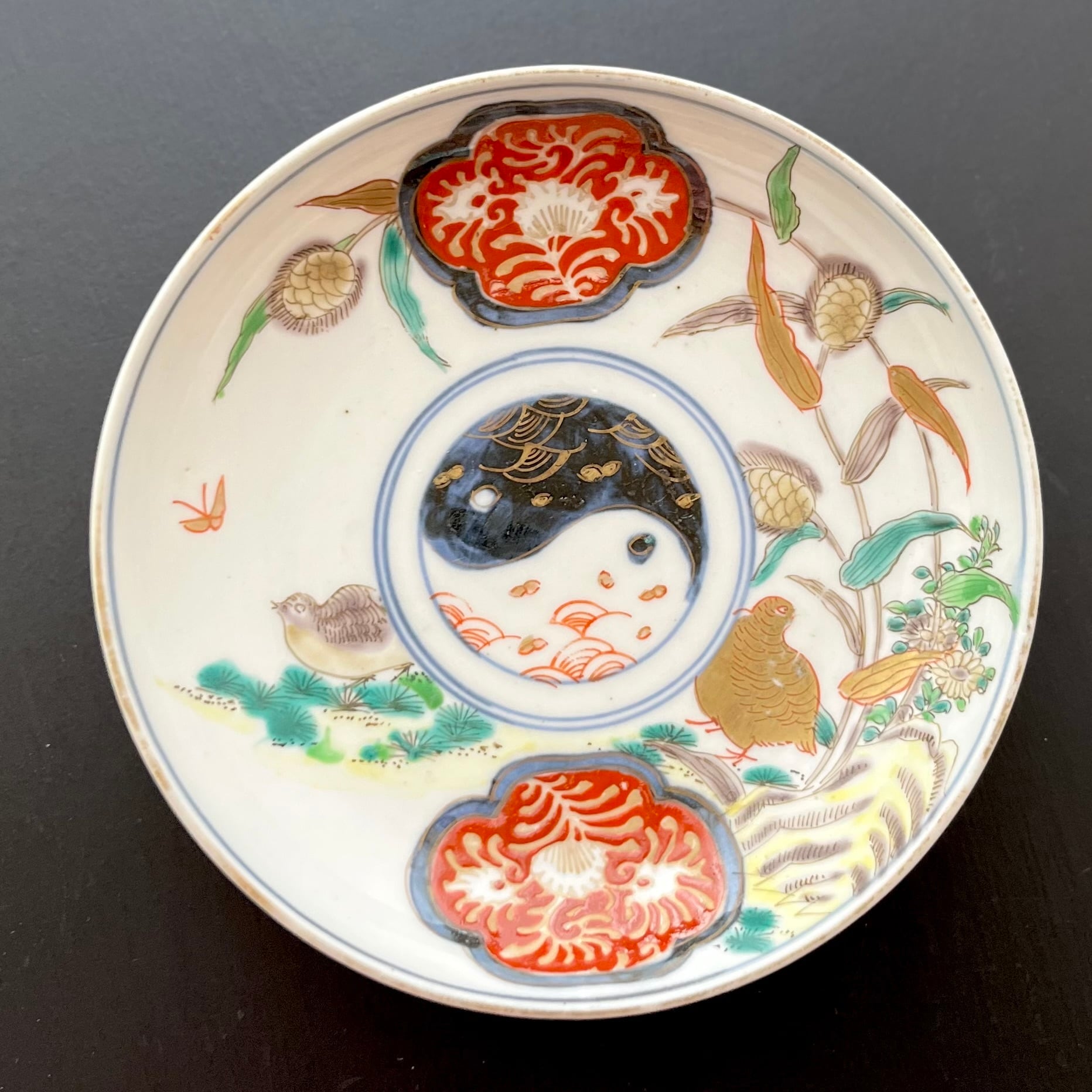 【伊万里 色絵金彩小皿 鶉図 左回りの陰陽文◆明治前期】