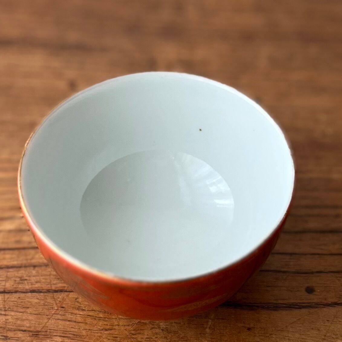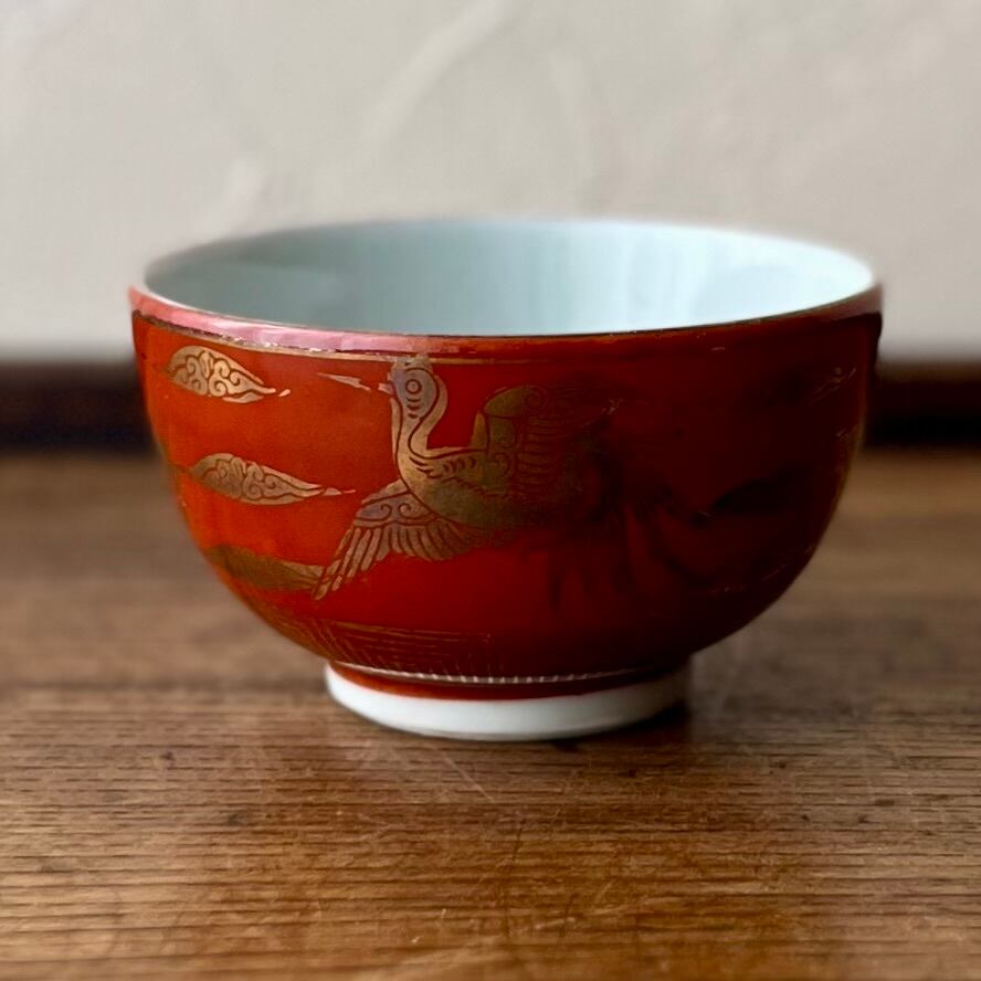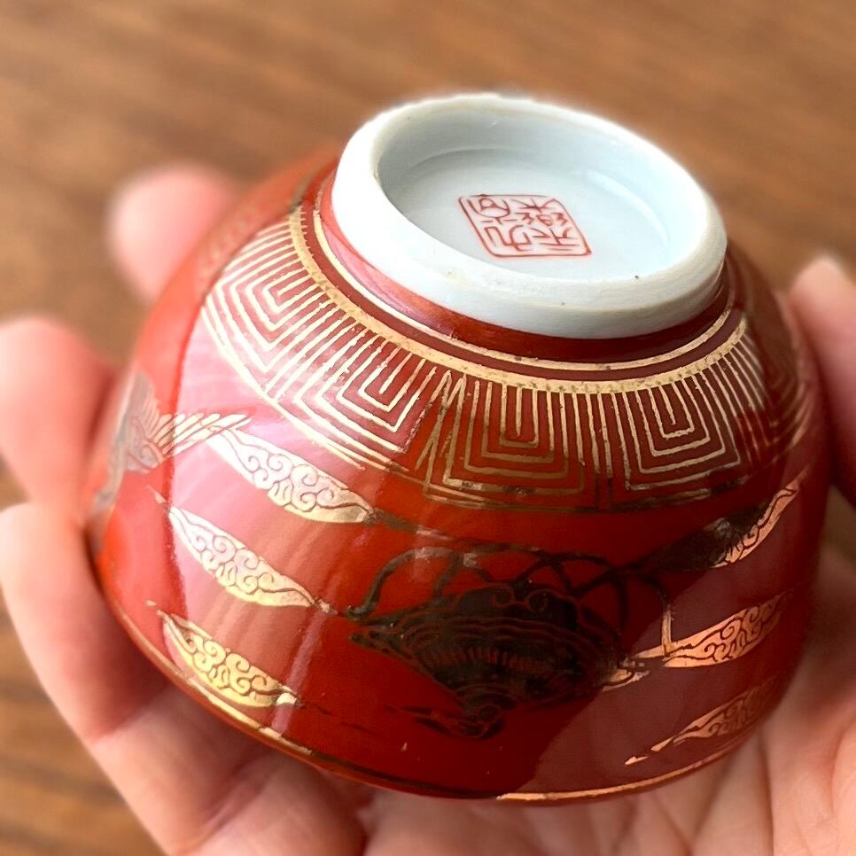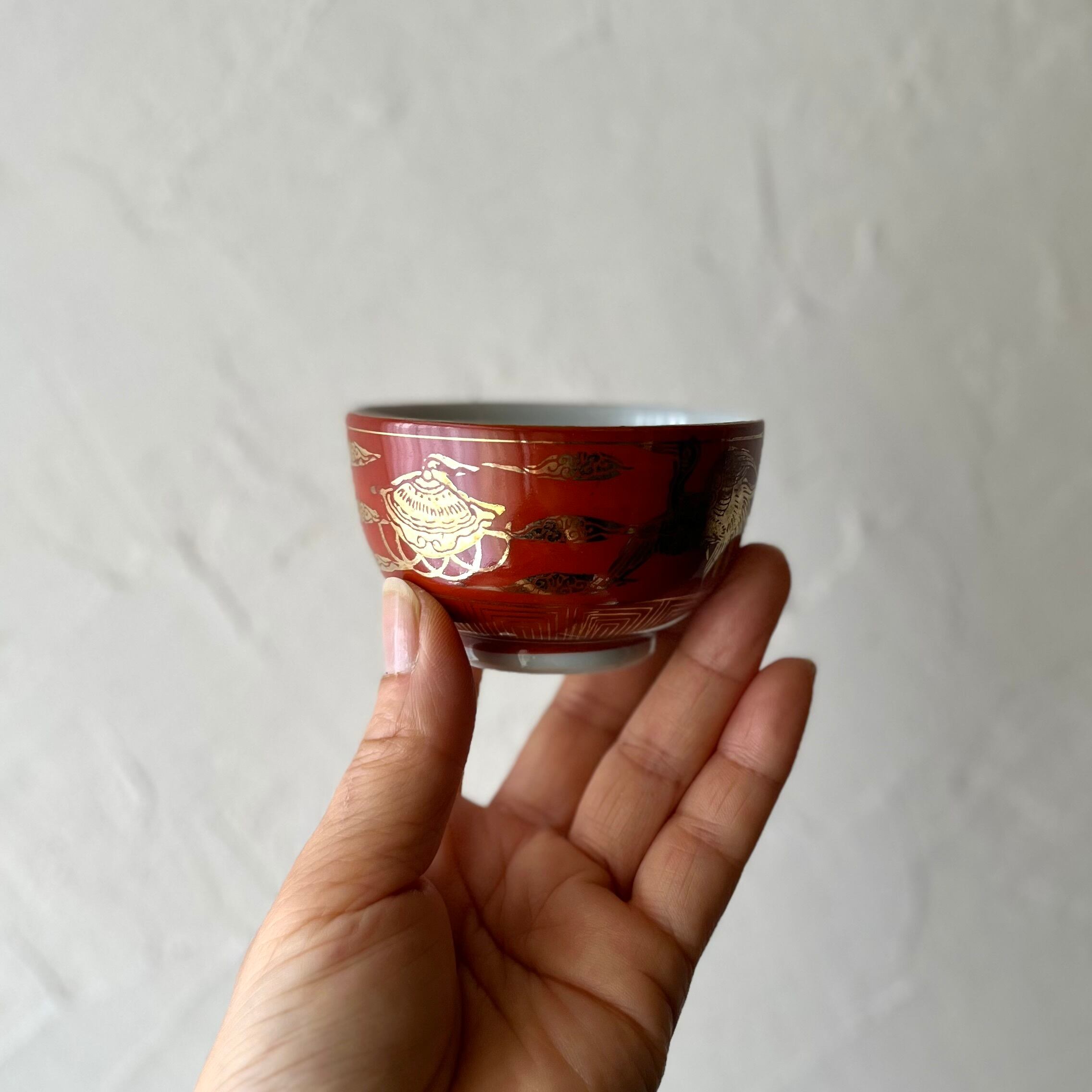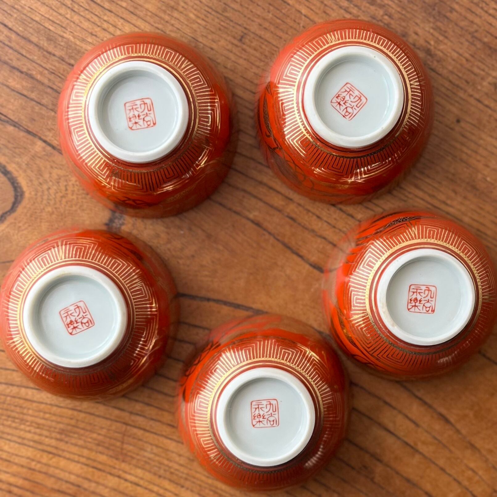 九谷永楽 湯呑5個組 朱色に金彩の鶴