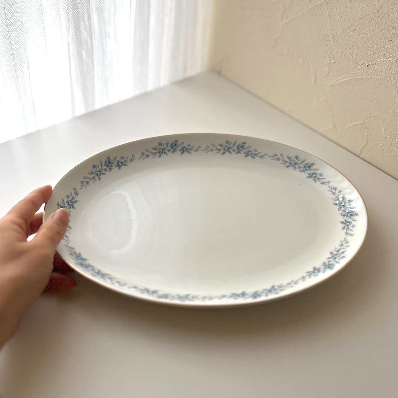 【レトロ◆シックなオーバル皿 青いミニ薔薇 楕円 31cm】