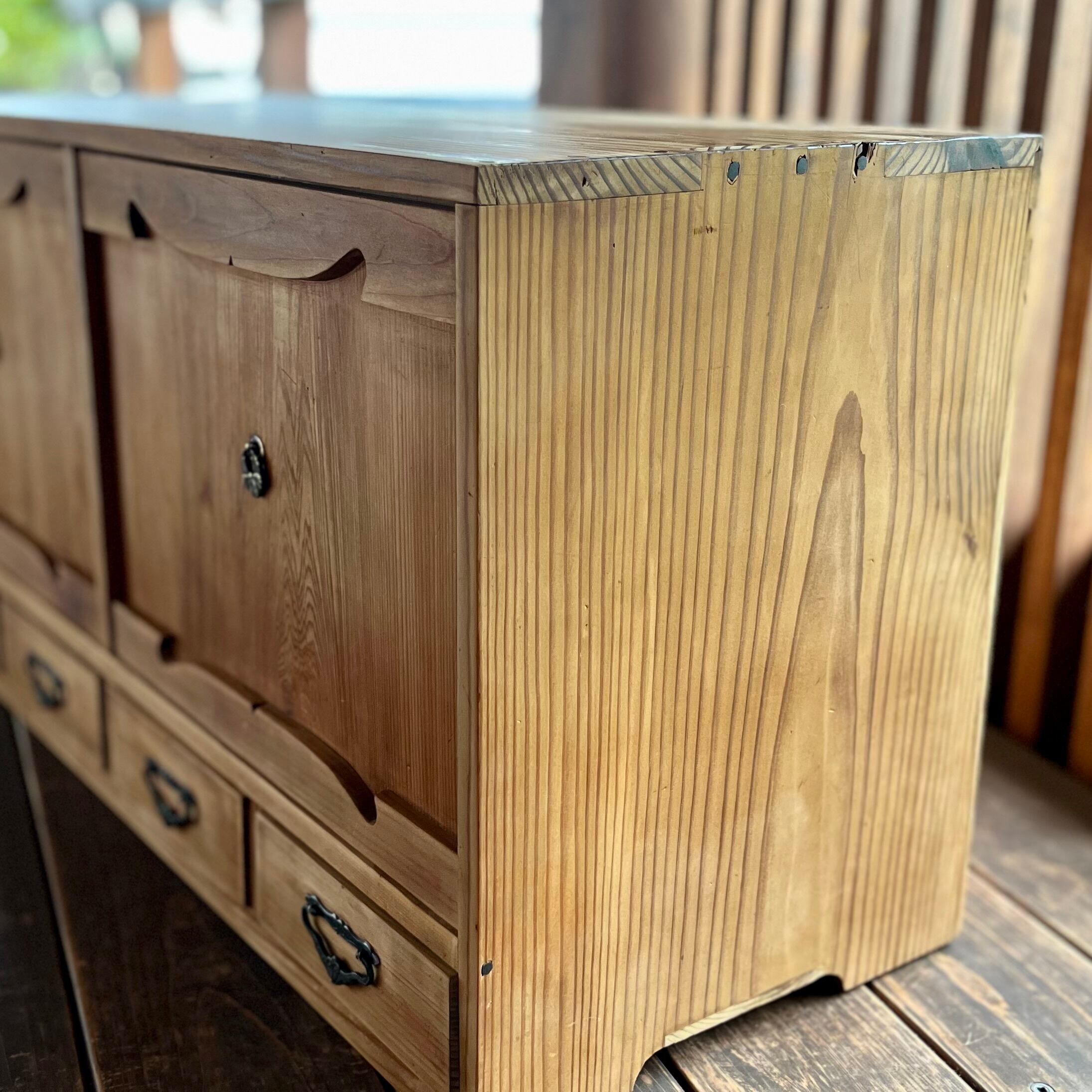 ・経年による傷み(染み、傷、削れ)などございます。特に天板、けんどん扉の表面に多く小傷がございますが、アンティーク家具として良い趣となっております。古い道具の味わいとしてお愉しみください。