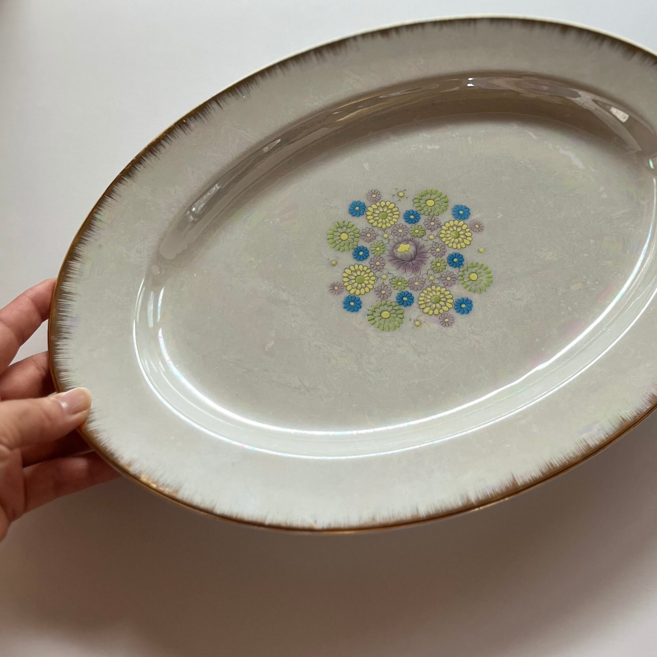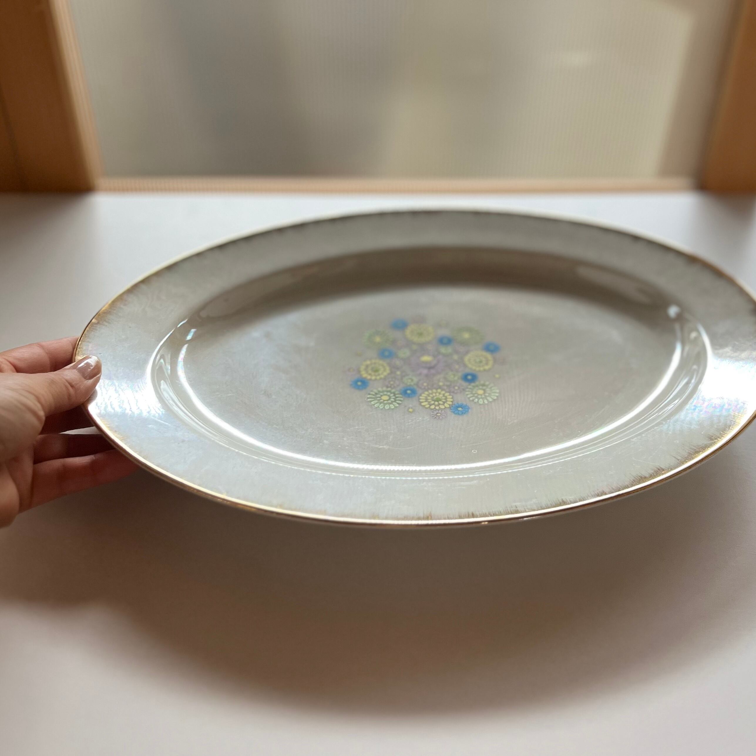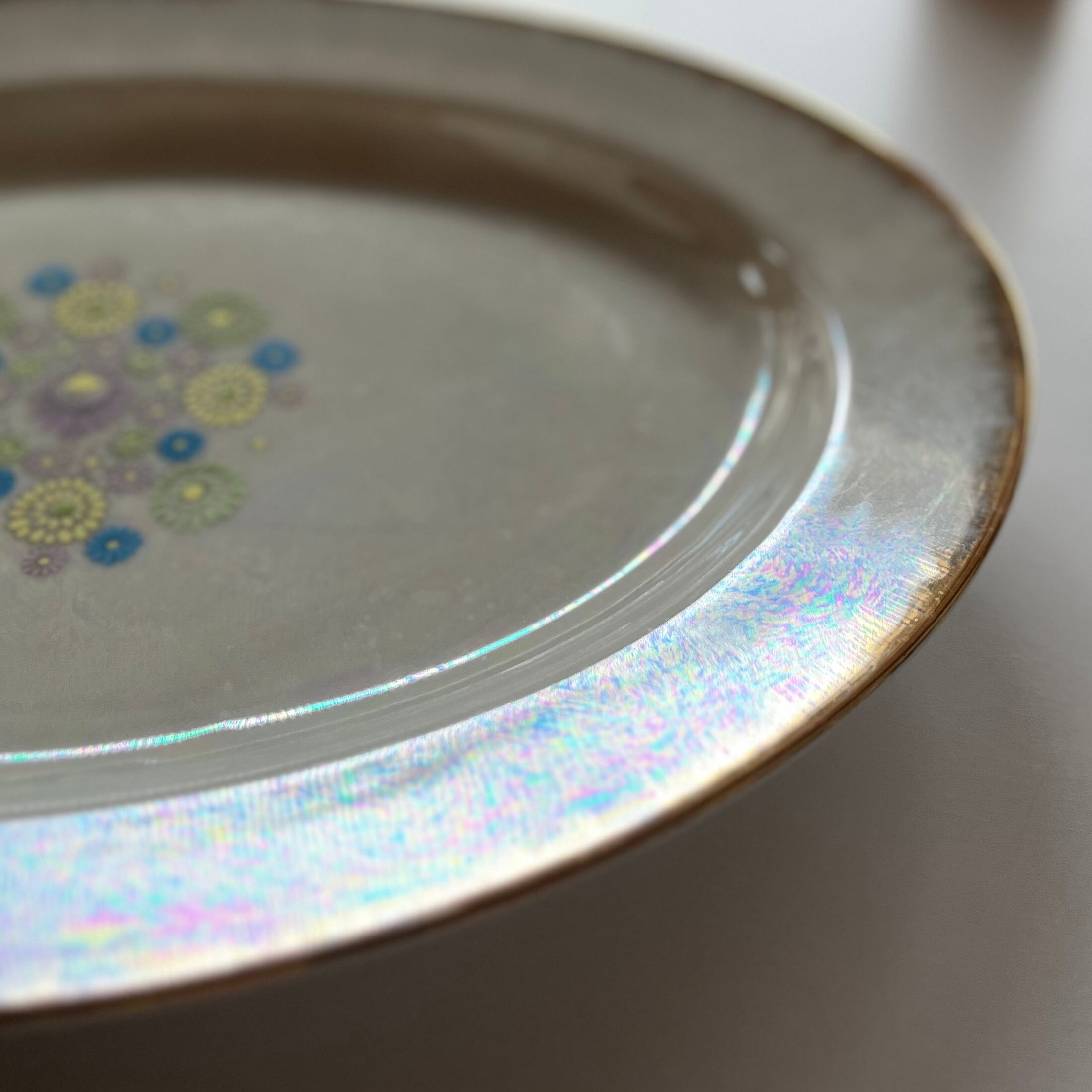 ラスター彩◆オーバル皿 中央に花柄 金彩の縁取り