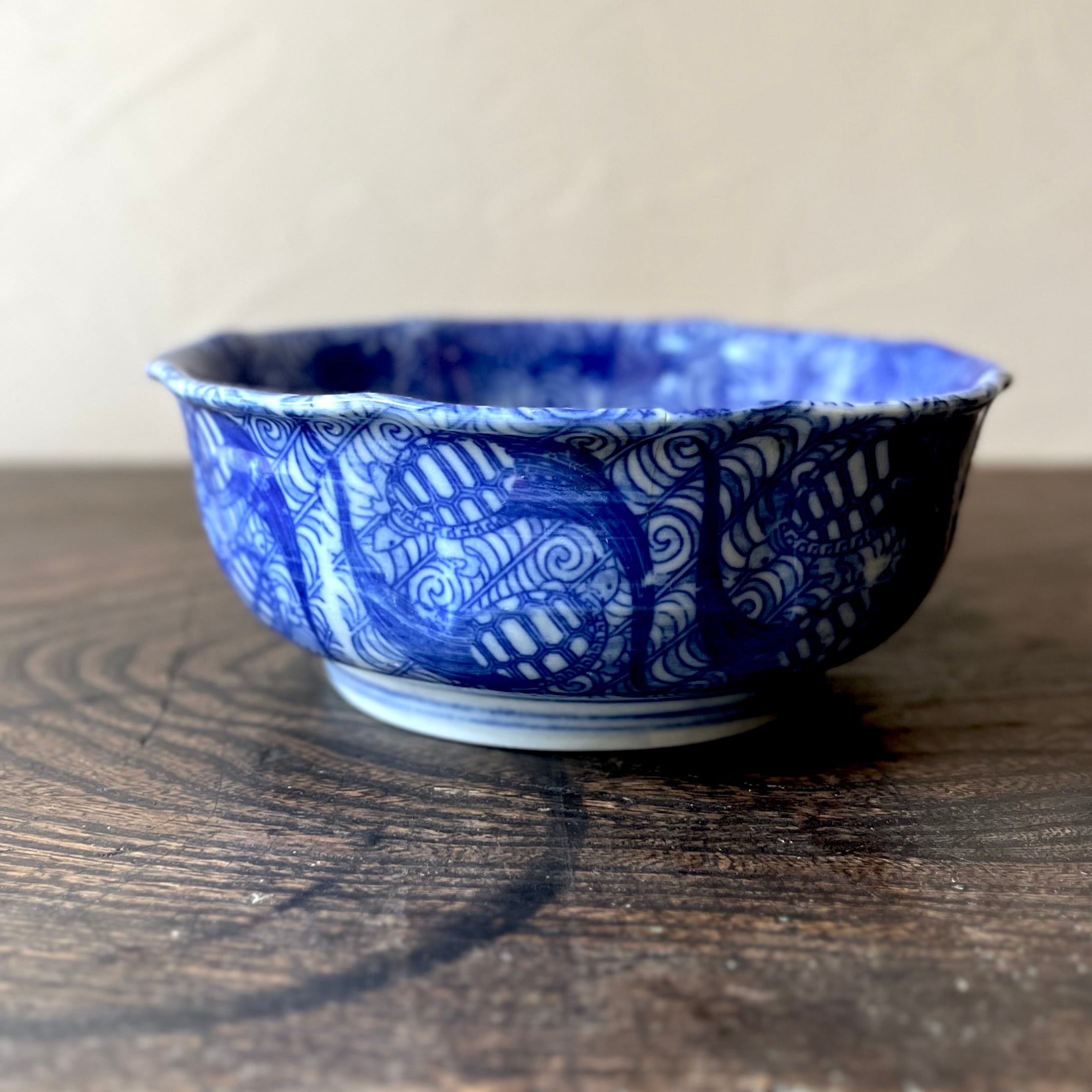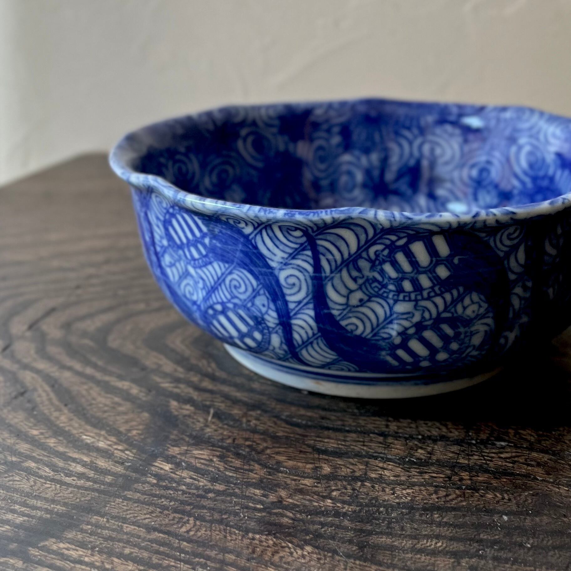 【印判6寸鉢 花型 渦巻に菊と紅葉 見込みに鶴】