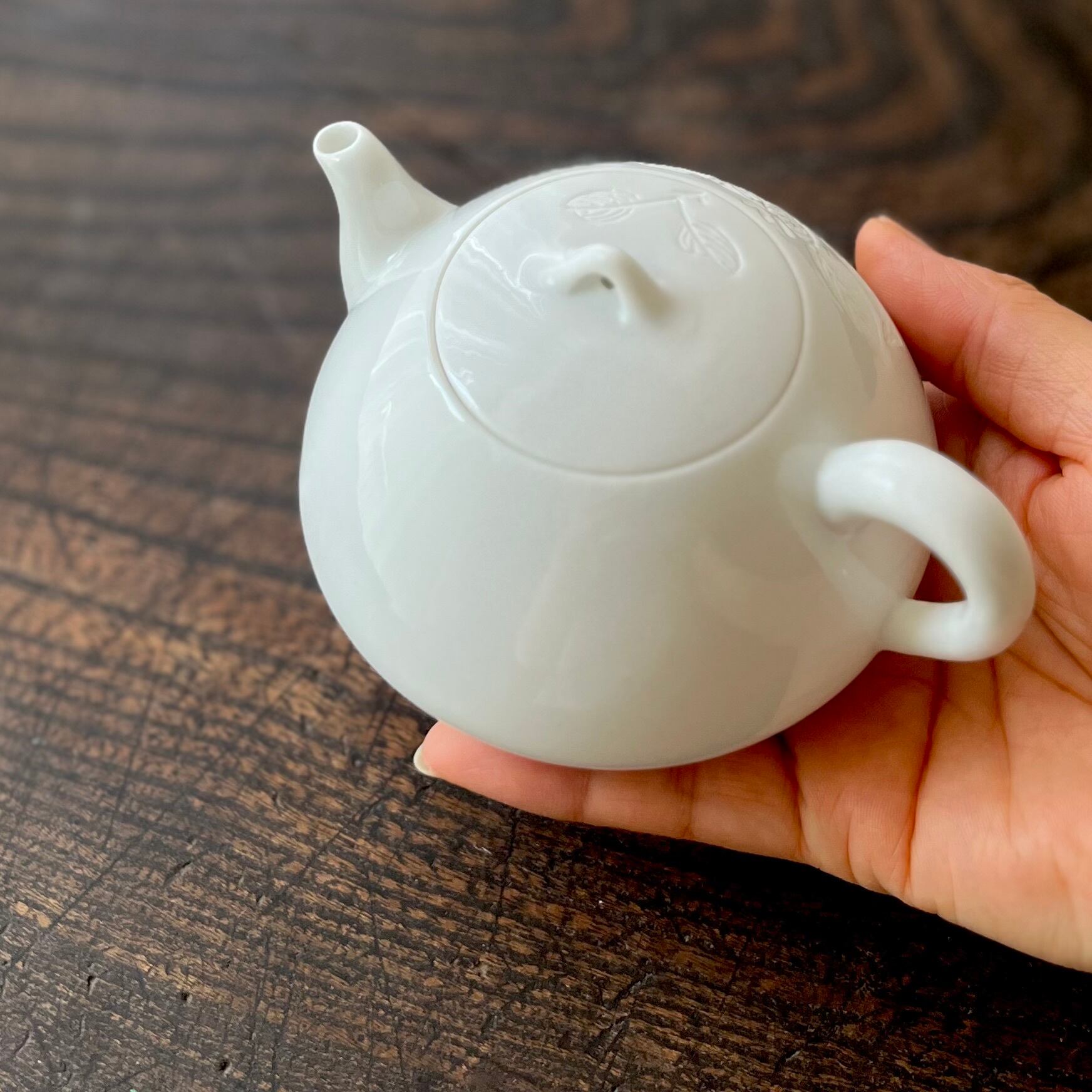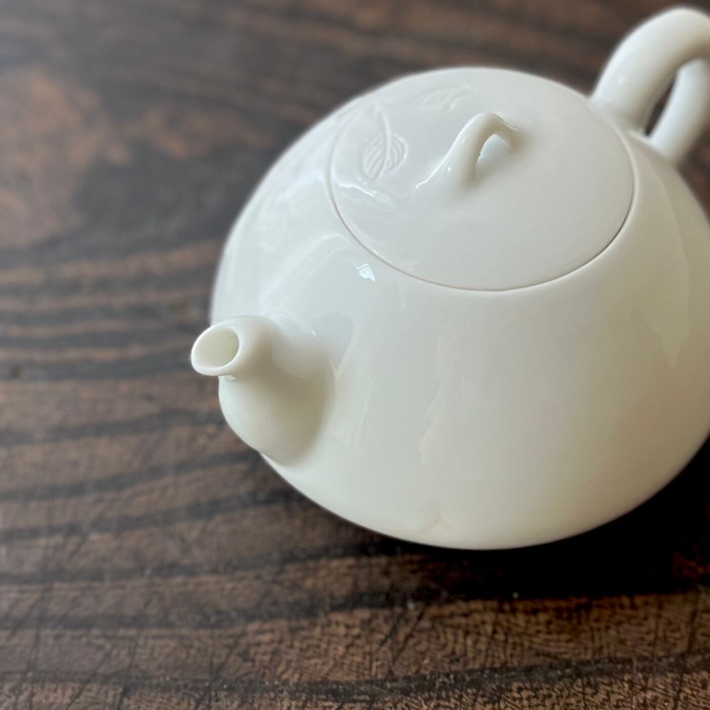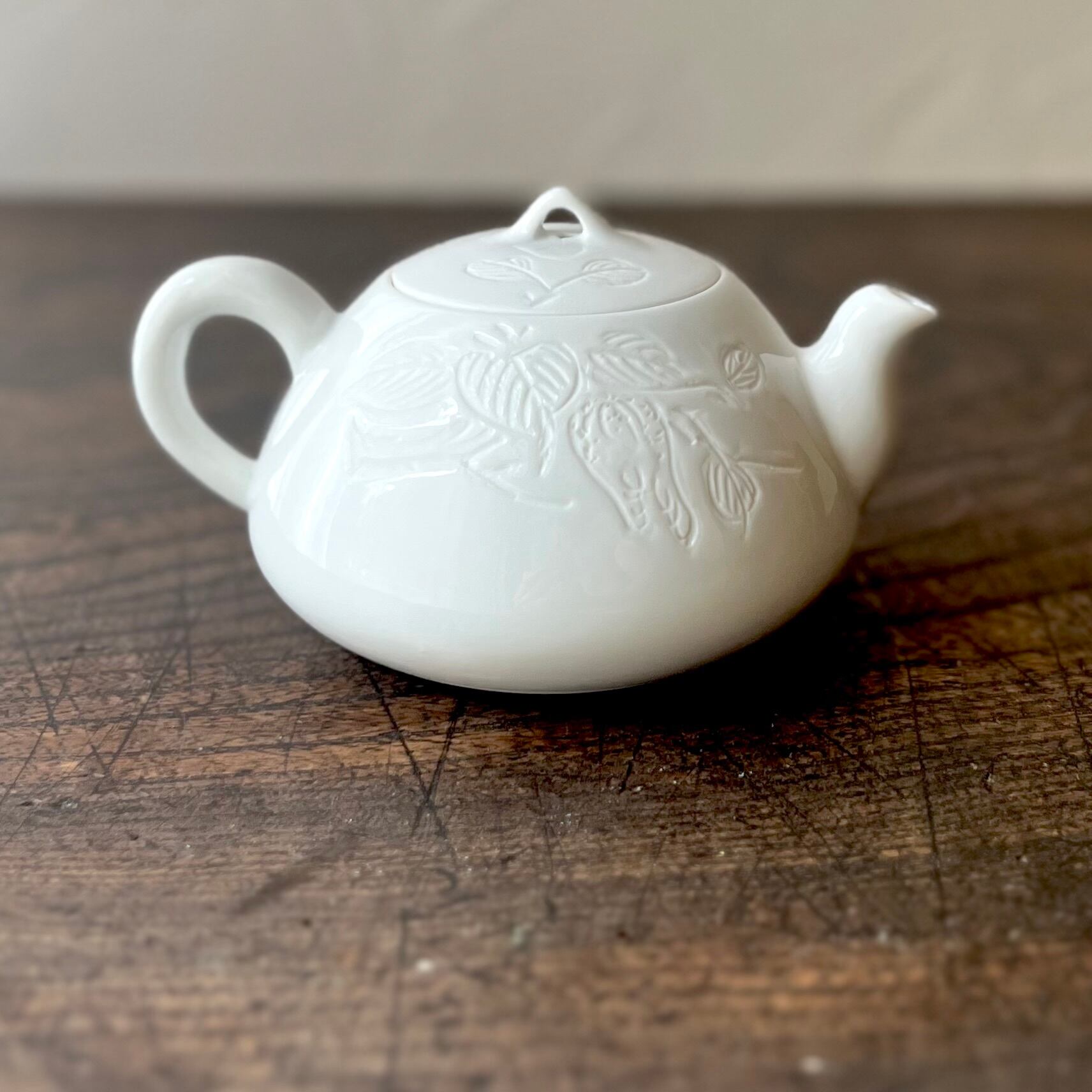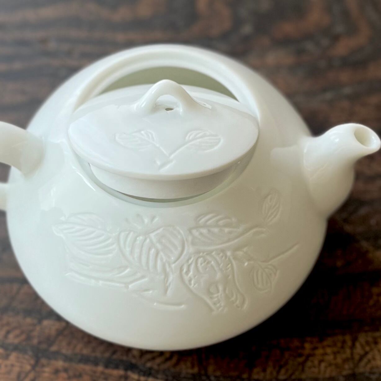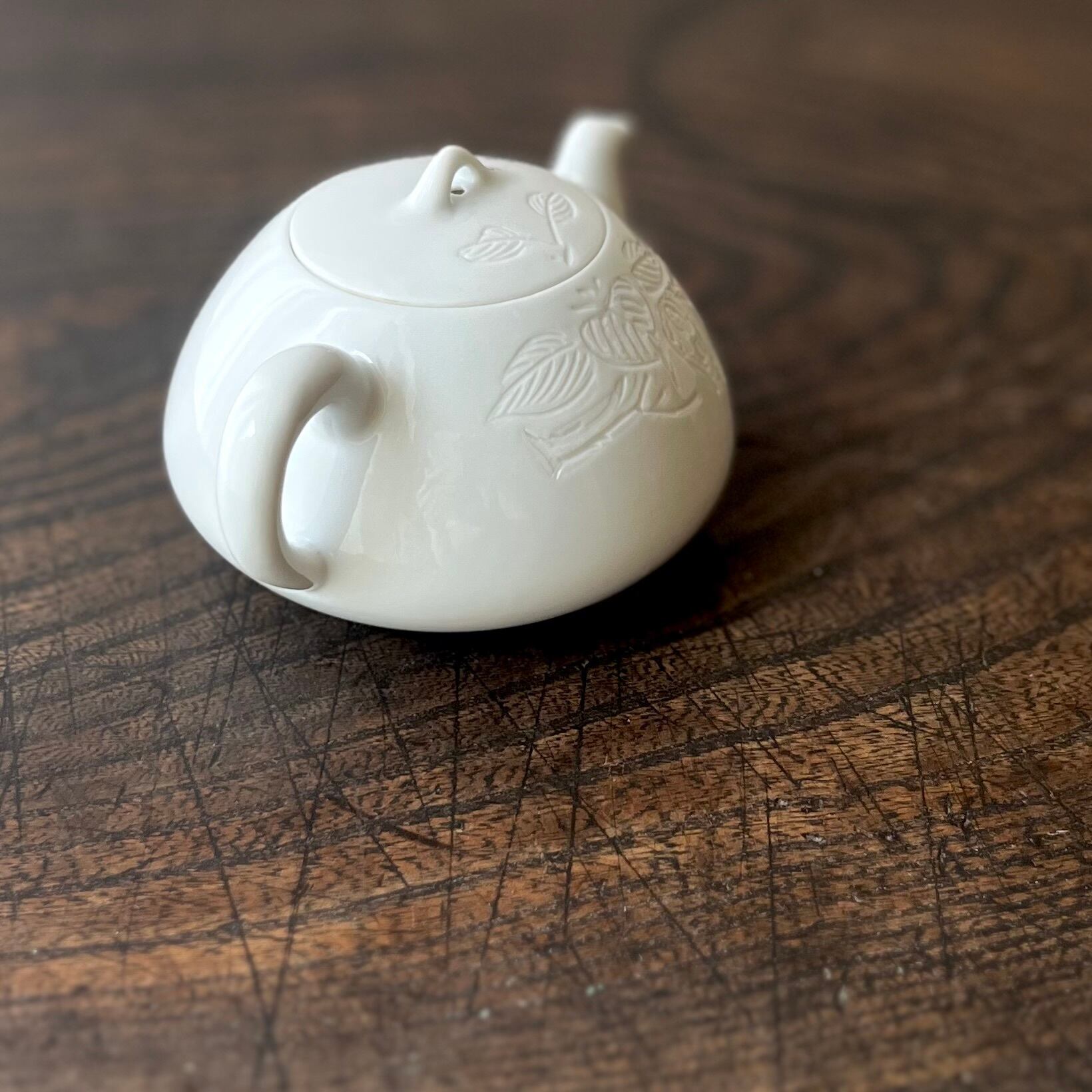 枝葉の絵柄が彫られた、白磁の小さな急須。