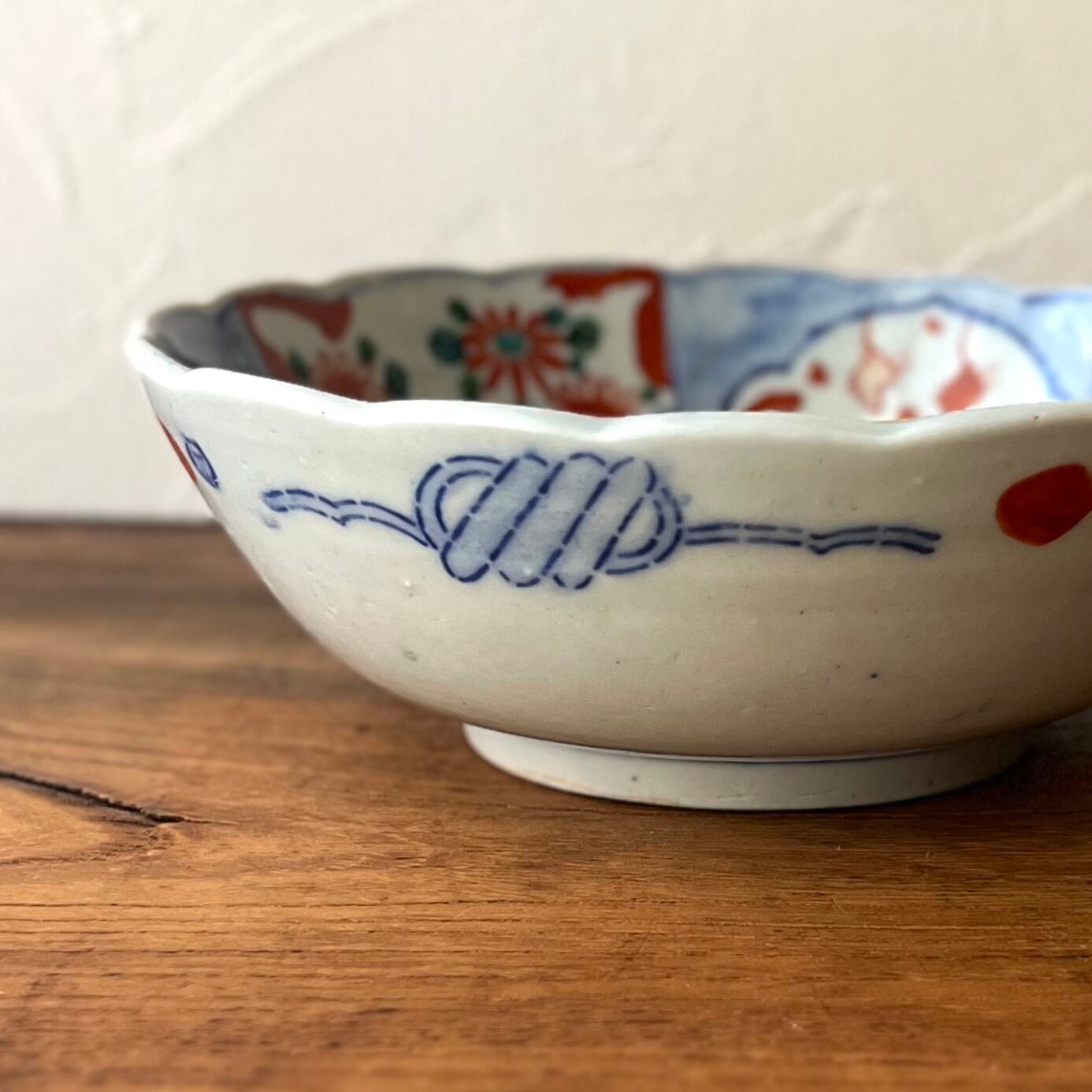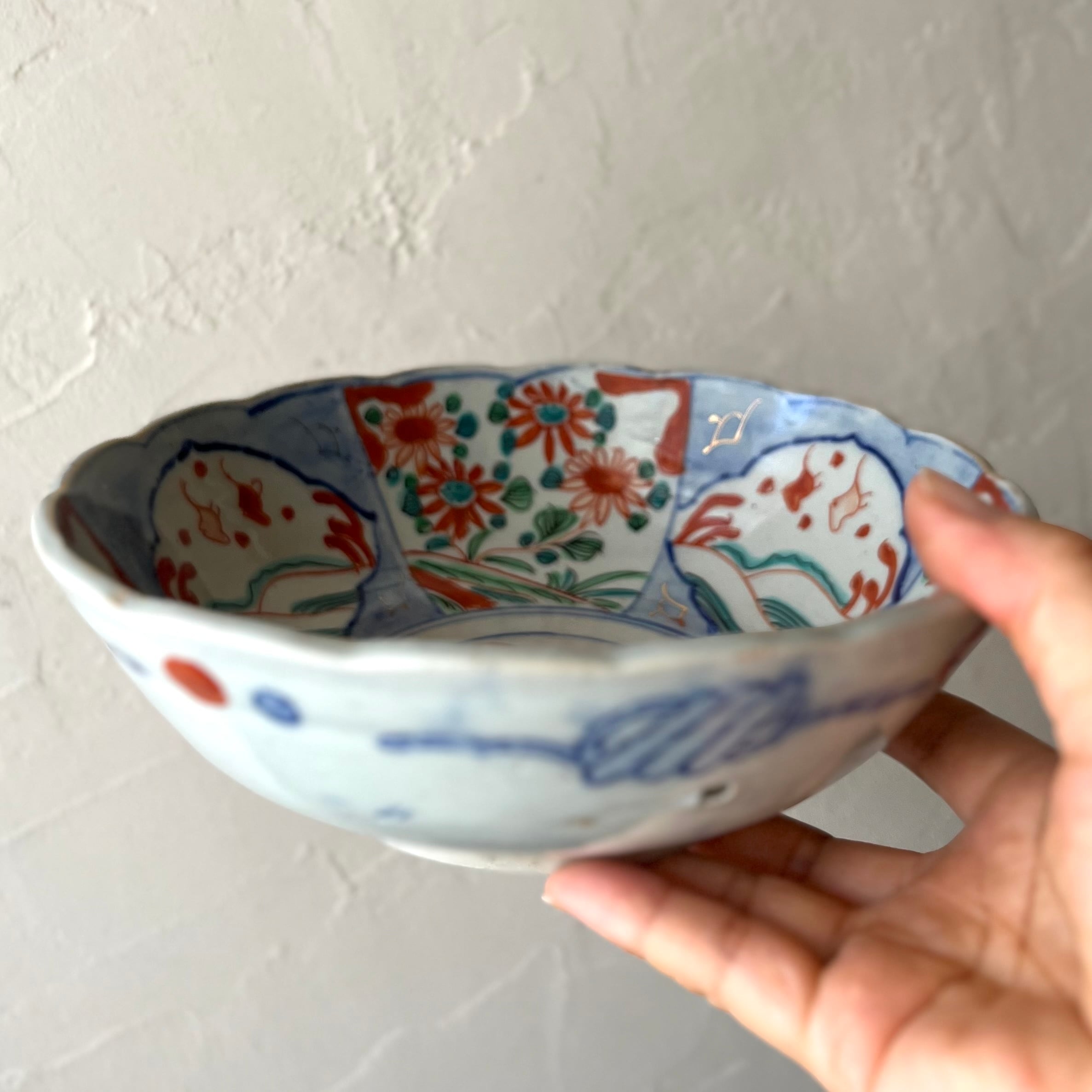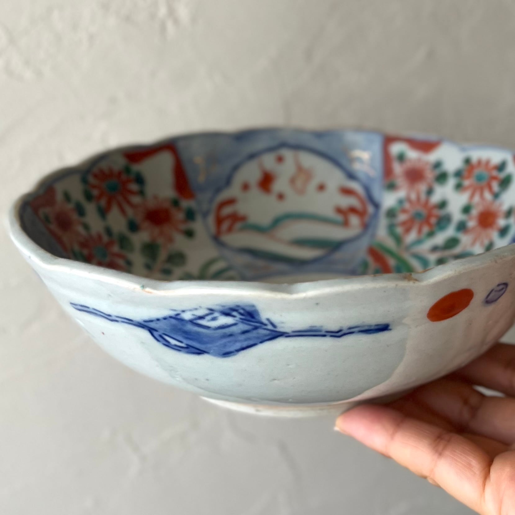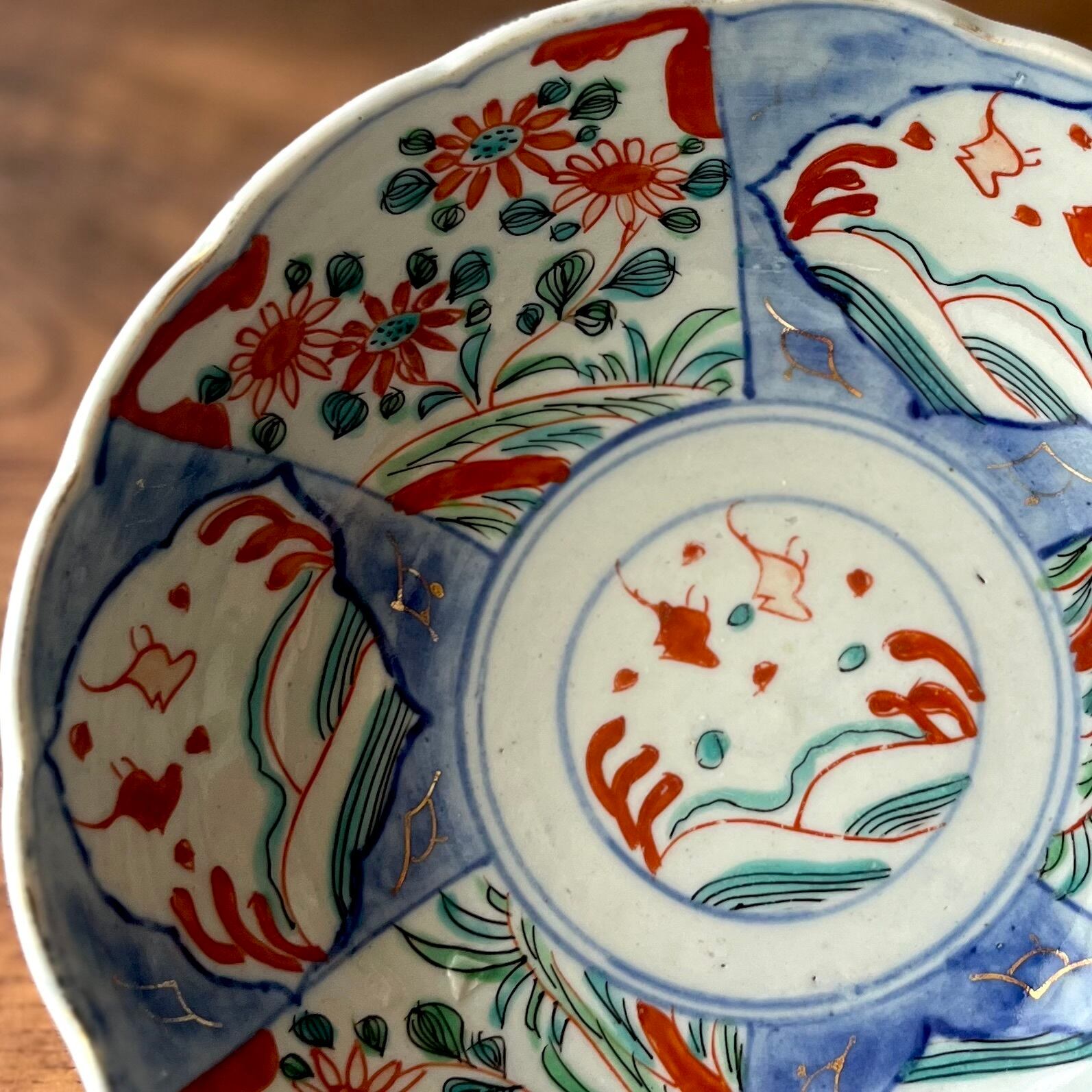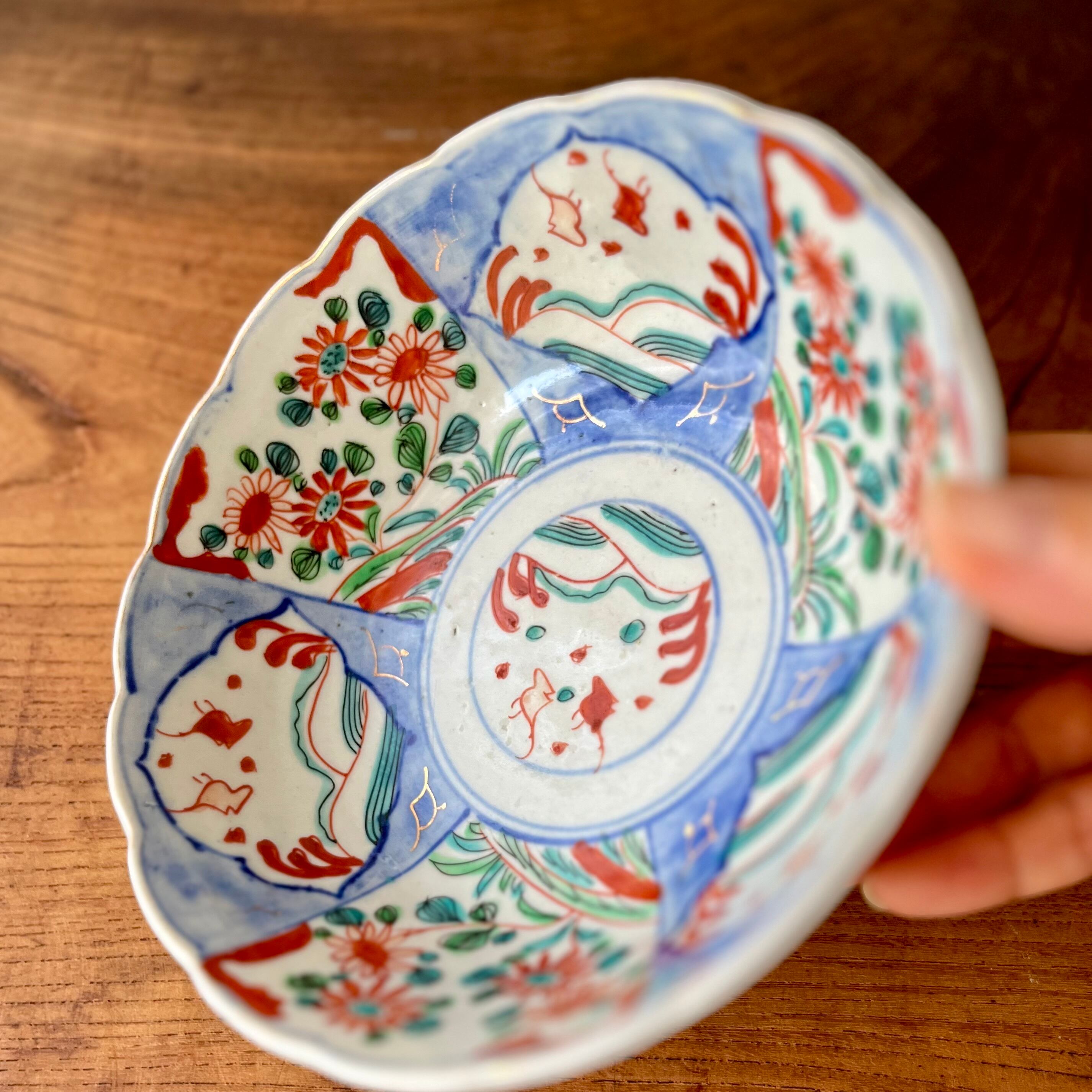 【《ホツあり》色絵6.5寸鉢 金彩 波に千鳥 窓絵 輪花型◆明治後期から大正】