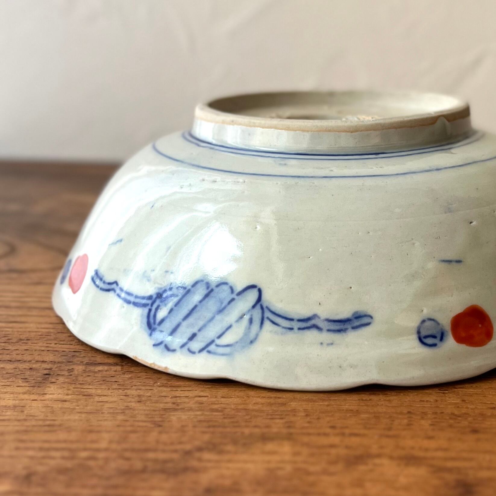 【ホツあり】色絵6.5寸鉢 金彩 波に千鳥 窓絵 輪花型◆明治後期から大正