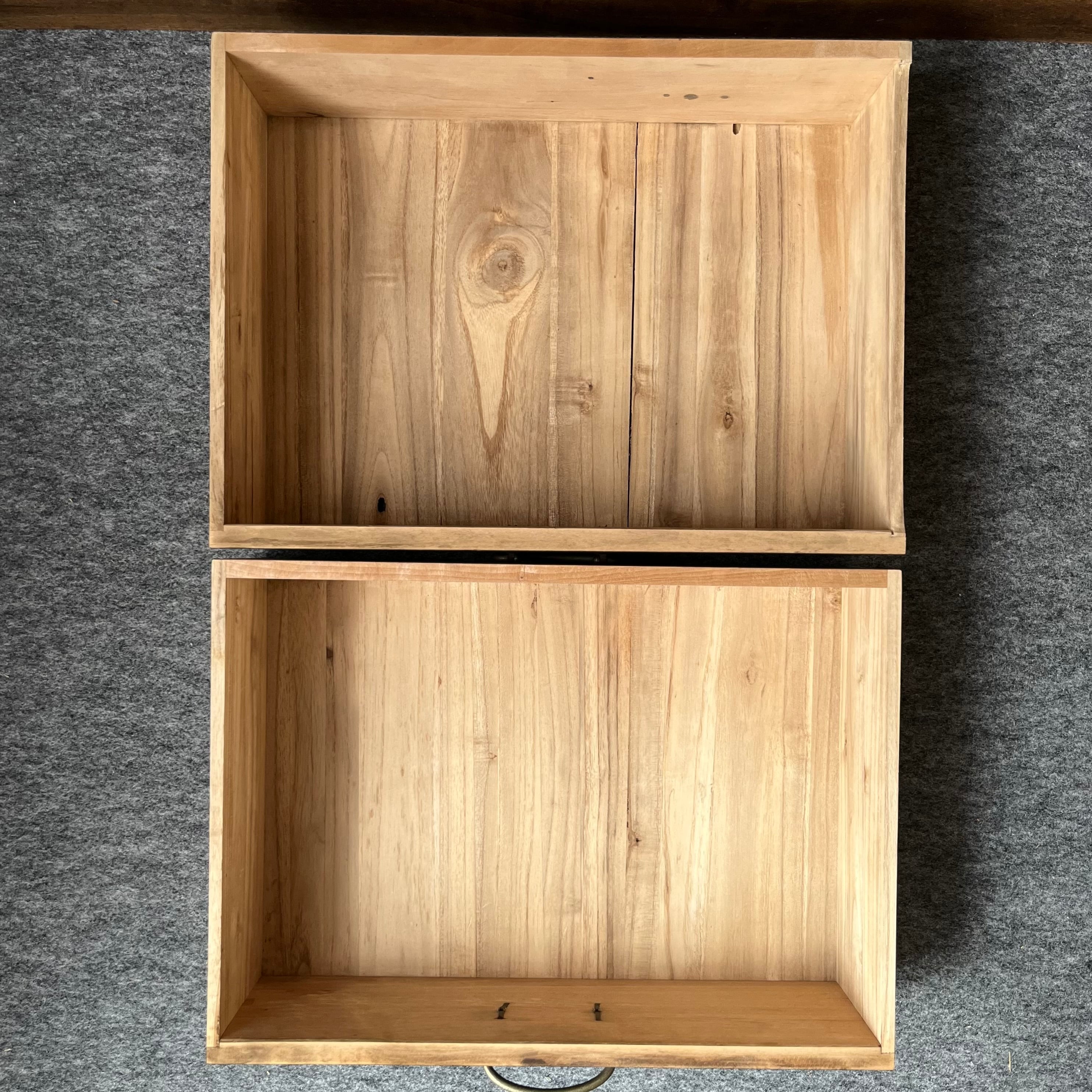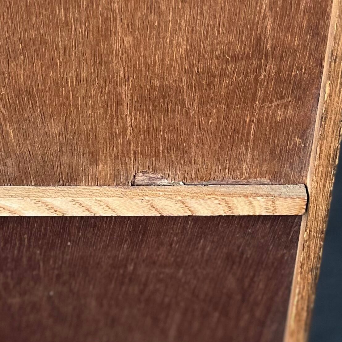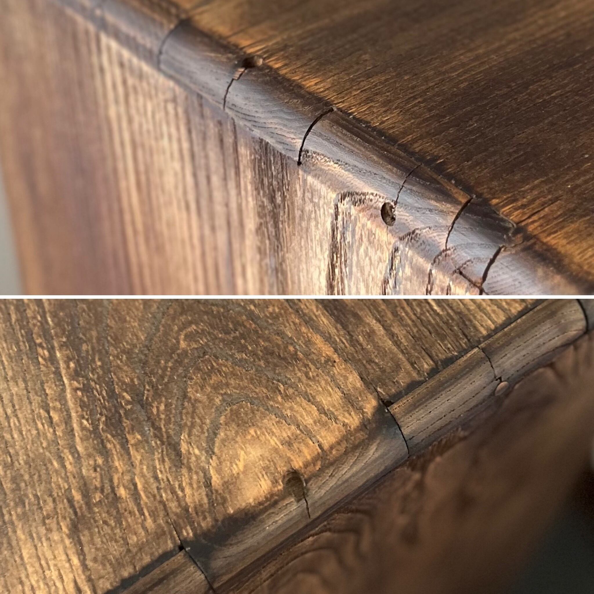 ・天板の左右3ヶ所に部品(ホゾ)が取れてしまっている箇所がございます。使用に問題はありません。(画像17枚目)