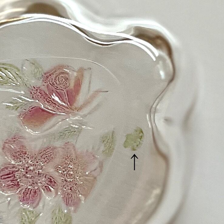 ・底の裏側から花模様が型押しされています。花模様に付けられた染料の色移りが見られる箇所がございます。(画像14、15枚目)