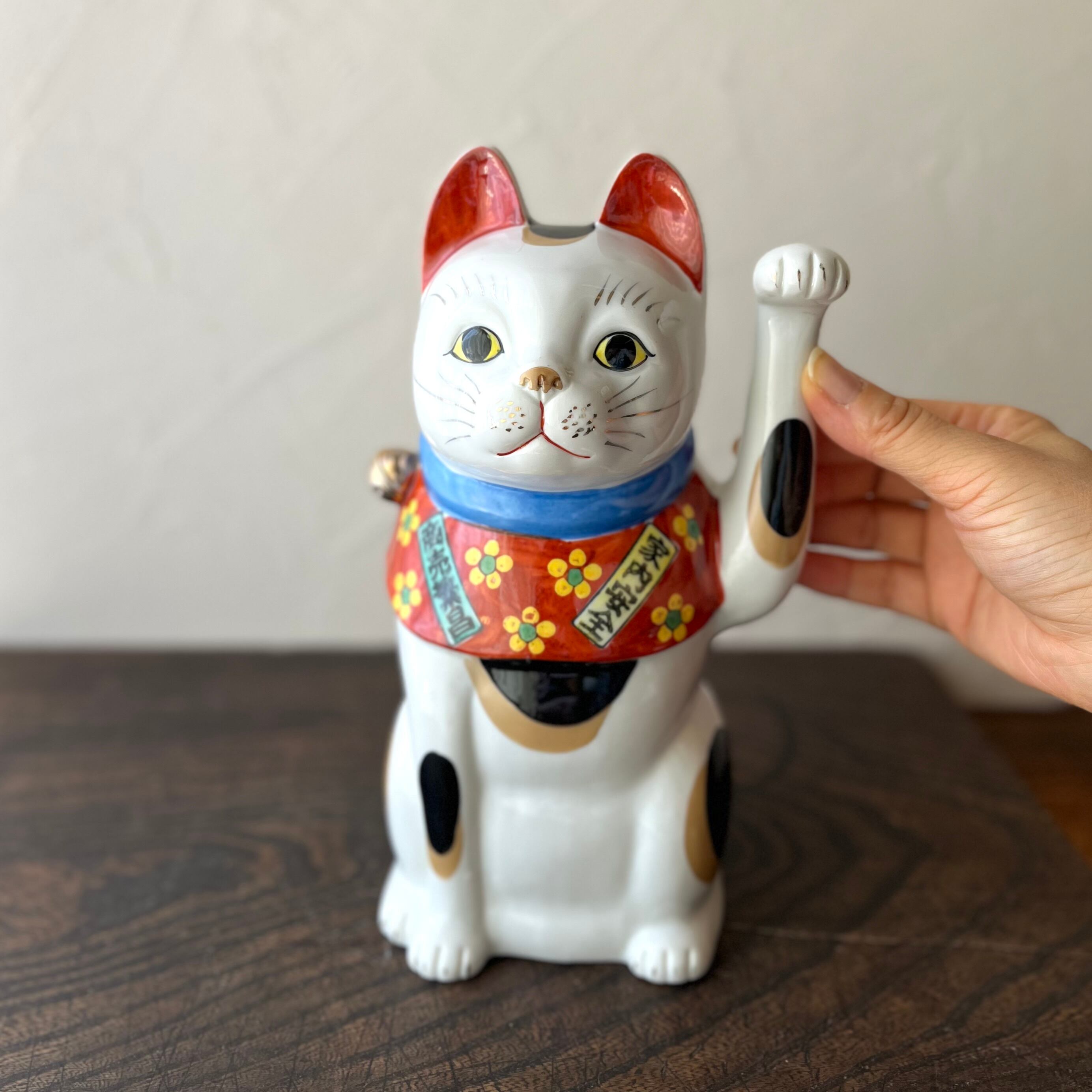 人招きの左手を高く上げています。