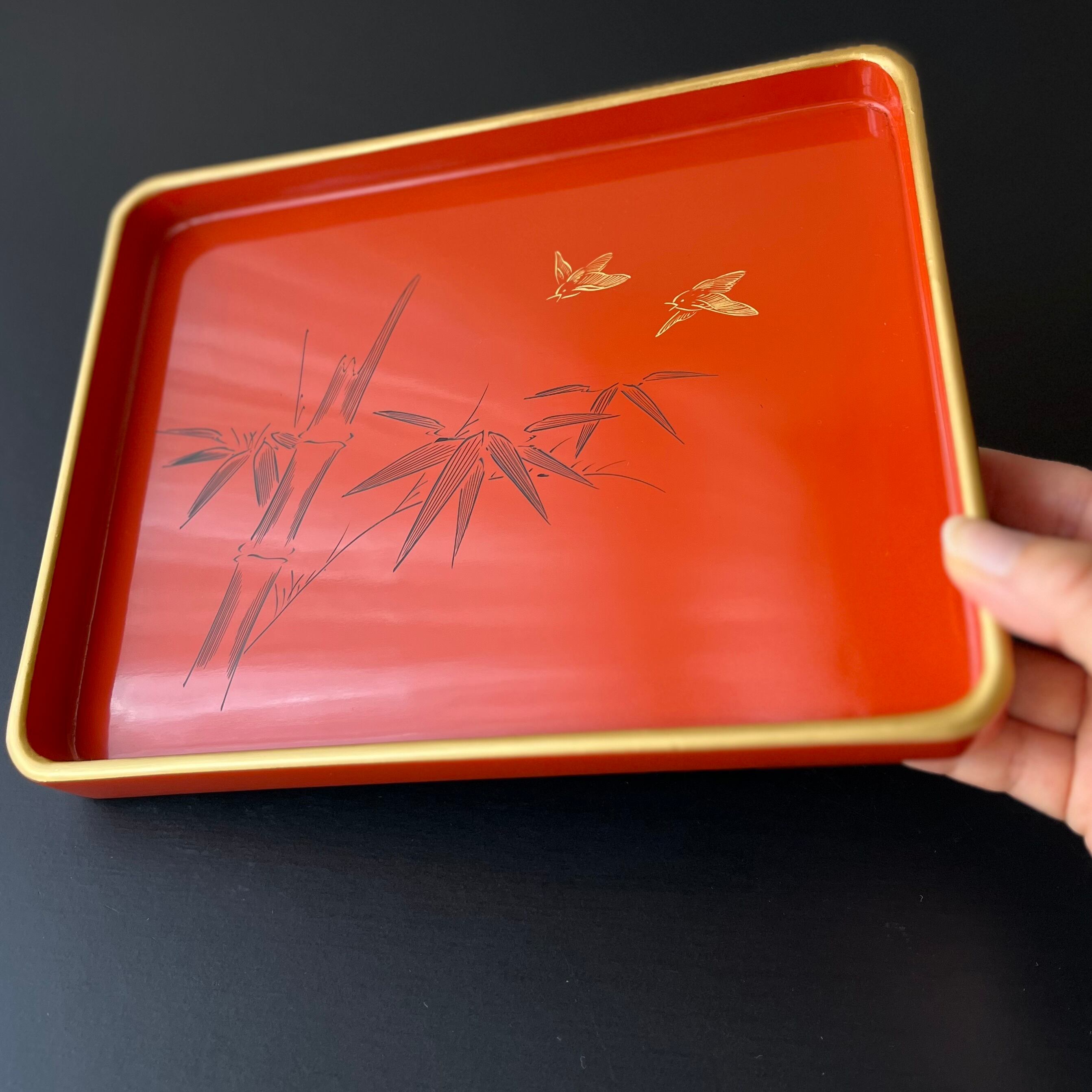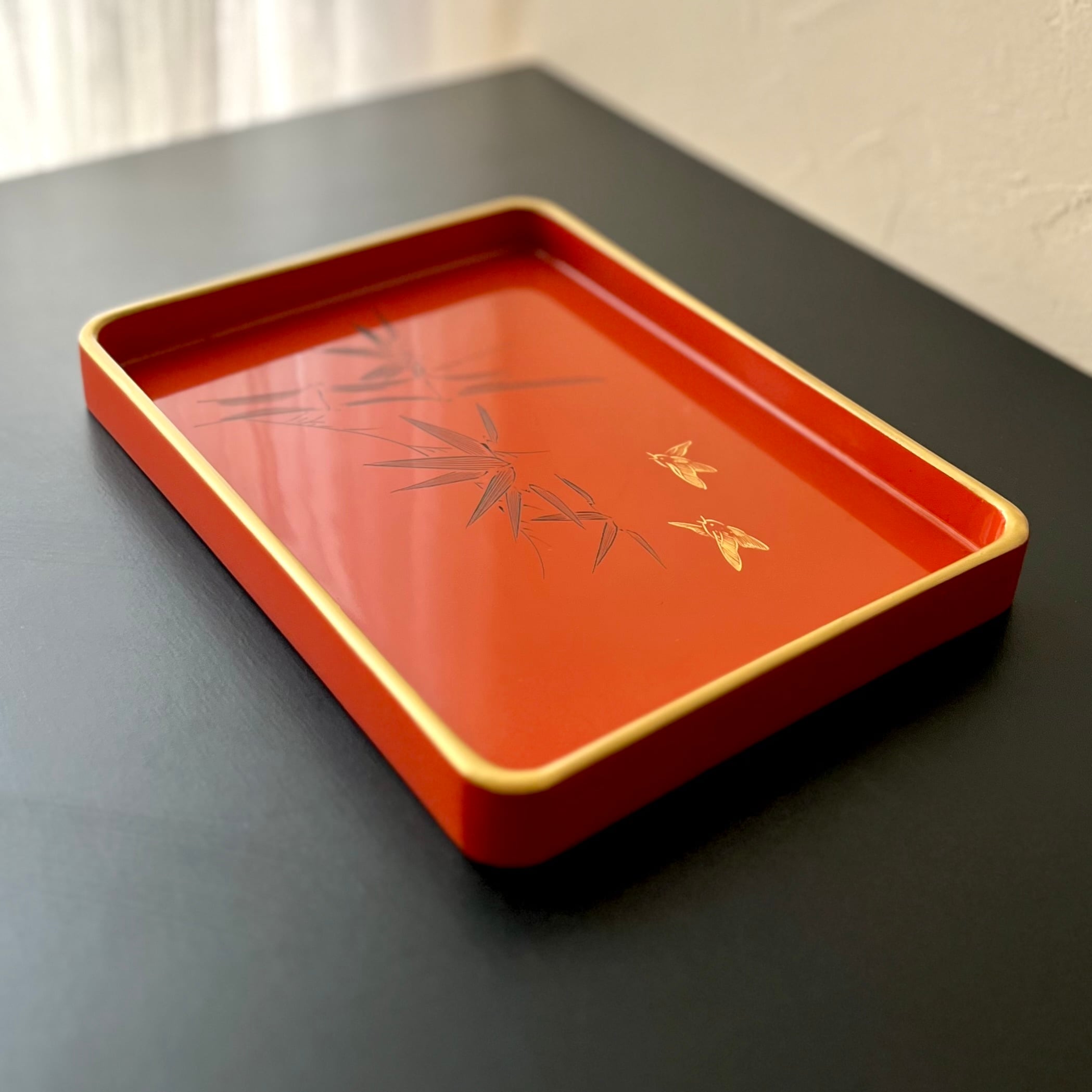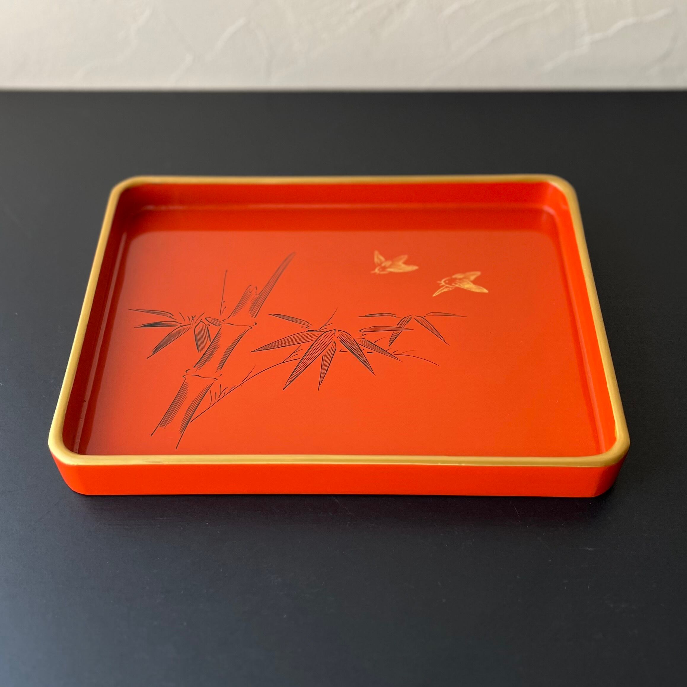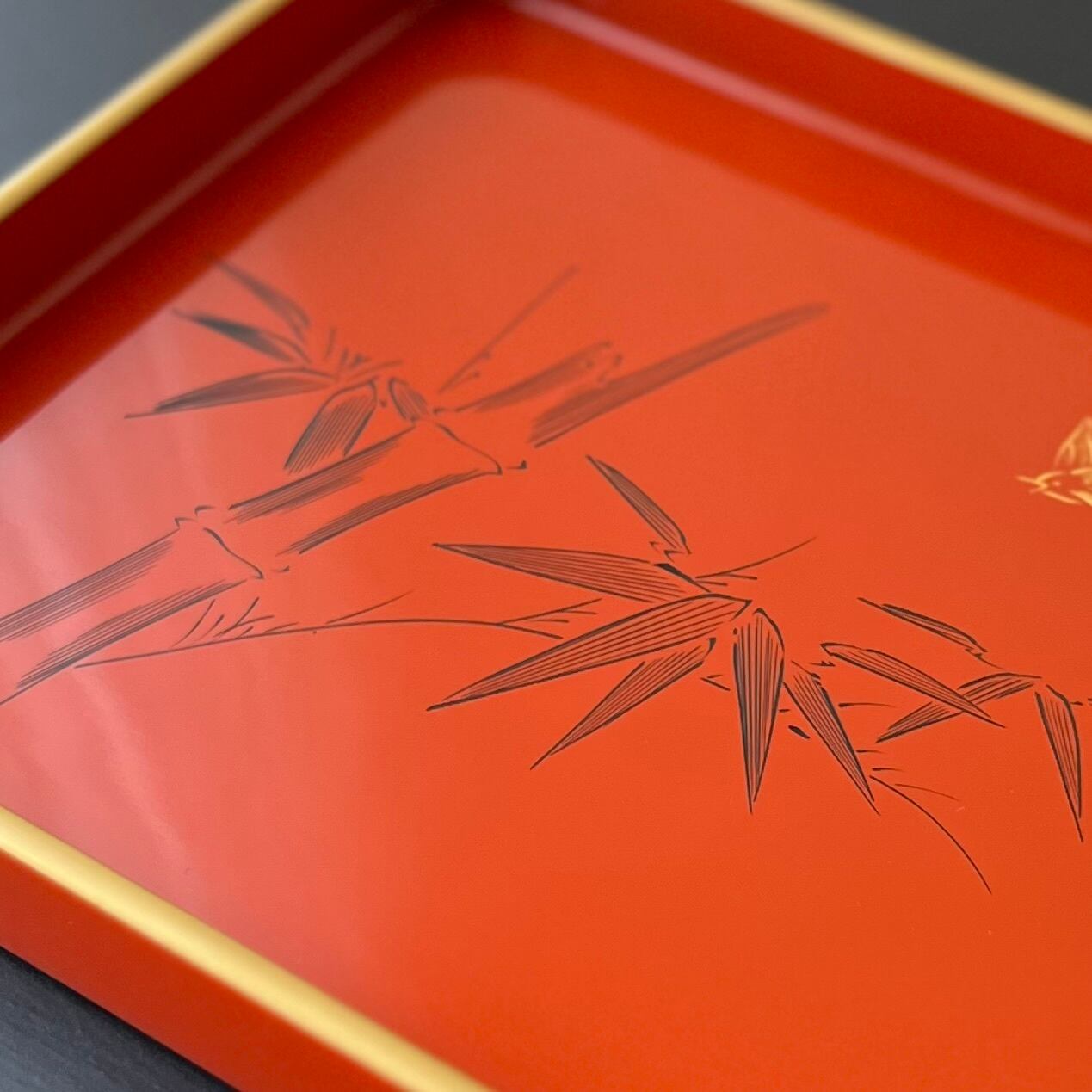 【朱漆 沈金 盆 膳 漆器 竹に雀】
