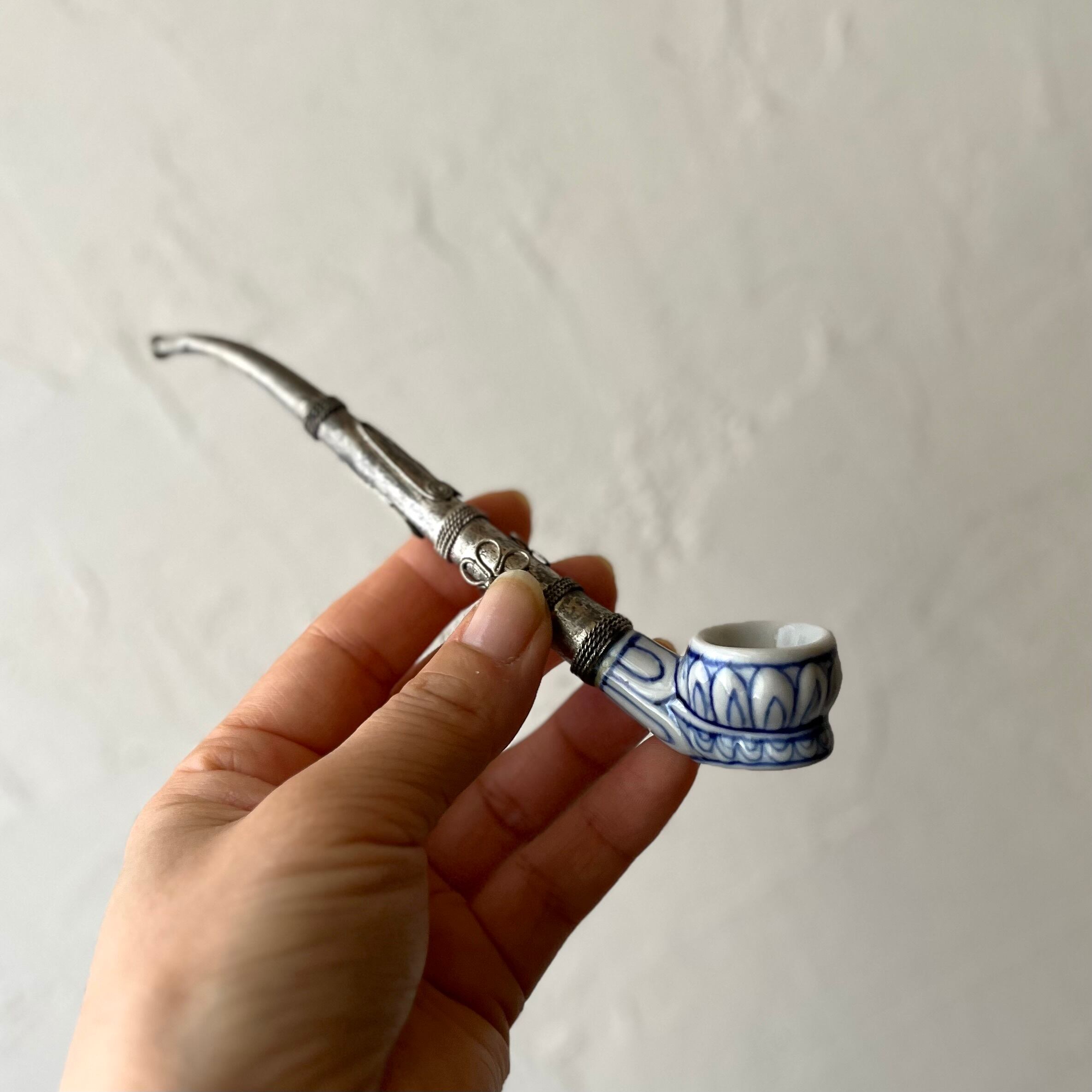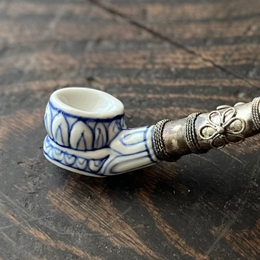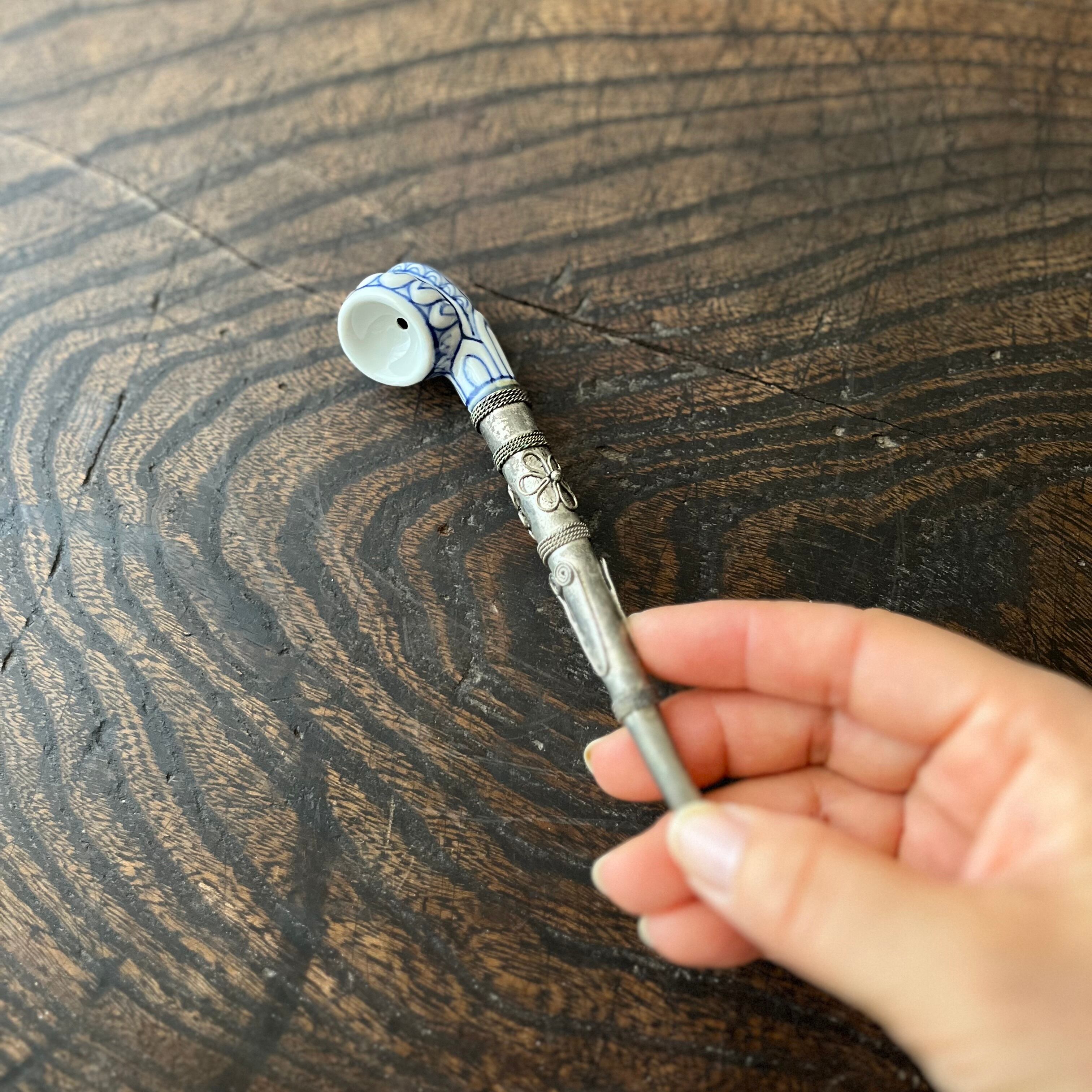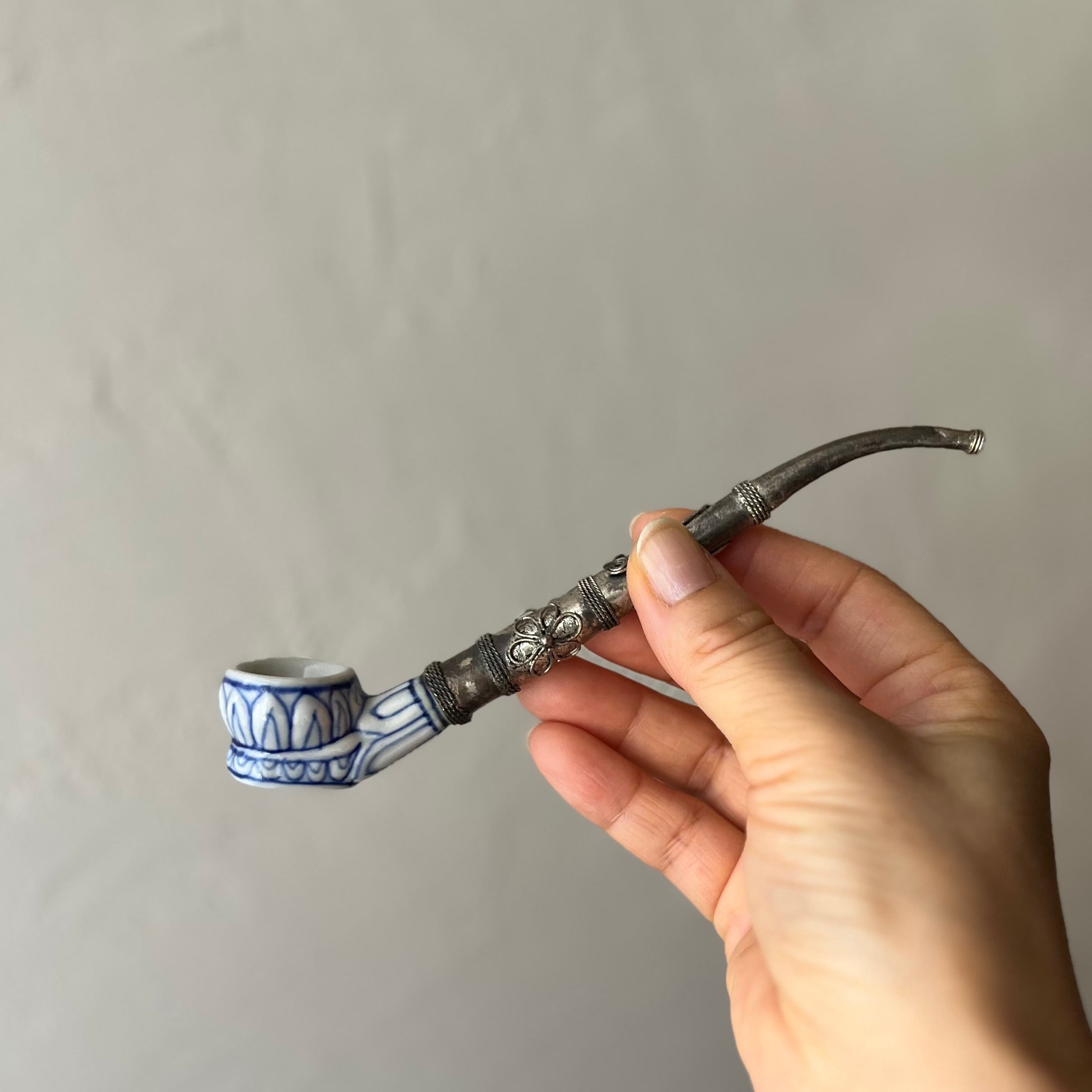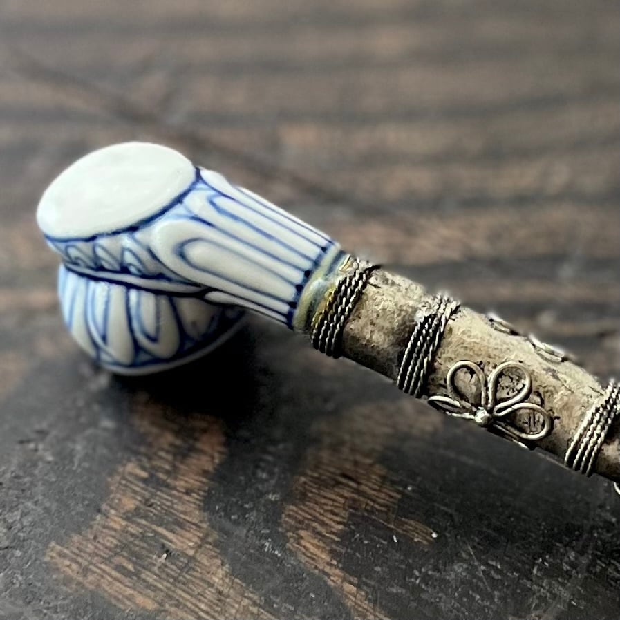 キセル 時代物 陶磁器 染付 金属製花のモチーフ