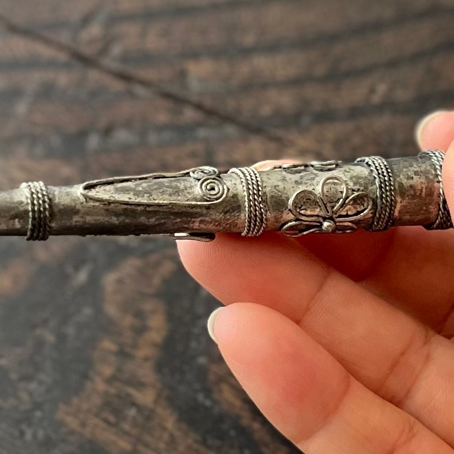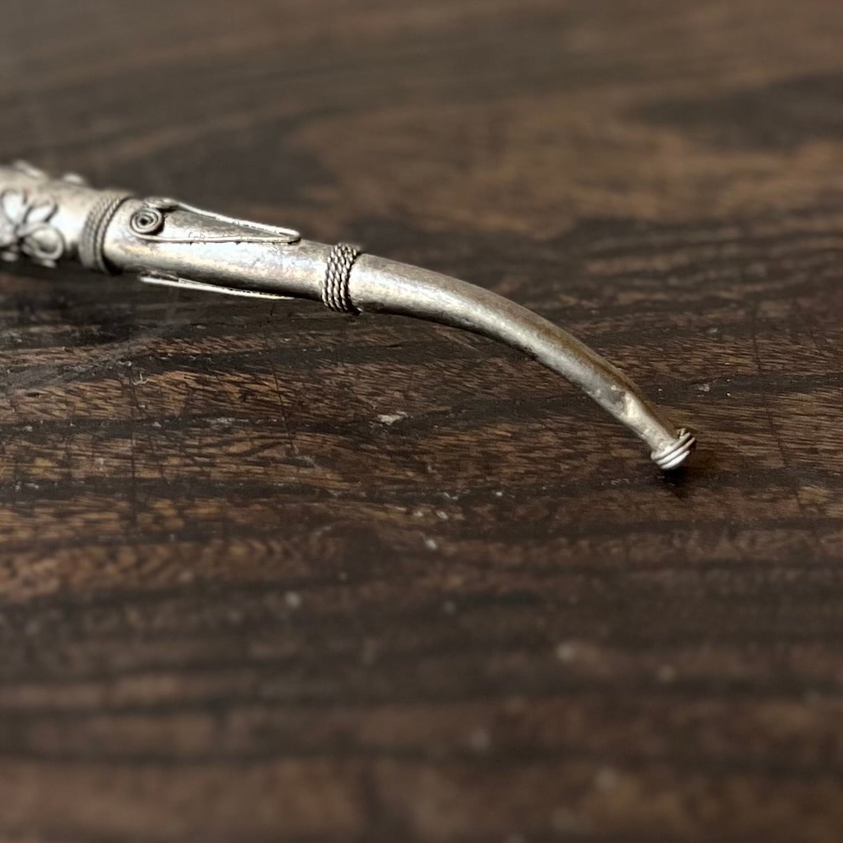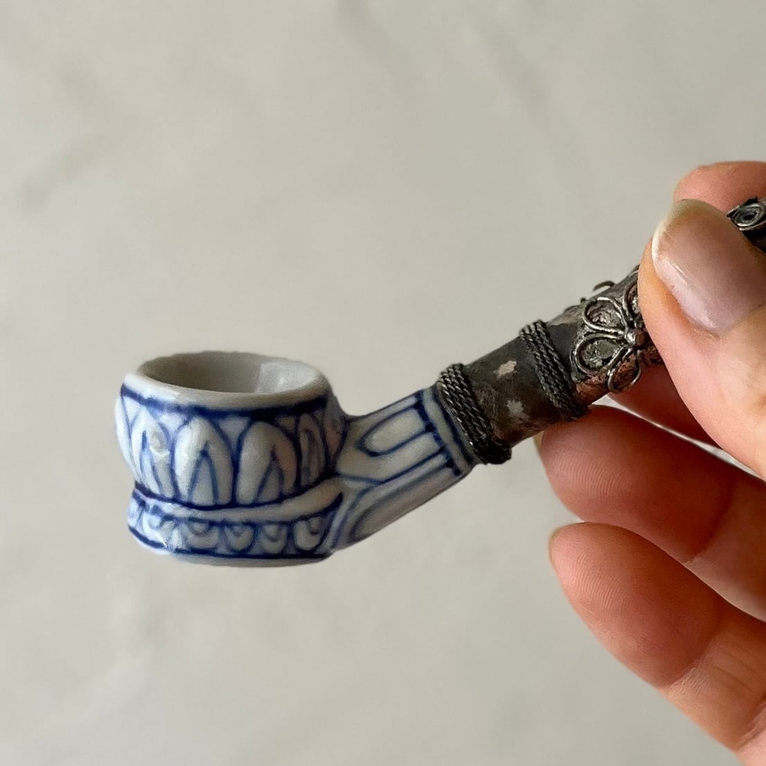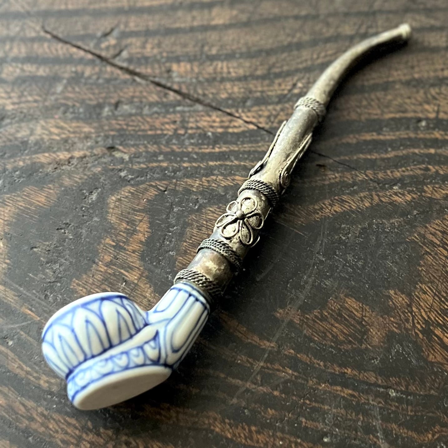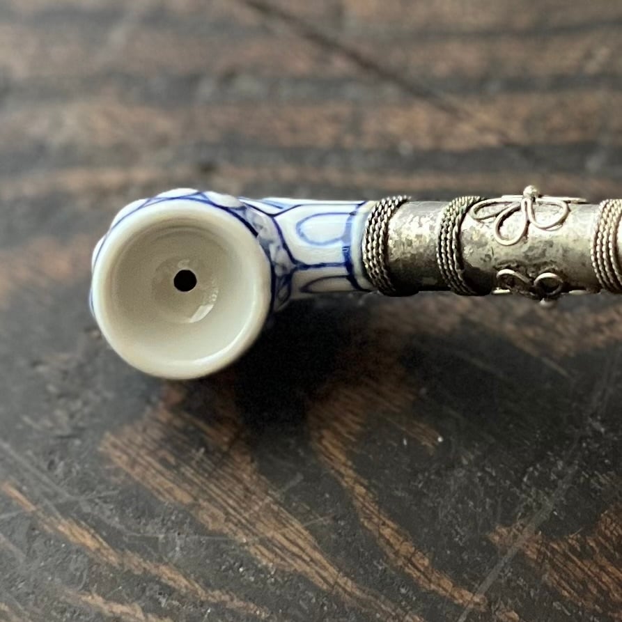 キセル 時代物 陶磁器 染付 金属製花のモチーフ
