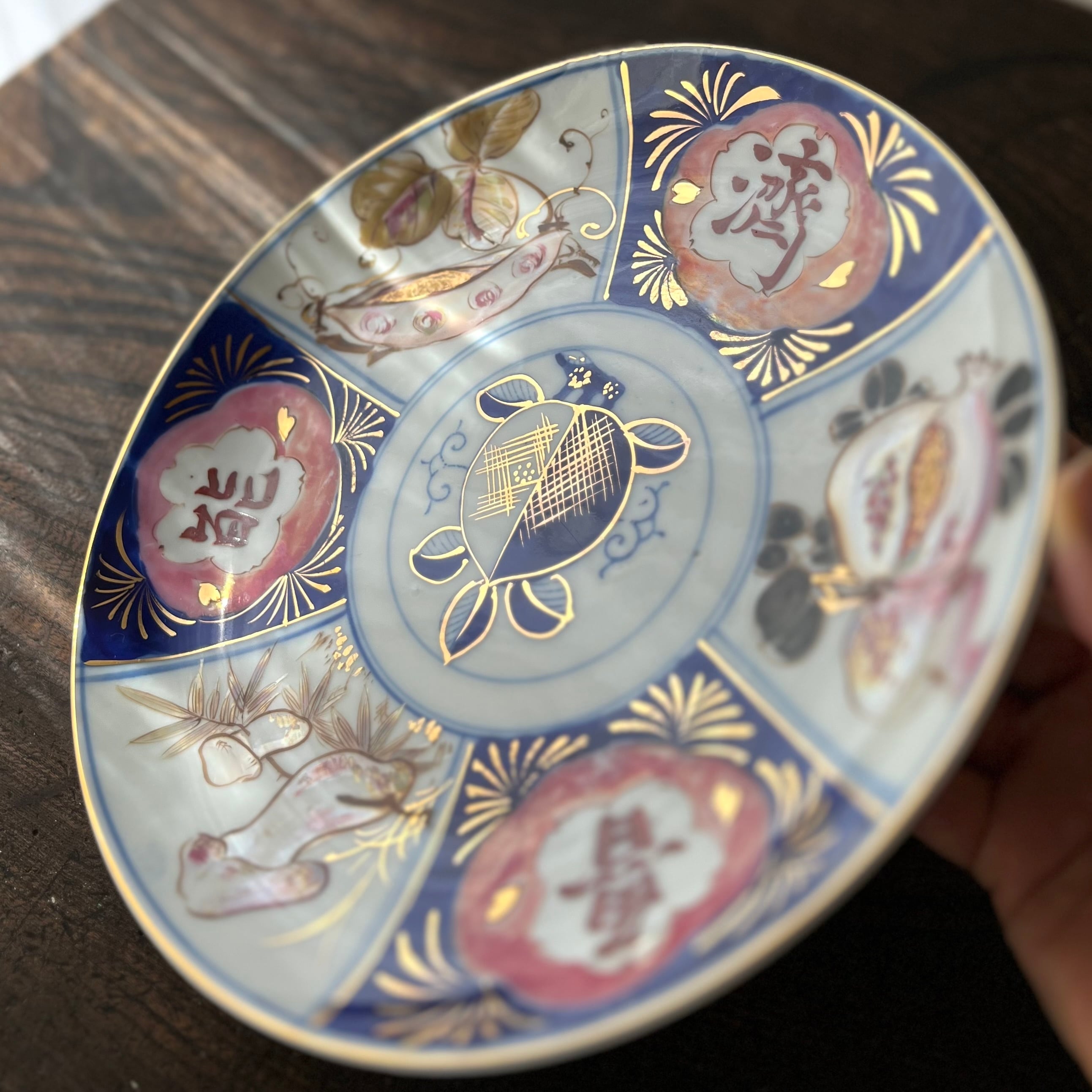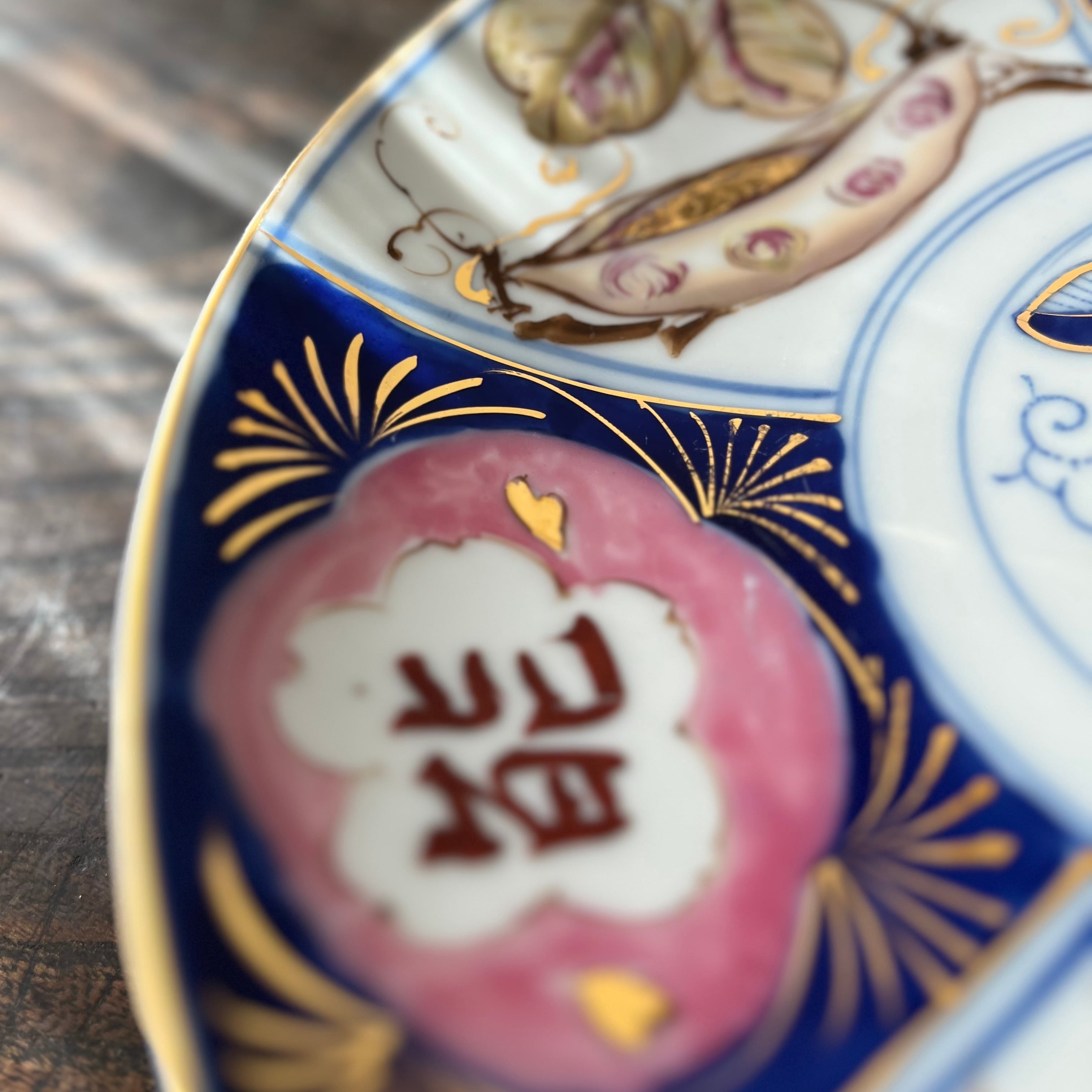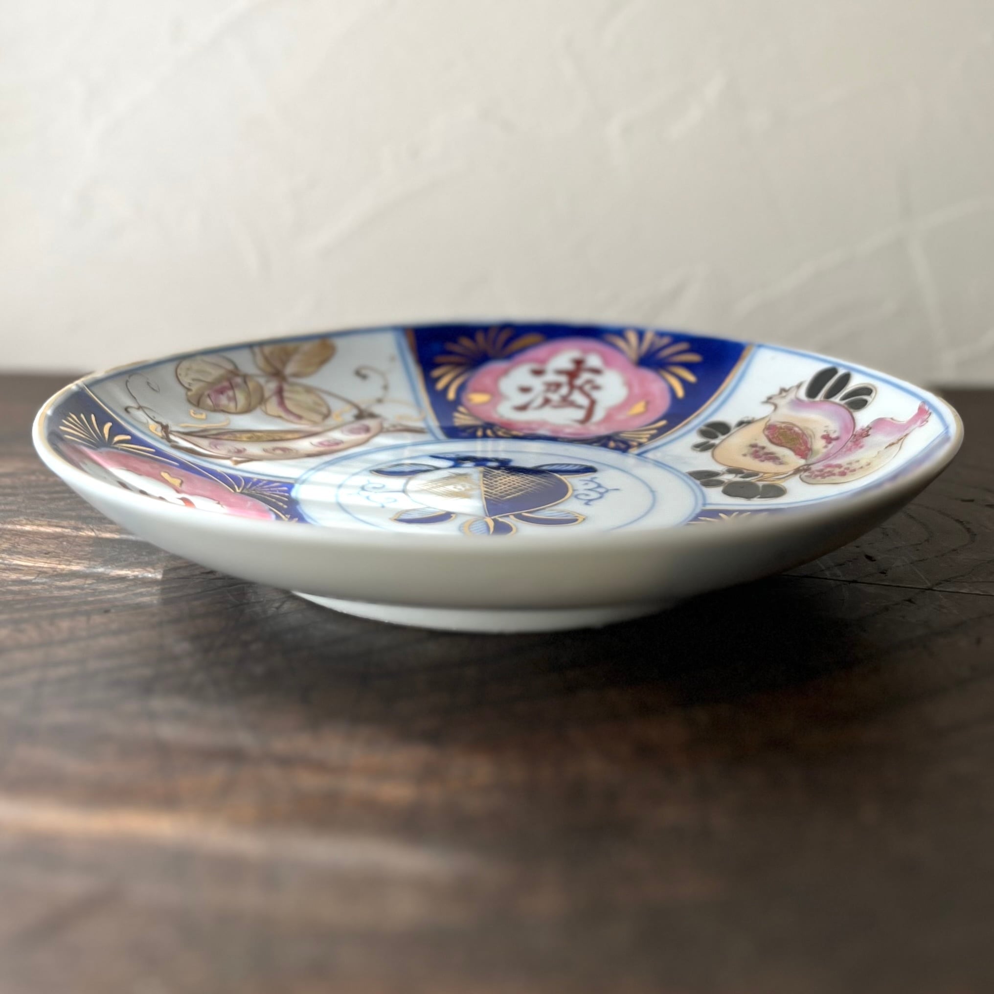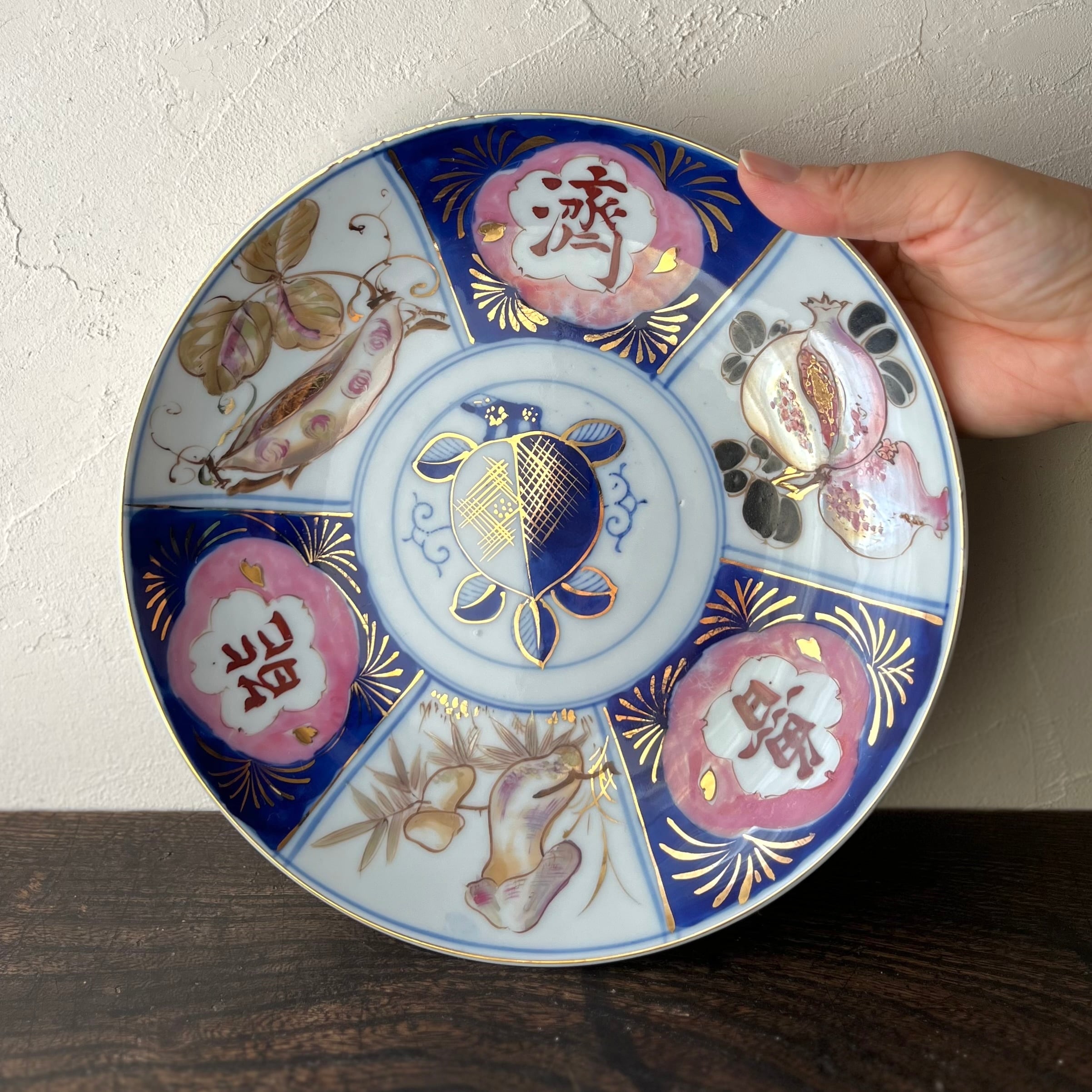 【色絵金彩8寸皿 桃 柘榴 蛤 松茸◆明治期 オトナな絵皿】
