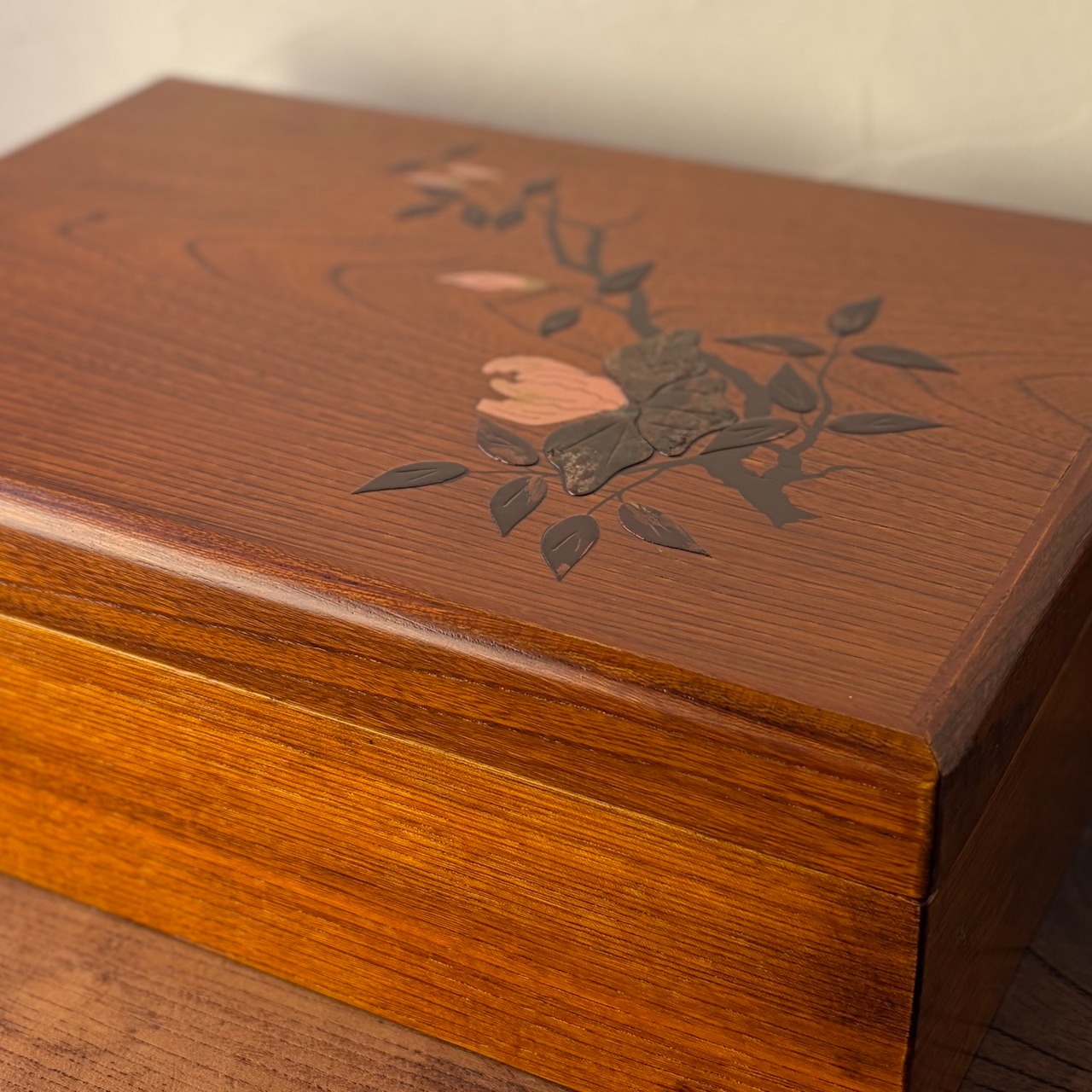 桜皮細工で木蓮があしらわれた木箱。