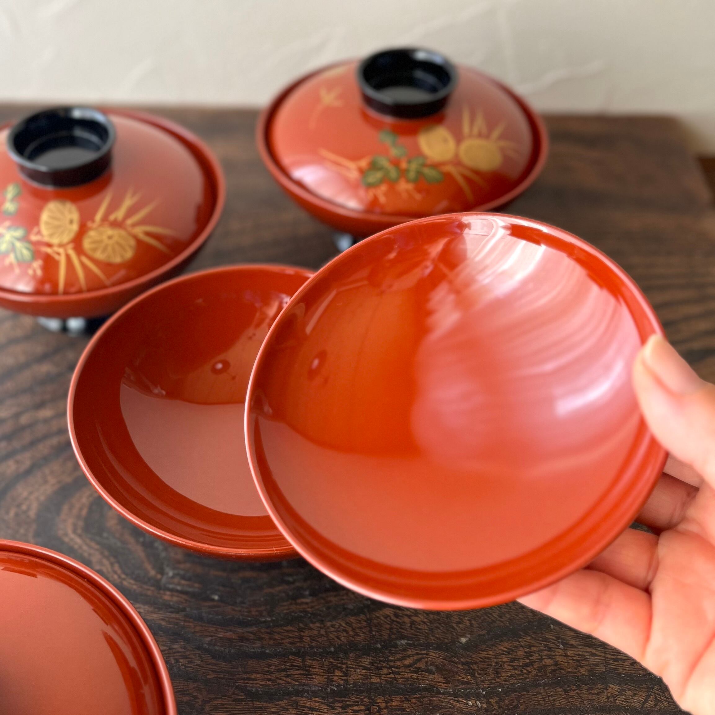 【お値引き】朱漆の蓋付き汁物椀 1客 蒔絵 菊と松竹梅 木製品