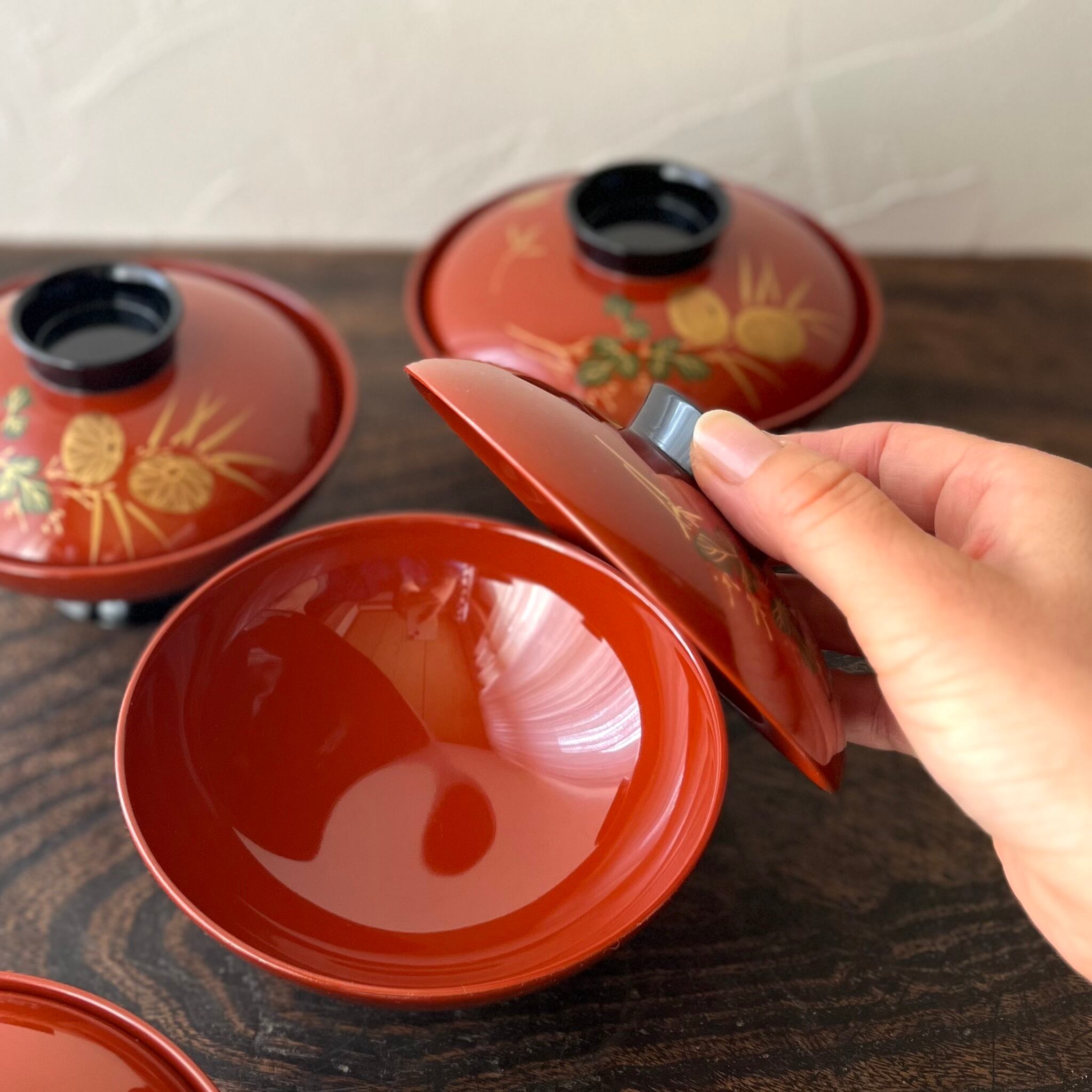 【朱漆の蓋付き汁物椀 1客 蒔絵 菊と松竹梅 木製品】