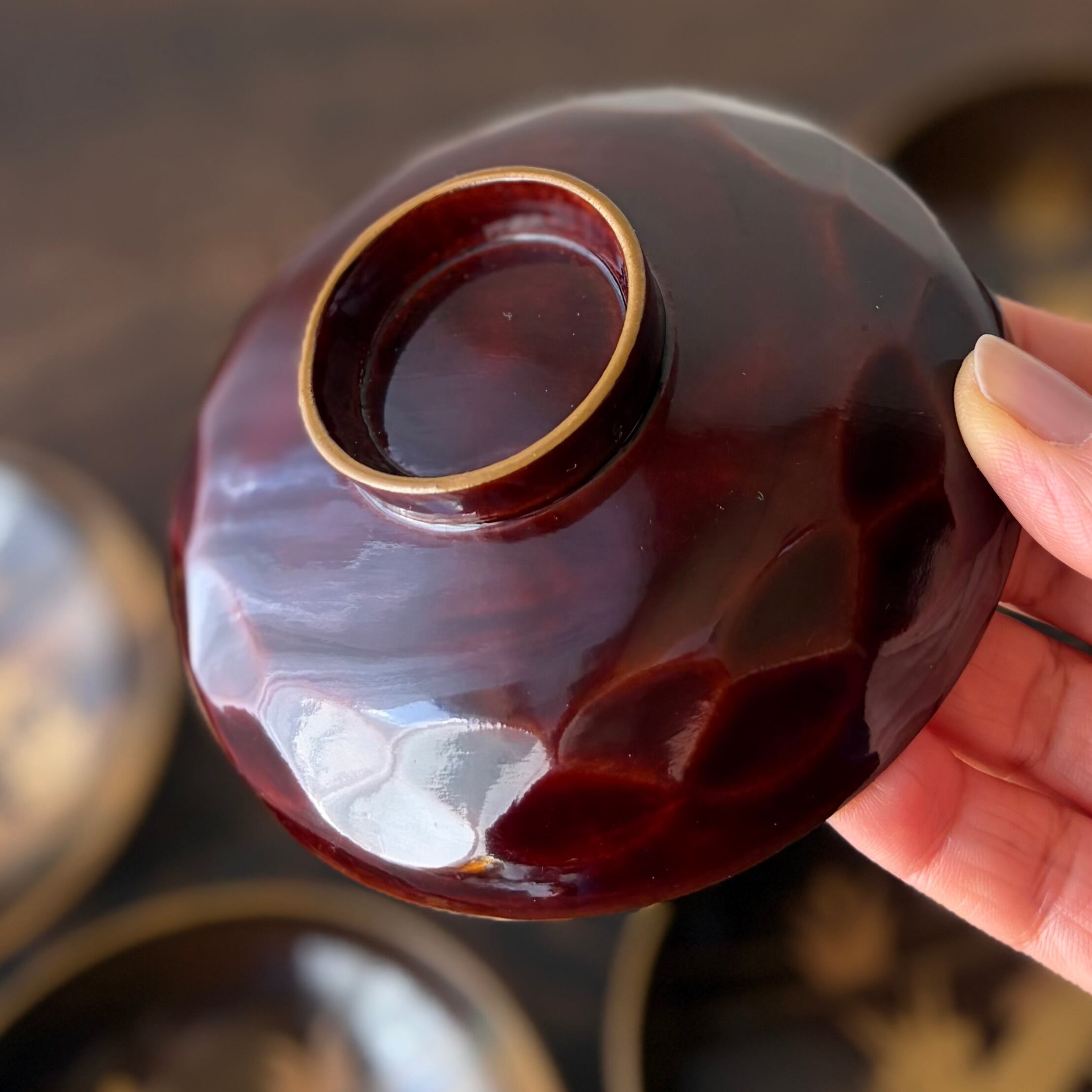・それぞれに僅かに歪みが生じております。お椀と蓋を合わせてみて相性の良いものを組み合わせてお届けいたします。それでも合わせる向きによってしっくりとこない場合がございます。お手数ですが、しっくりとくるところまで蓋の向きを変えてみてくださいますようお願いいたします。