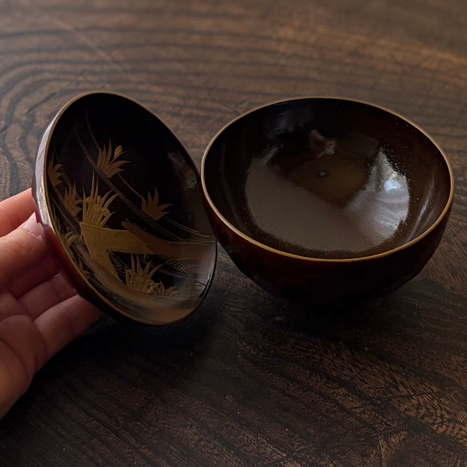蓋の内面に蒔絵が施された蓋付汁物椀。