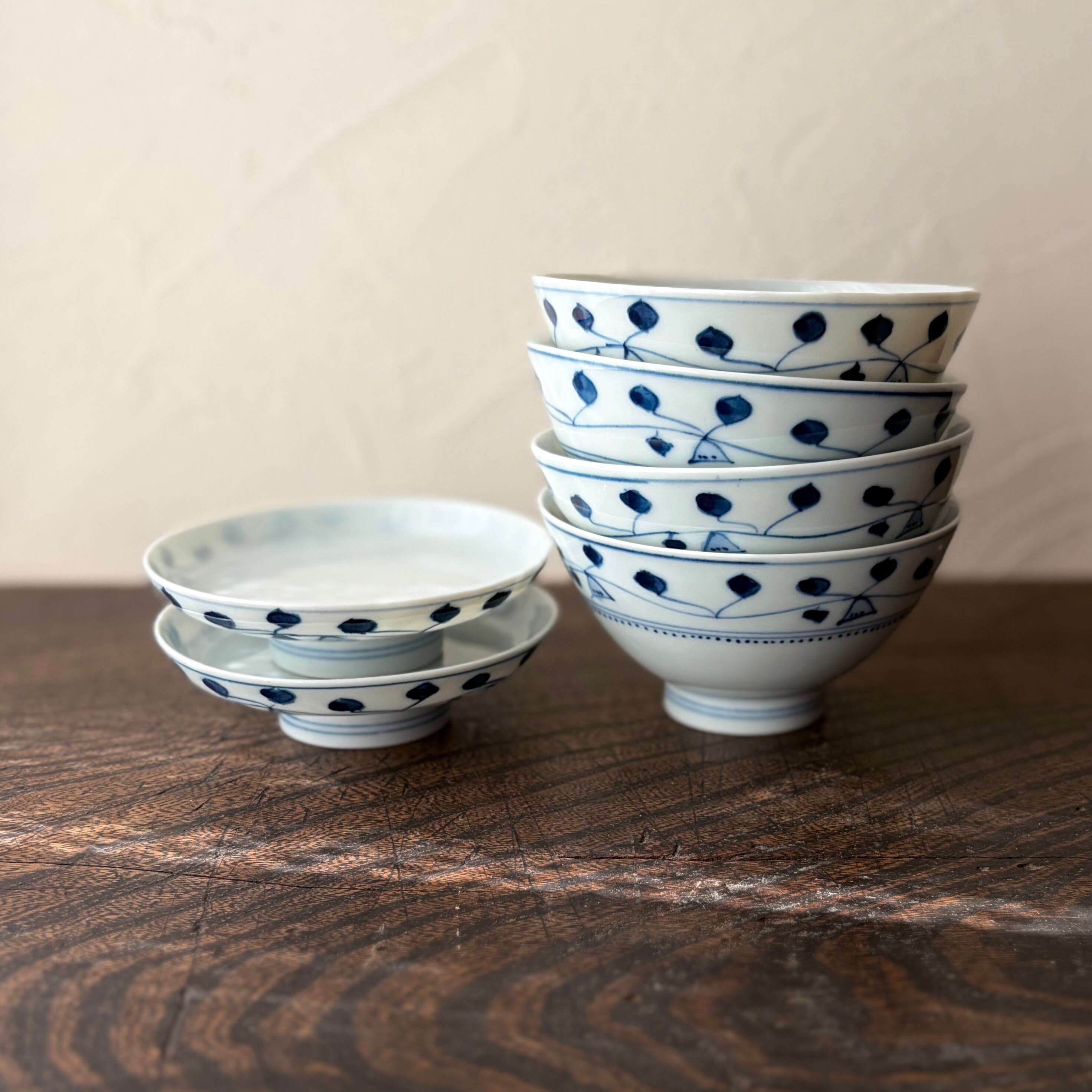 爽やかな藍色でリーフが描かれた飯茶碗セット。