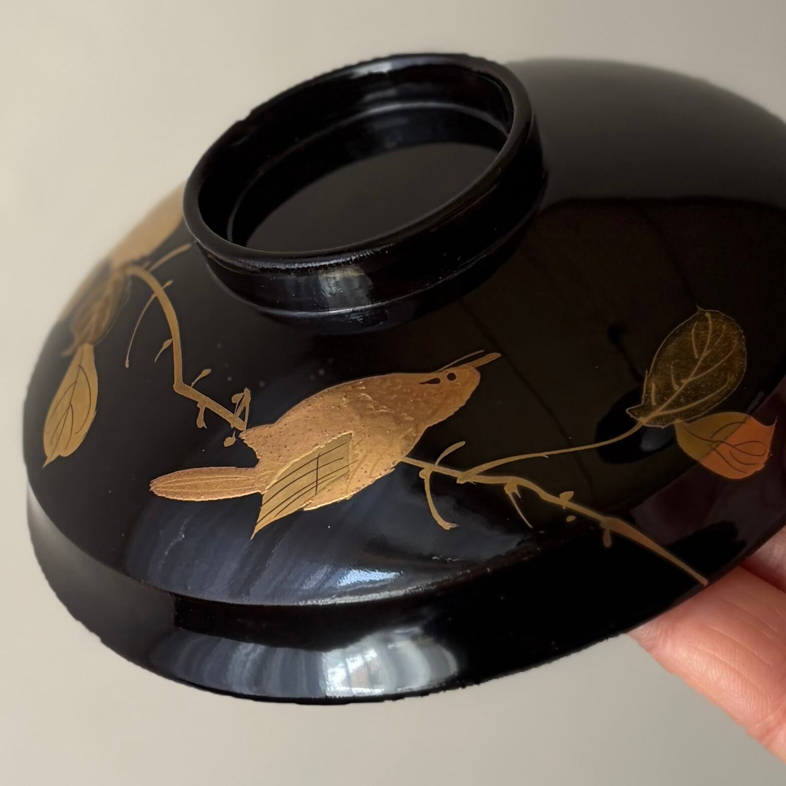 蓋に花鳥図の蒔絵が施された蓋付汁物椀。