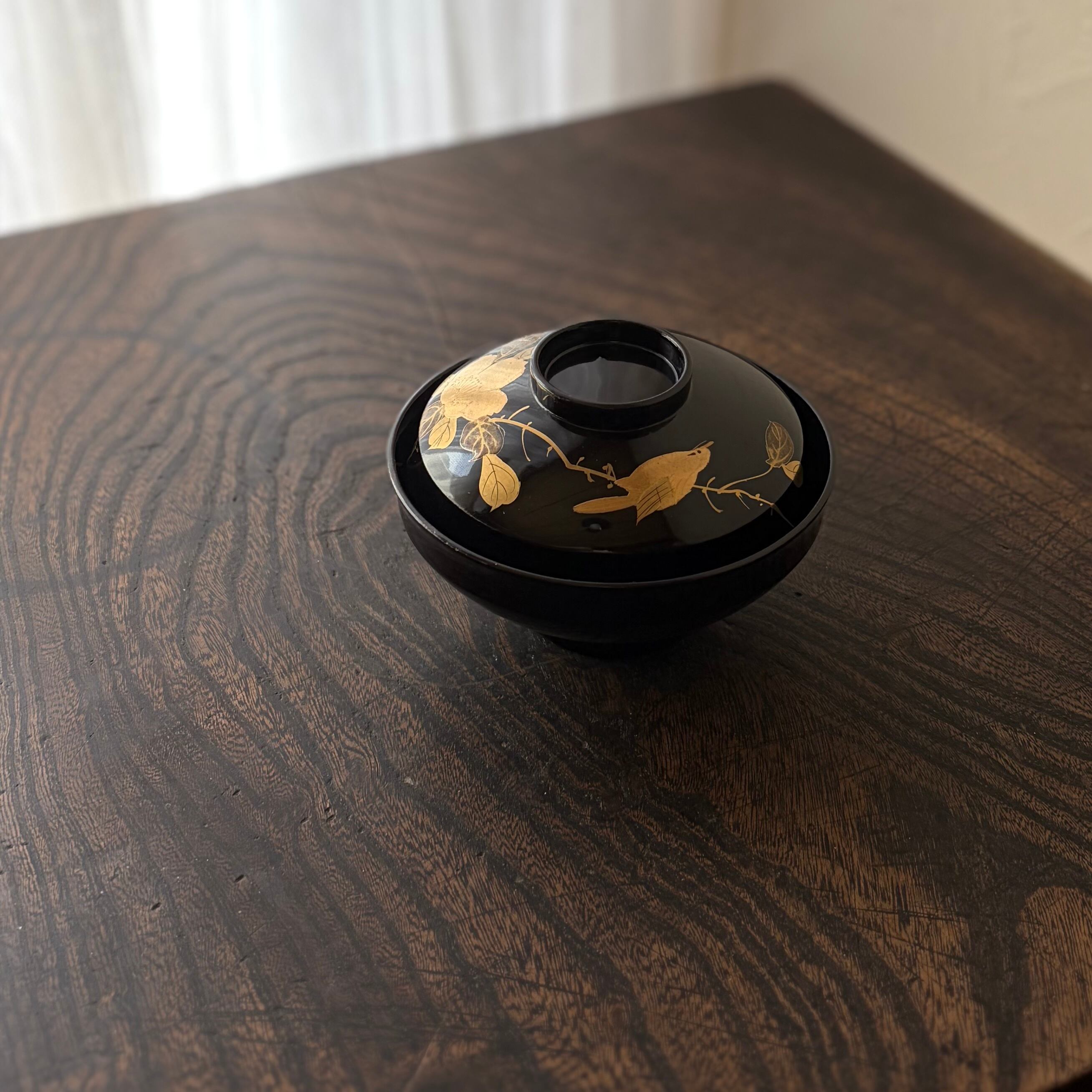 漆器 蓋付汁物椀 花鳥図蒔絵◆昭和初期