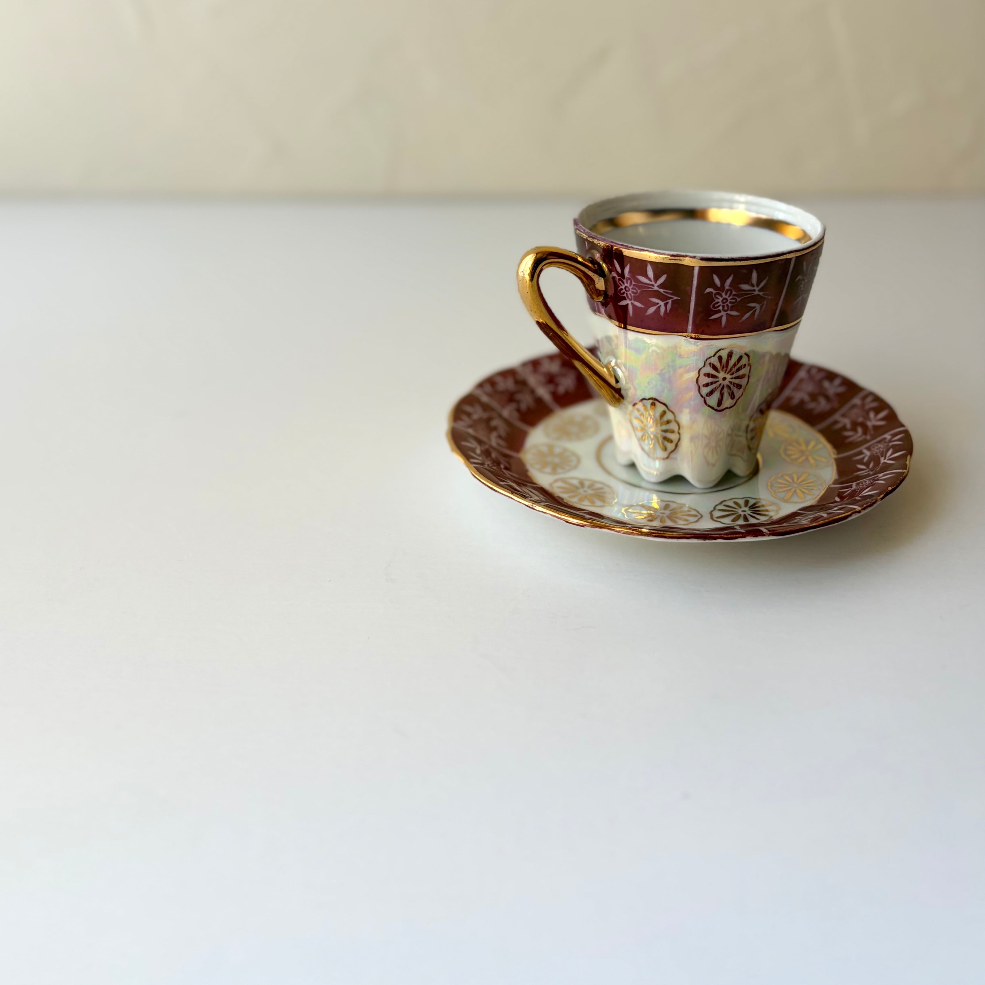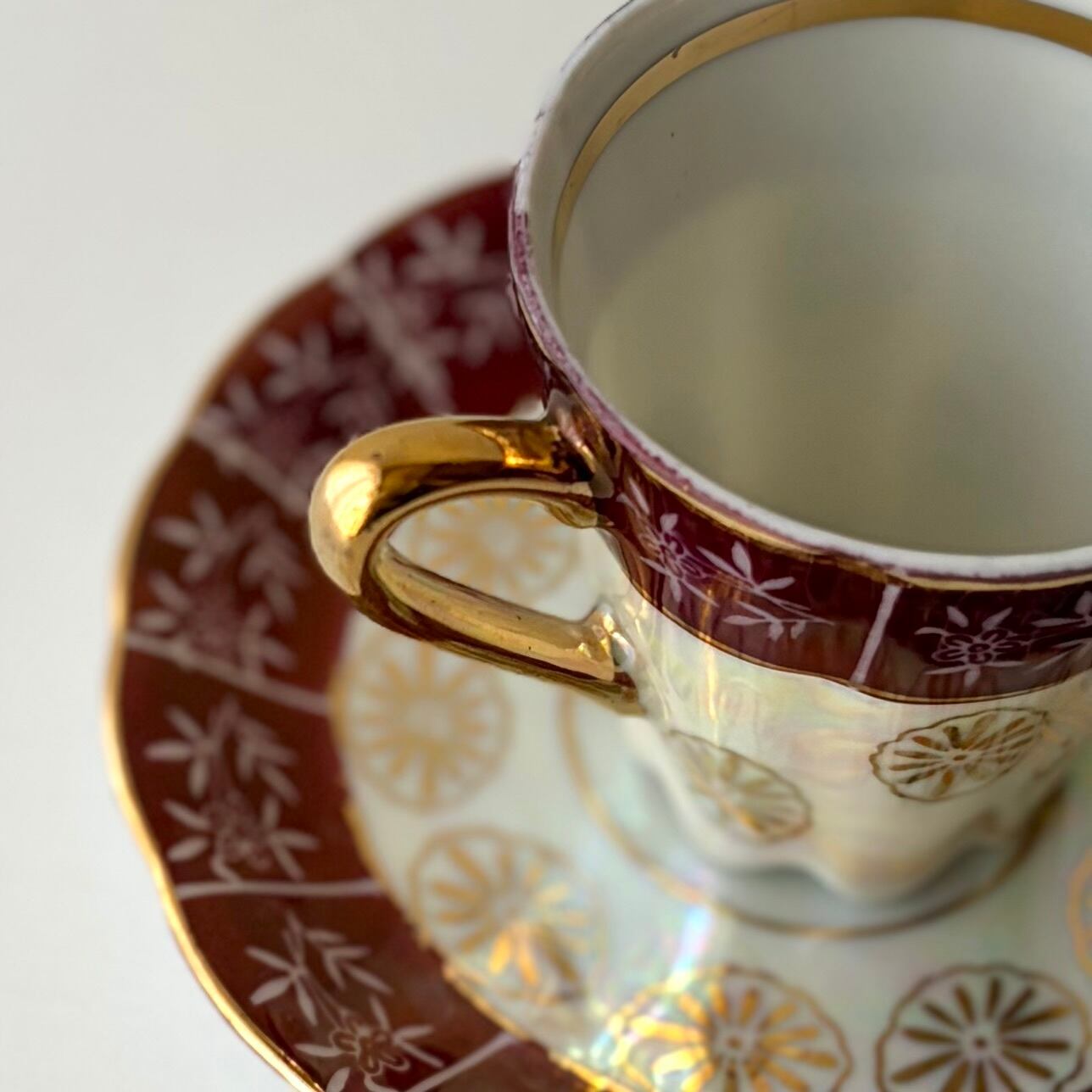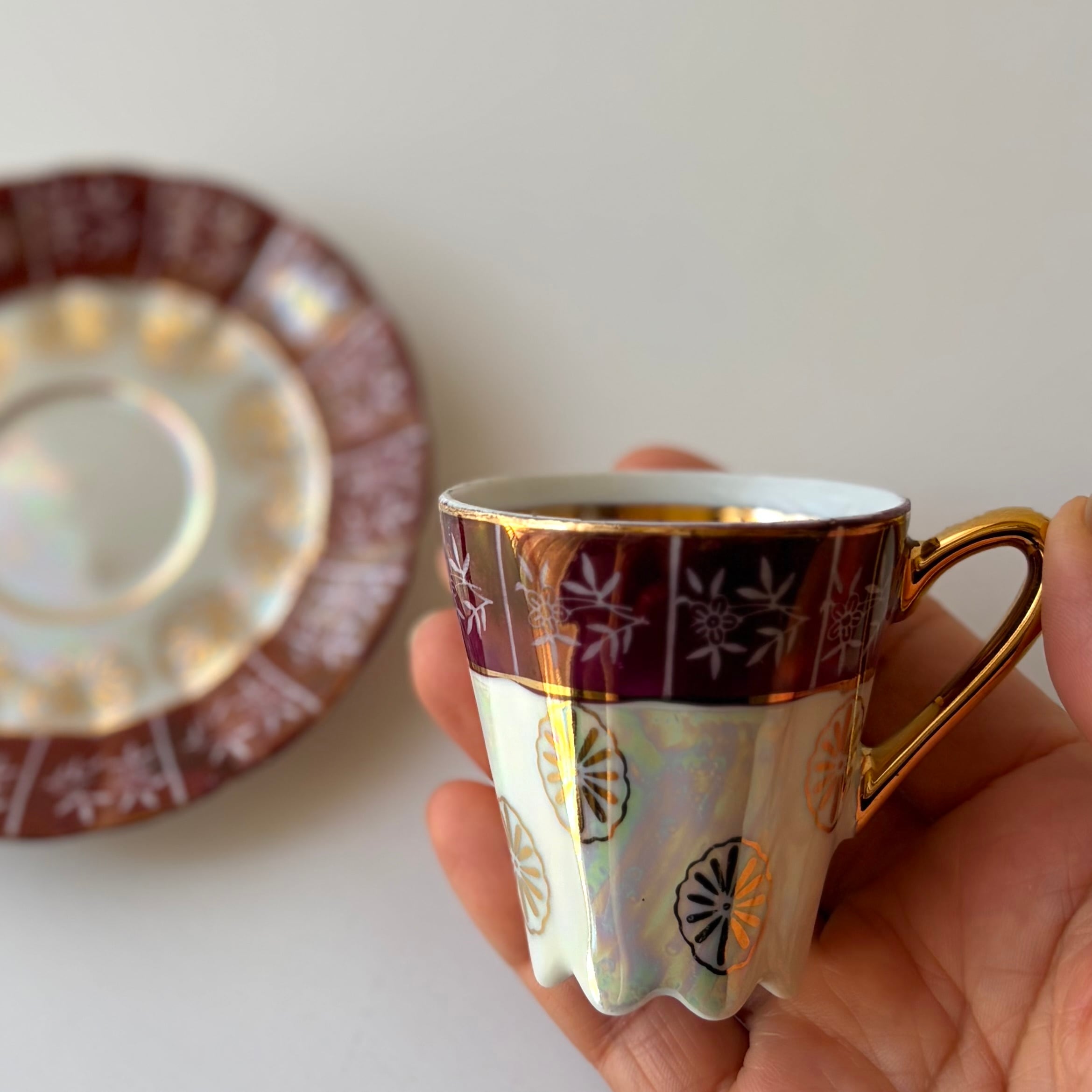 ラスター彩◆デミタスカップ ビンテージ 金彩 ワインレッド フリル