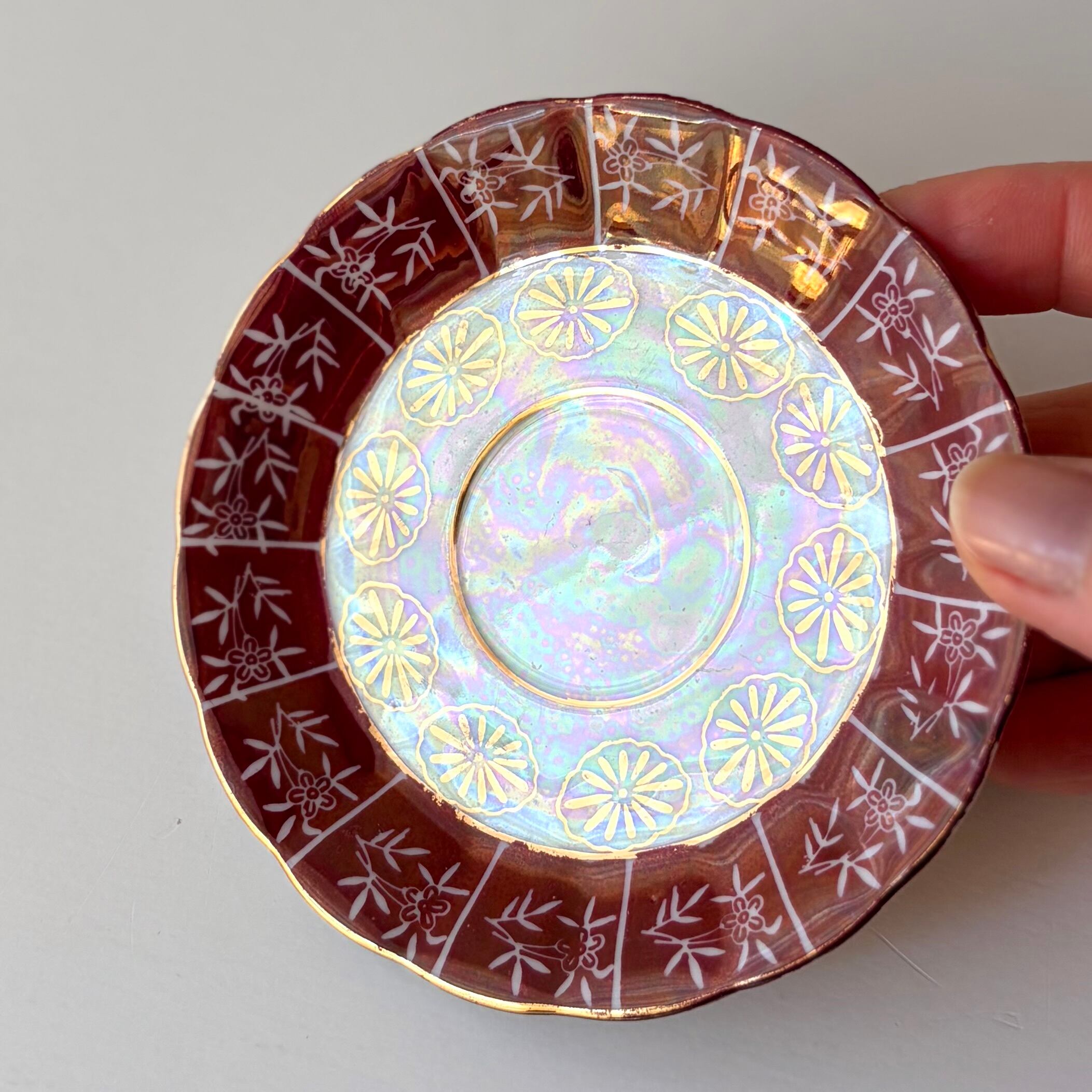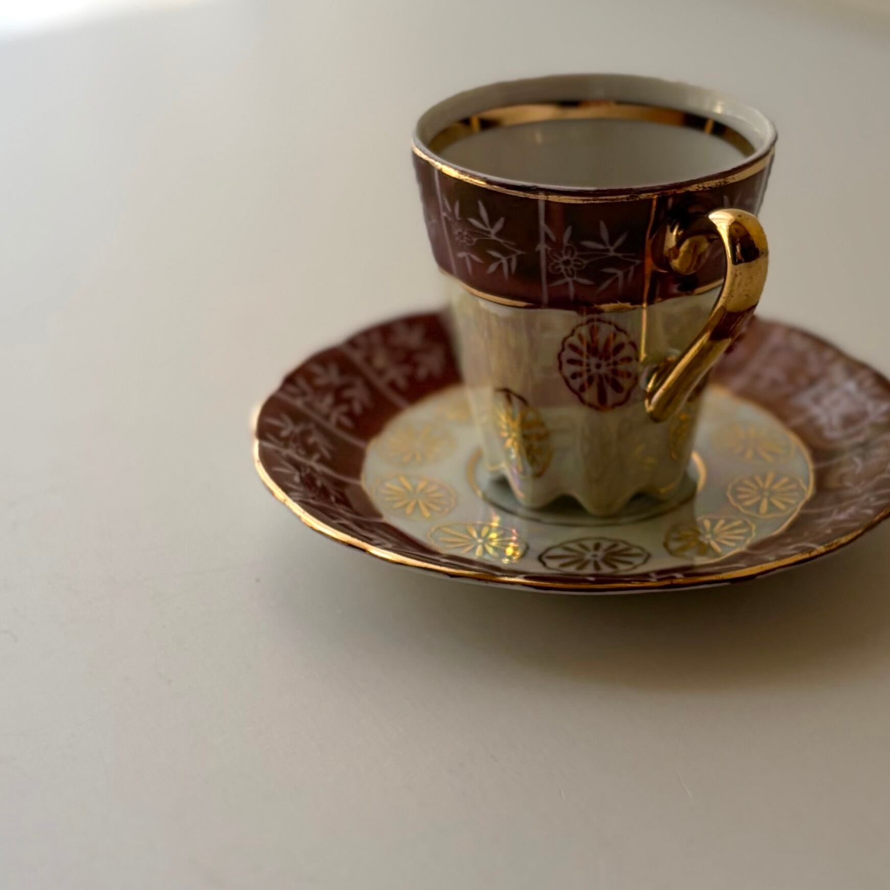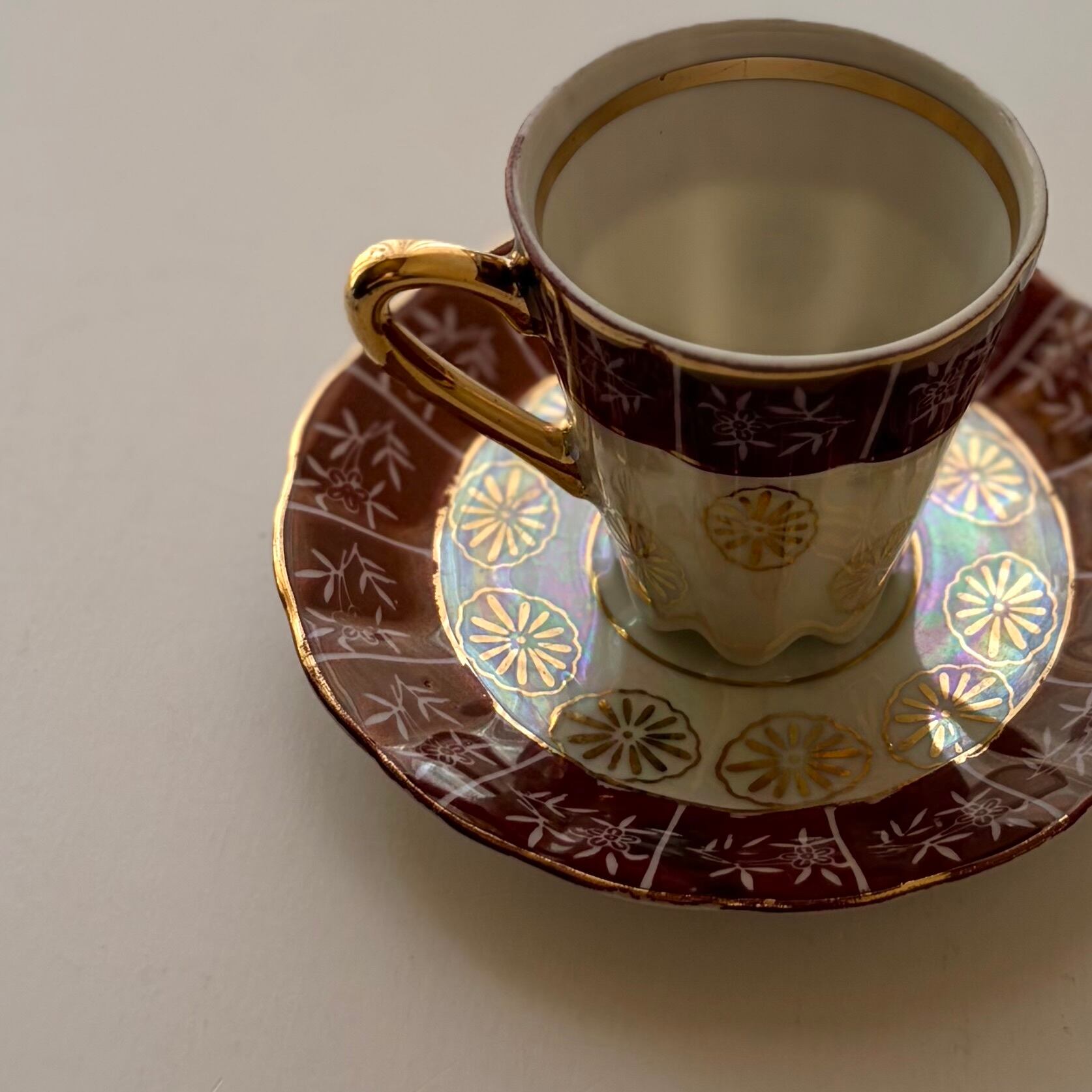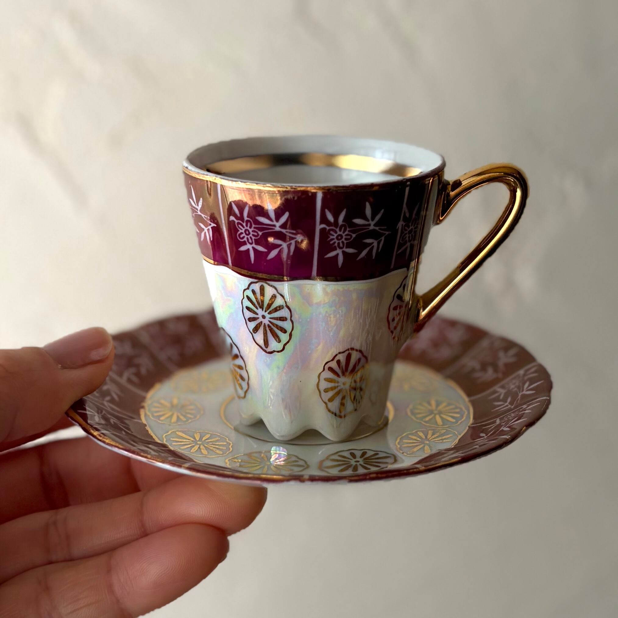 ラスター彩◆デミタスカップ ビンテージ 金彩 ワインレッド フリル