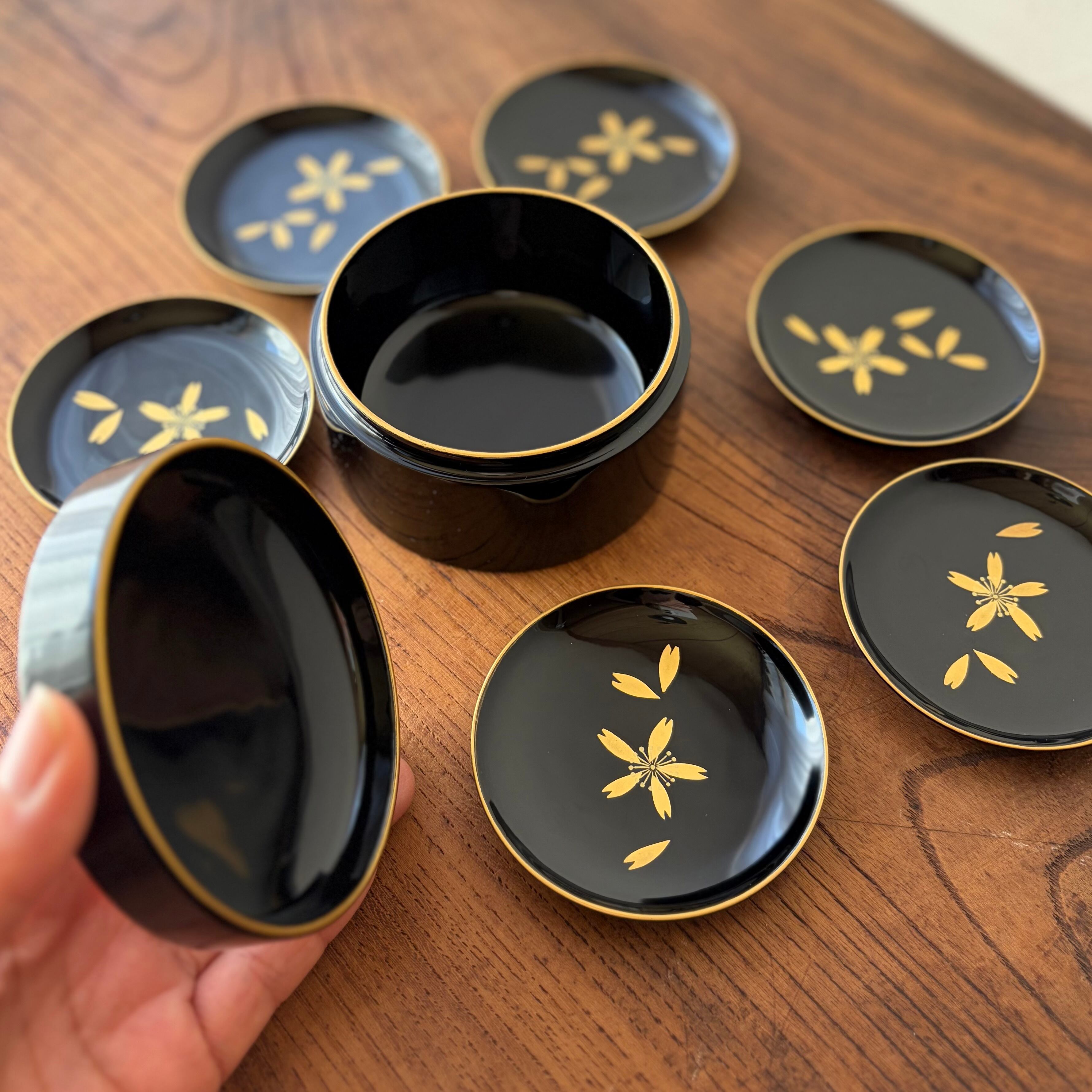 蒔絵によって桜の花が描かれた豆皿6枚組。