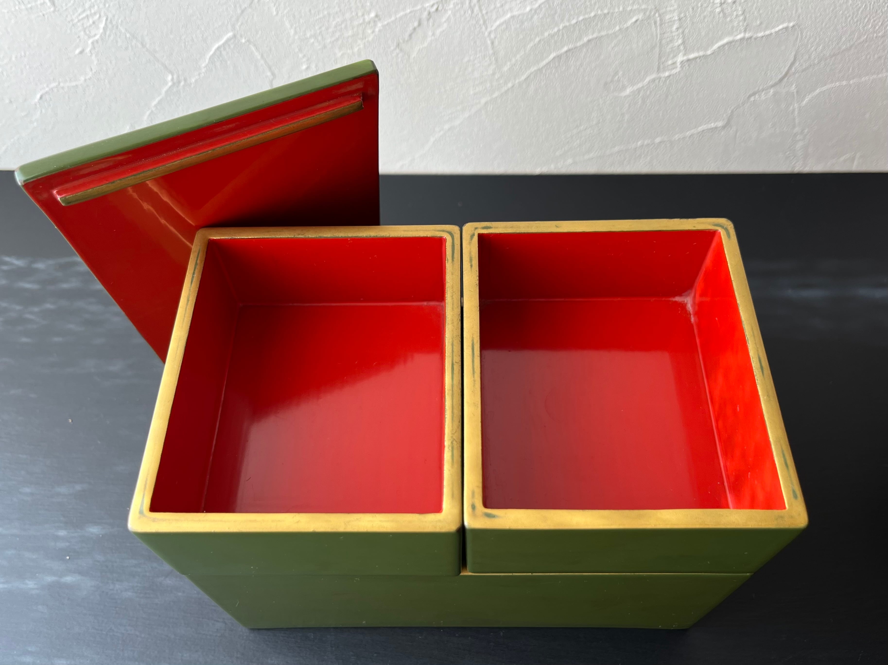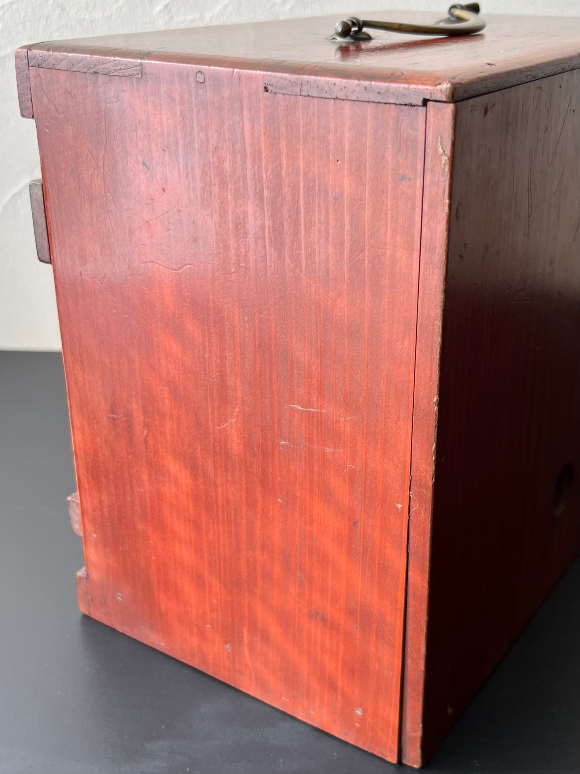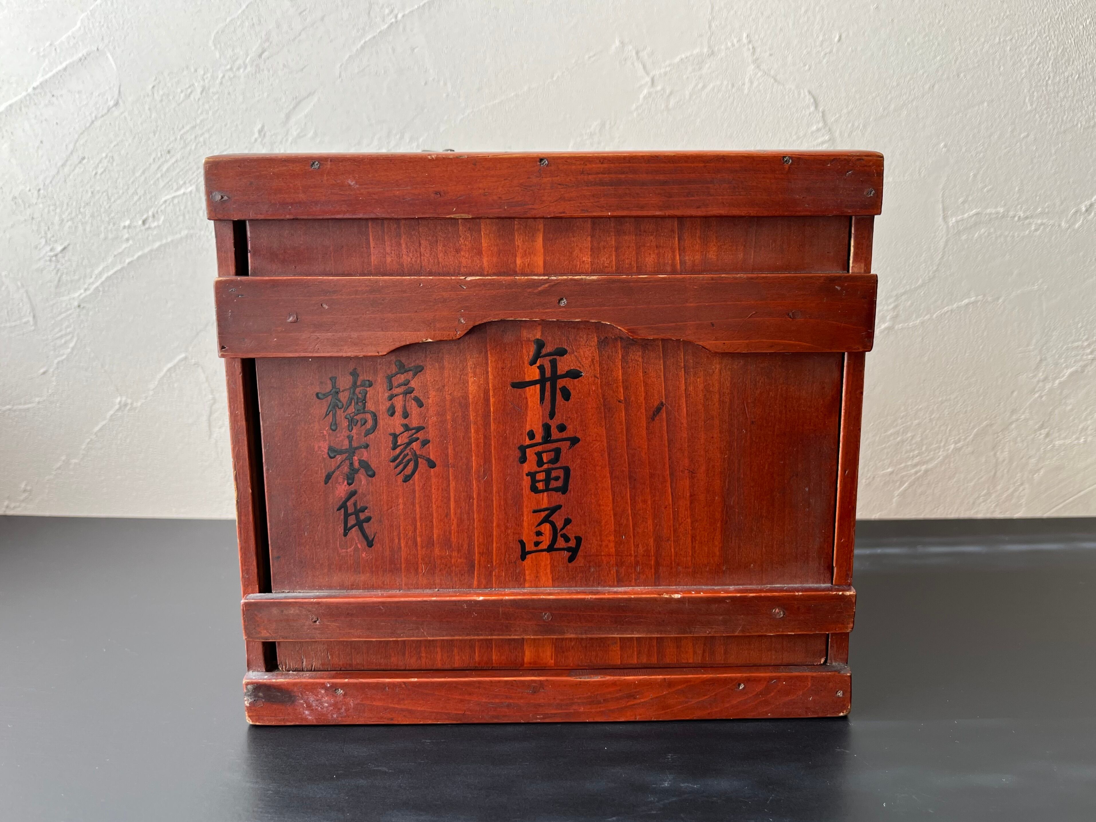 ・明治時代に使われていた弁当箱です。前面の板の裏と外箱裏面に名前が書かれています。画像上は消してありますが、実際には名前が書かれていますのでご承知おきください。(画像13、20枚目)