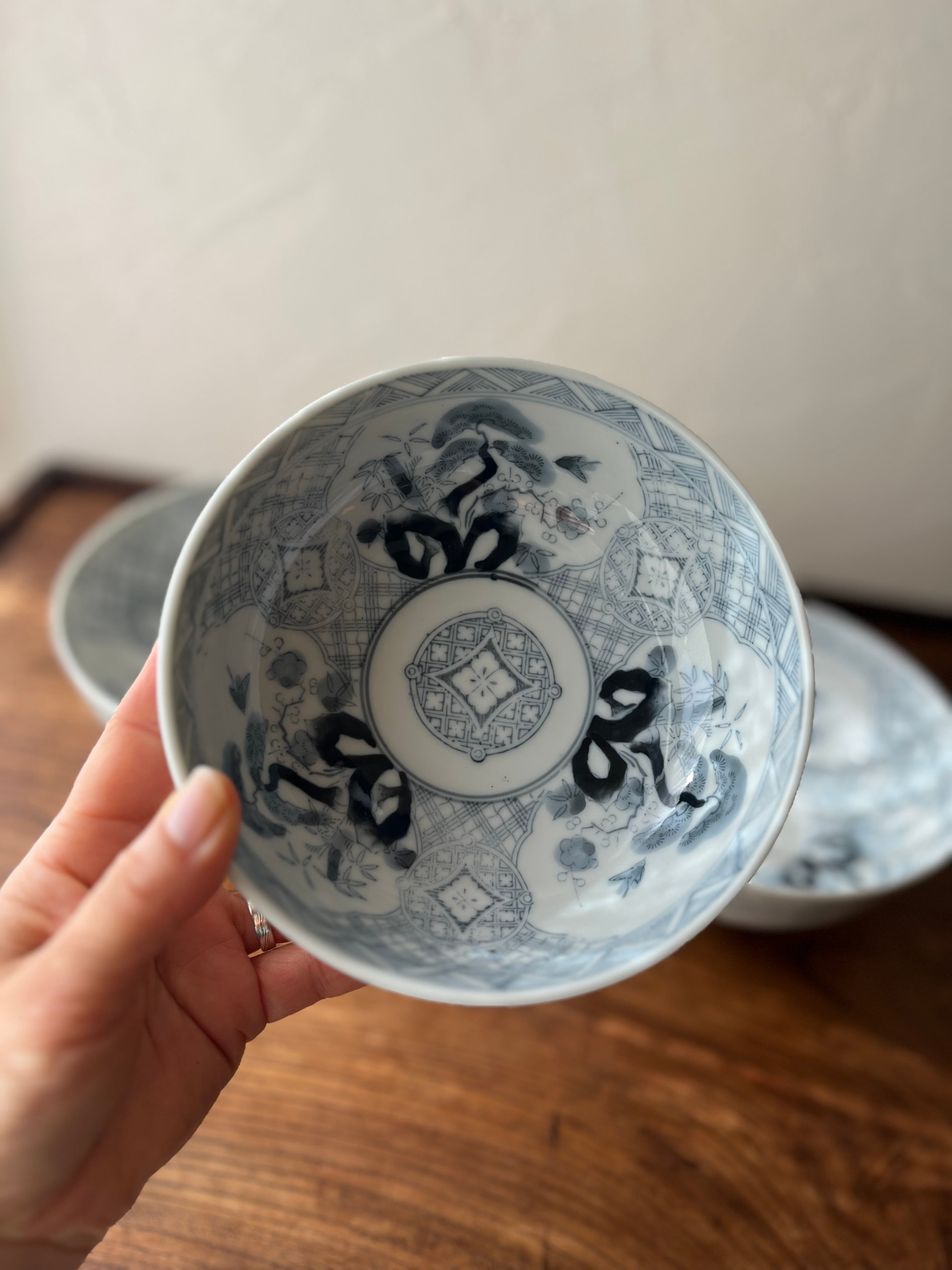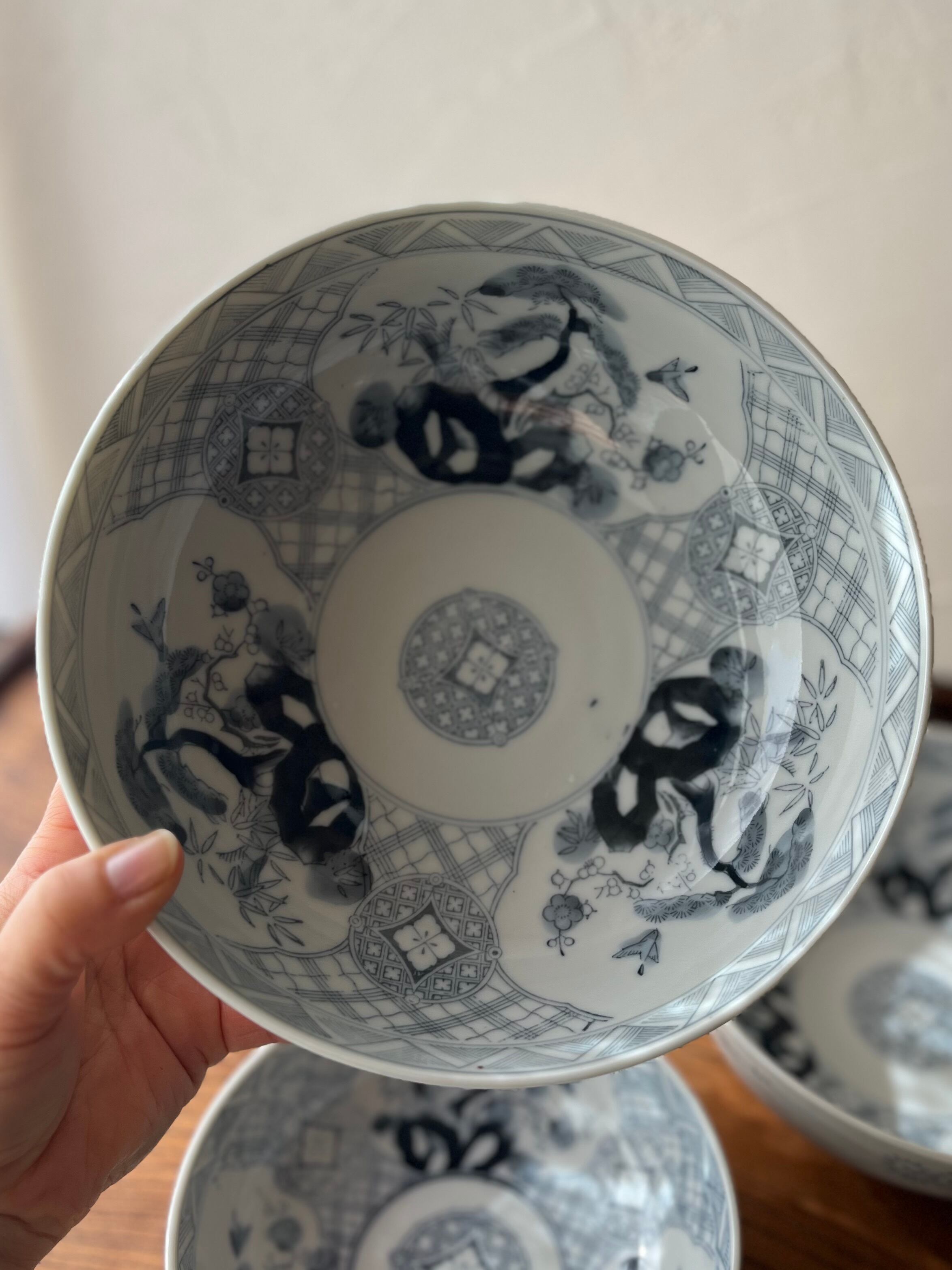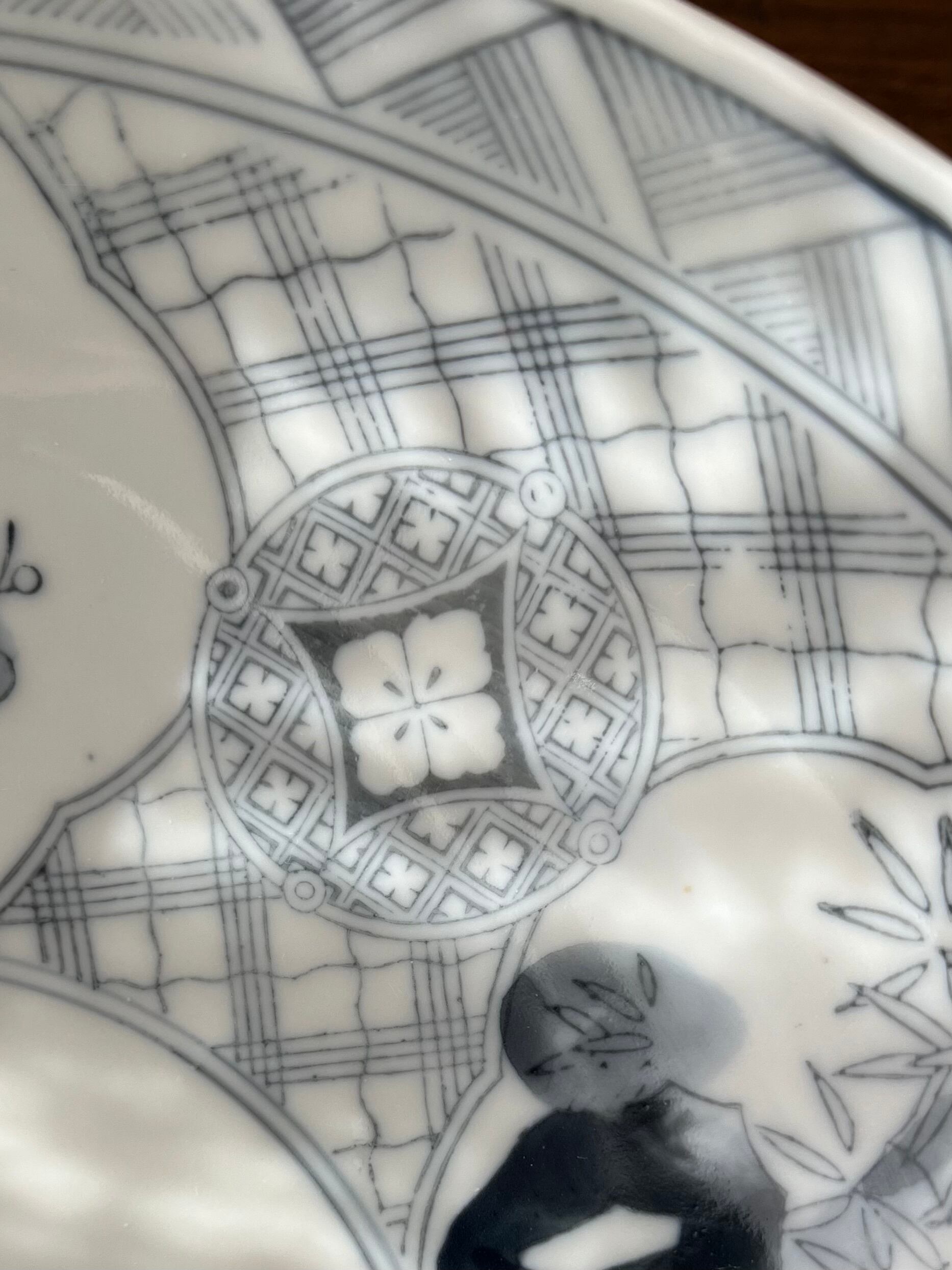 薄墨色で松竹梅と鳥、幾何学模様が描かれた