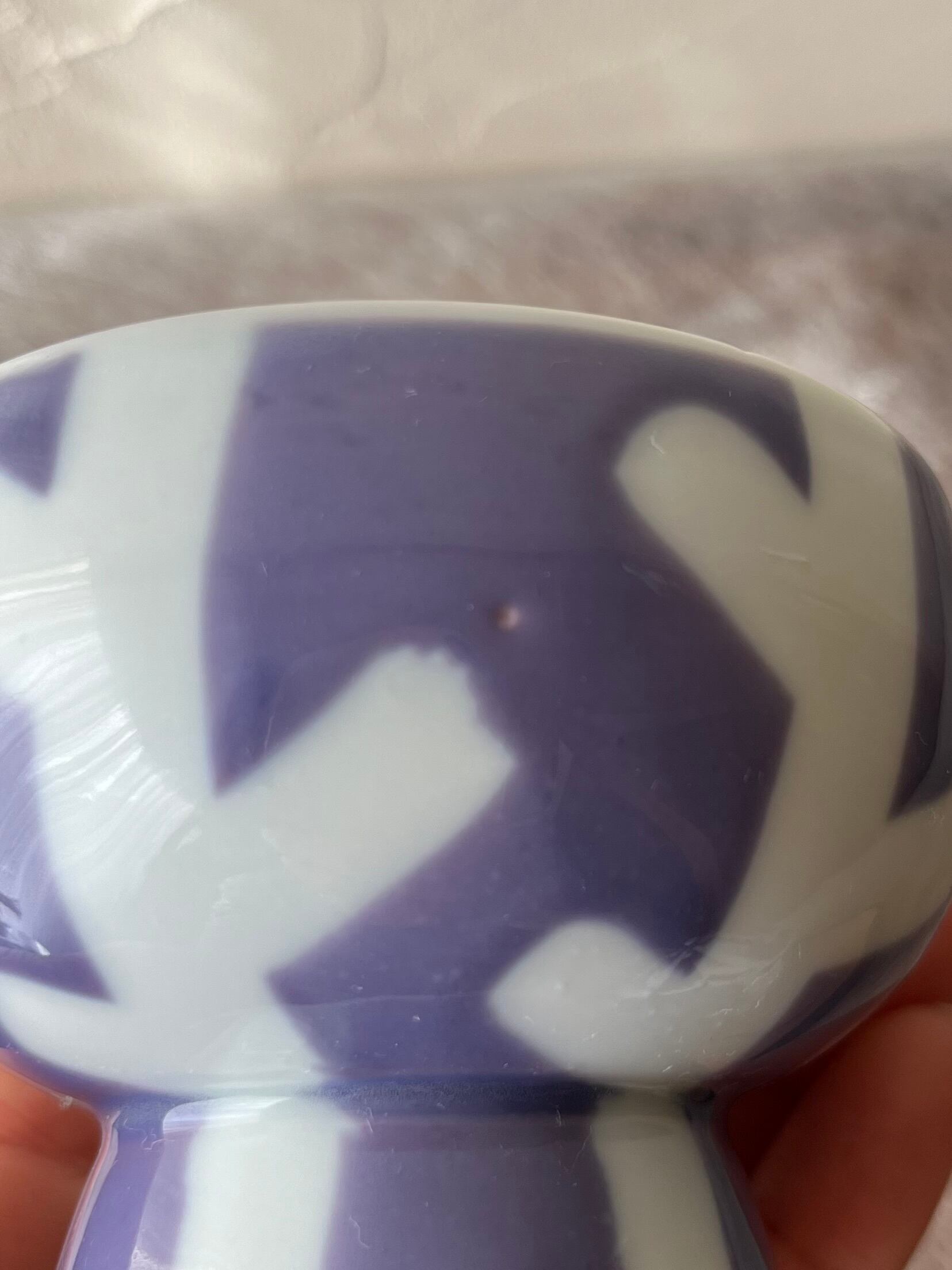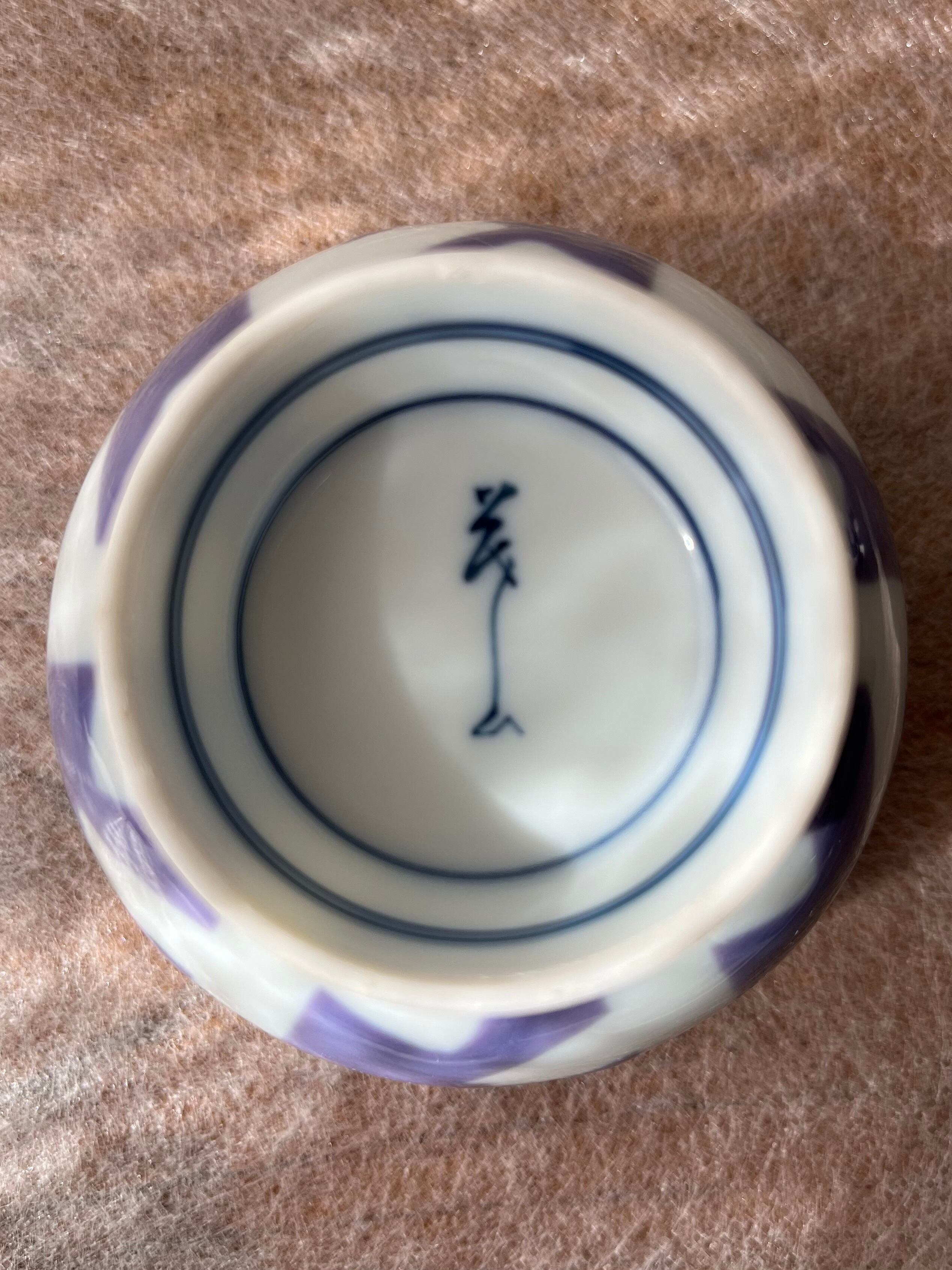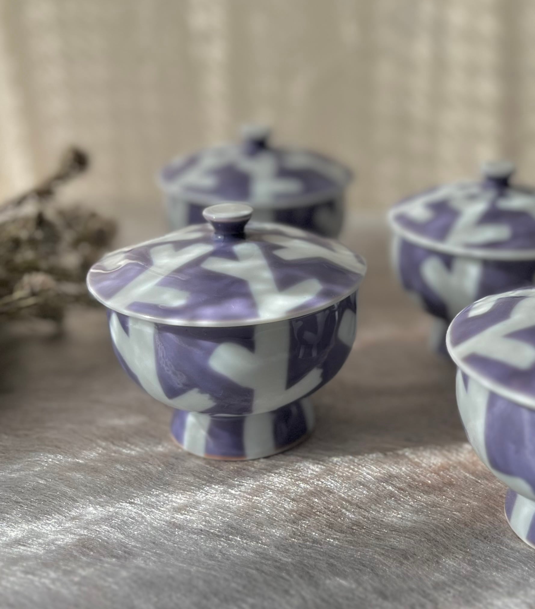 紫色に白抜きのデザイン画と高台を高くした姿が