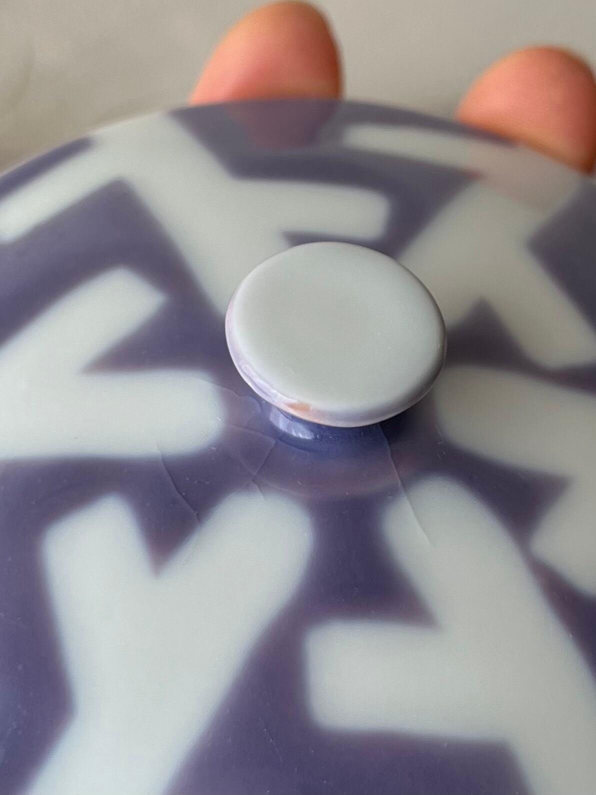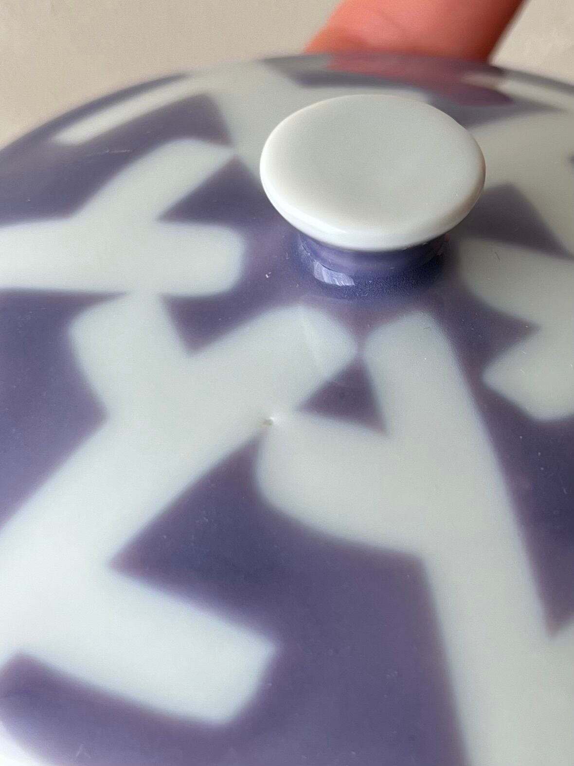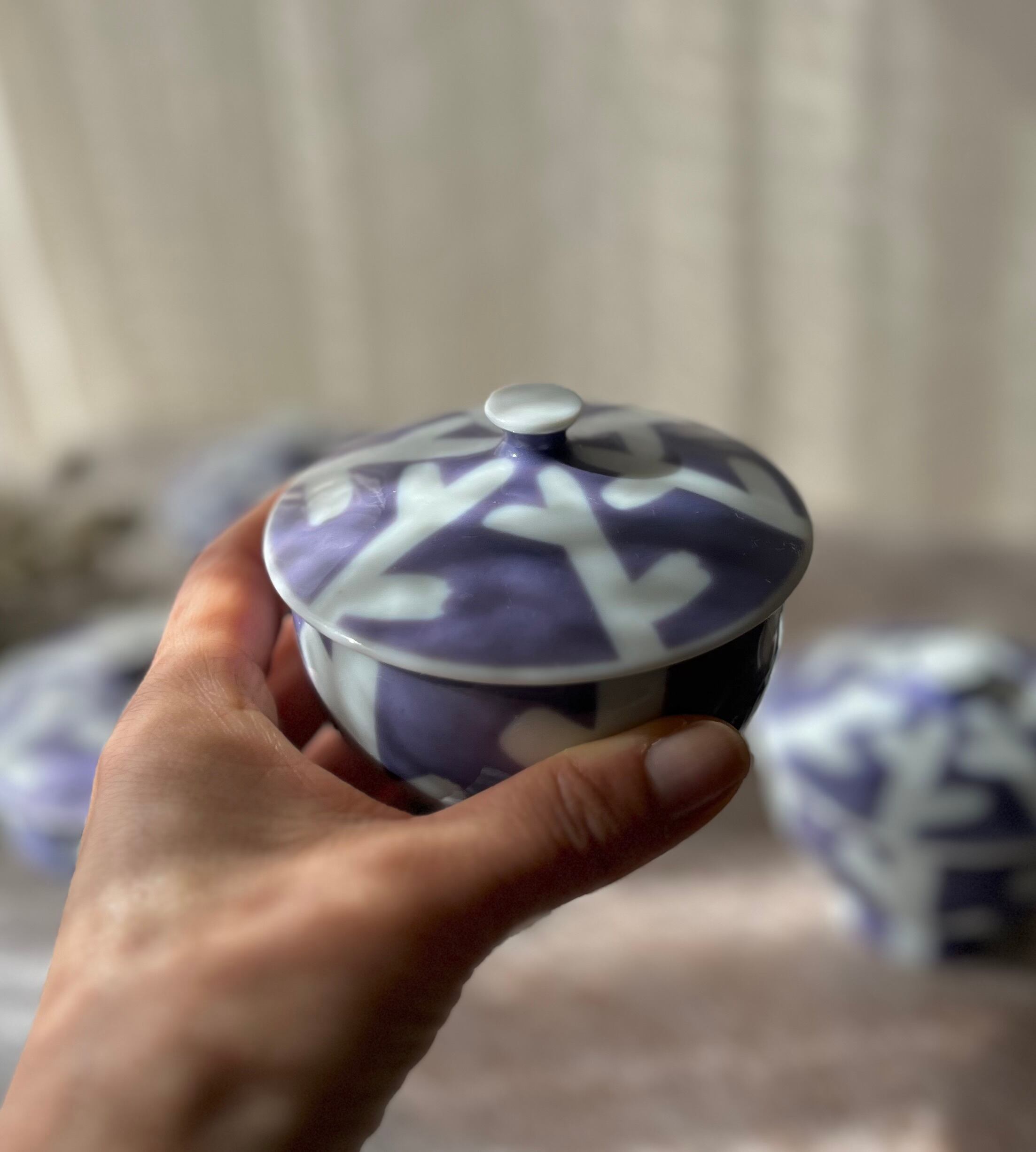 紫色に白抜きのデザイン画と高台を高くした姿が
