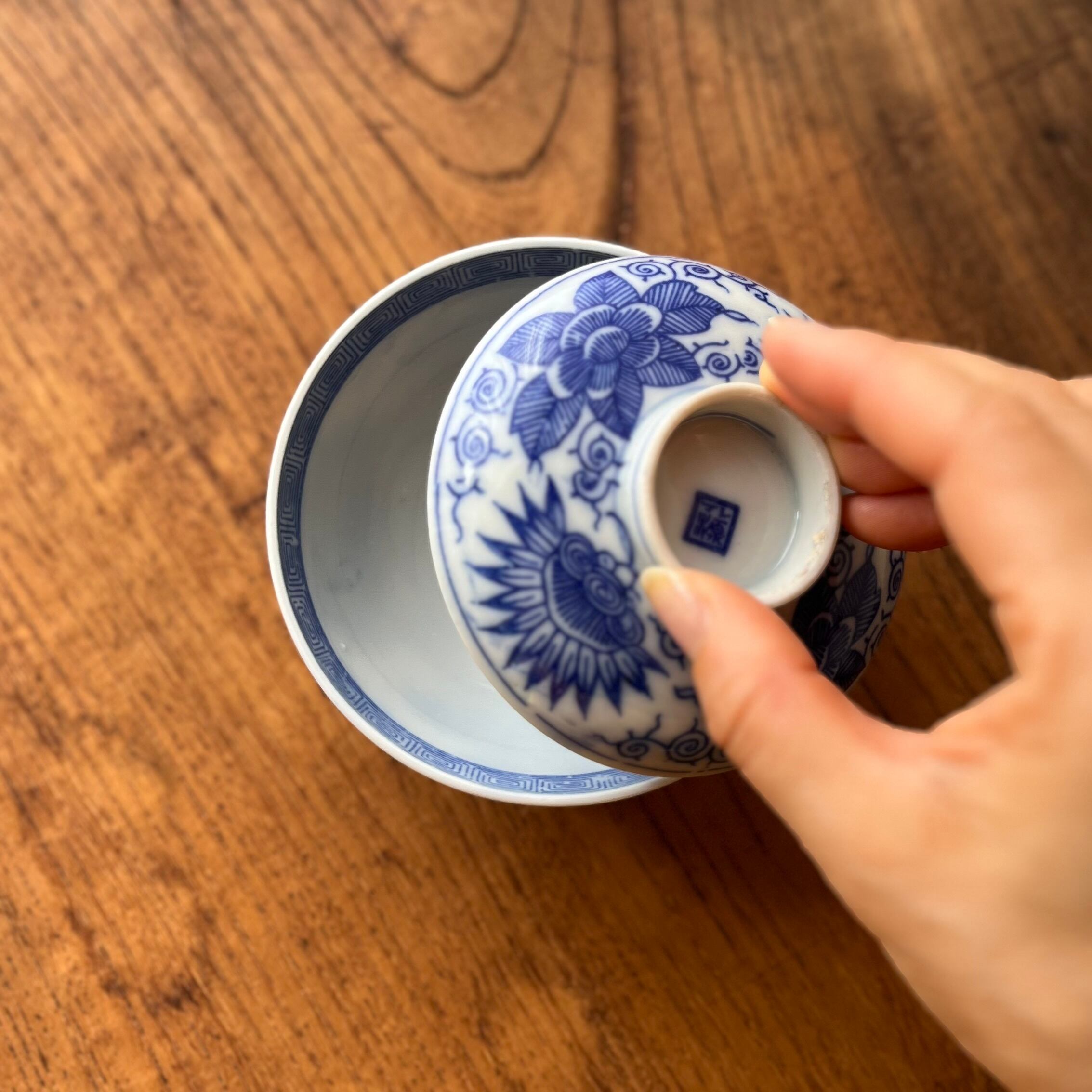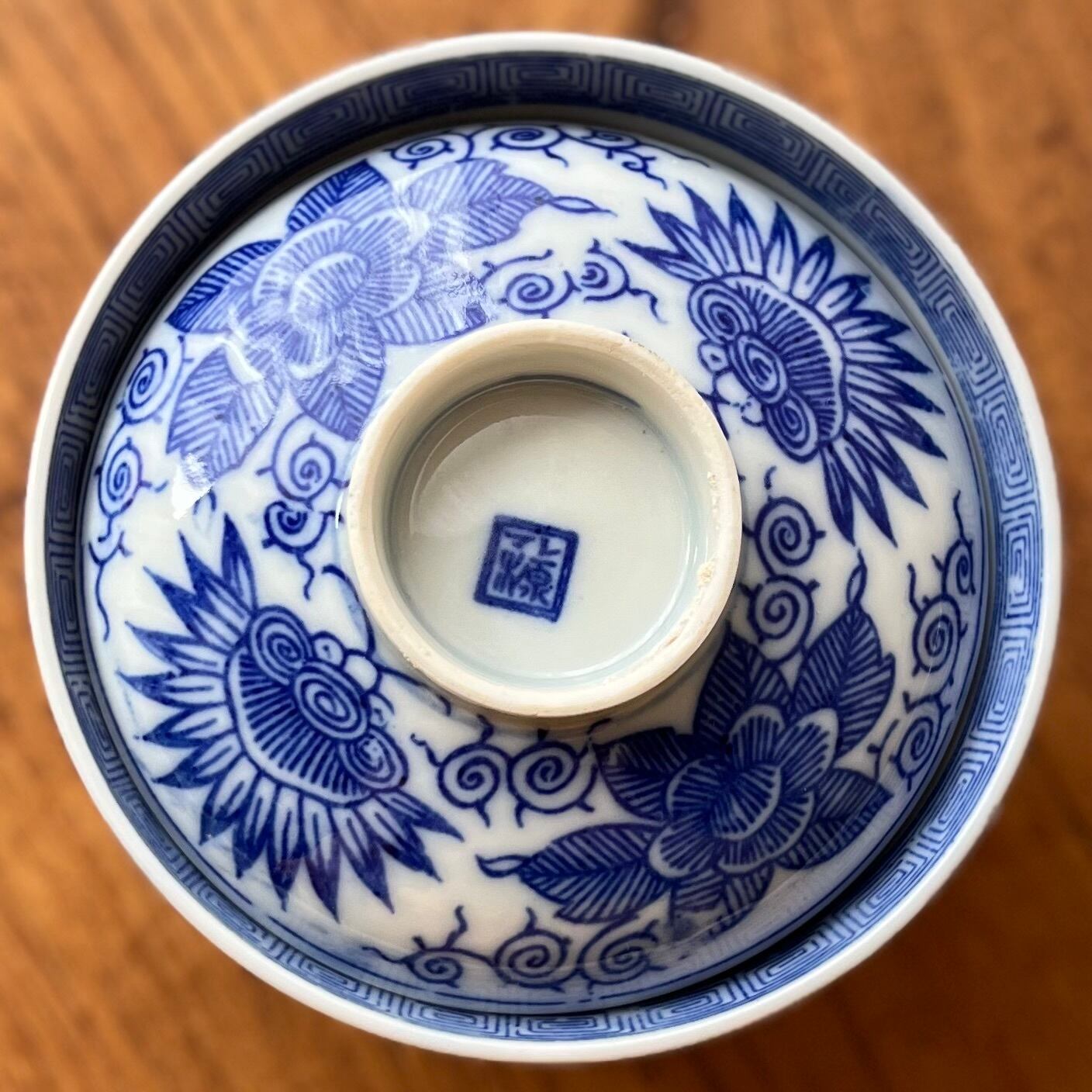 蓋付椀 印判 藍色 植物図 蛸唐草◆明治期