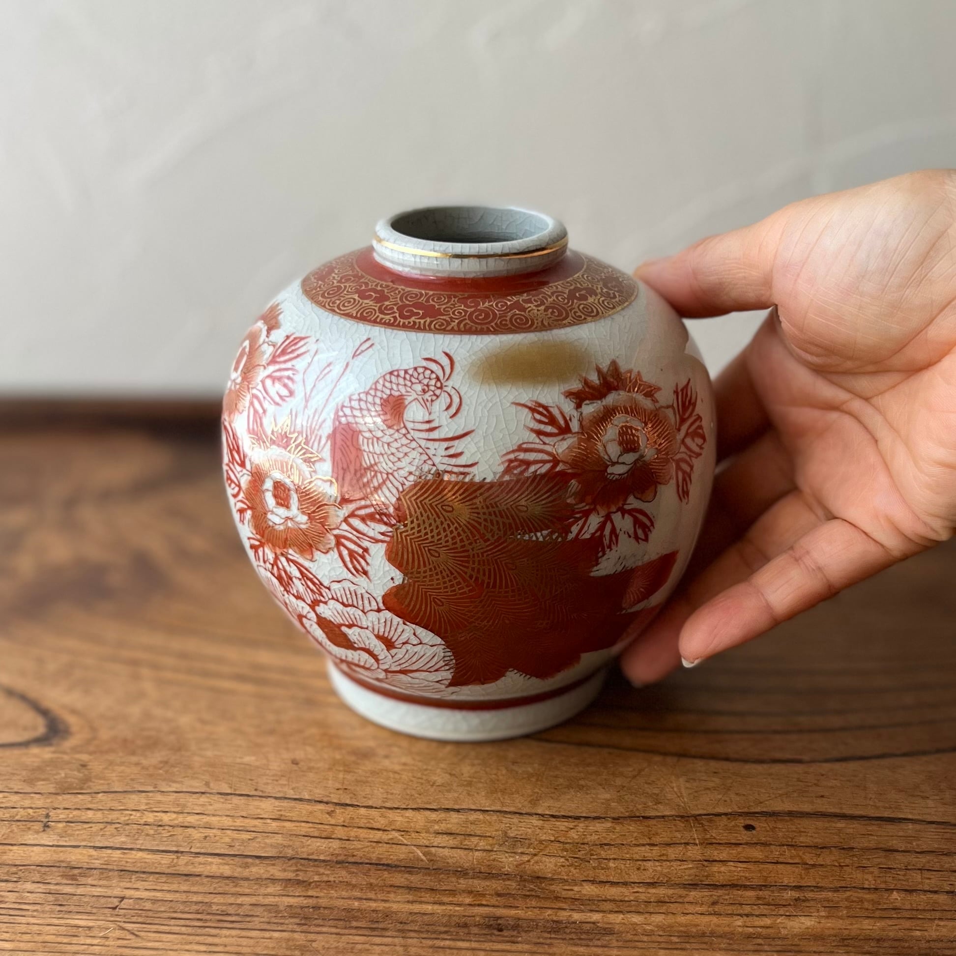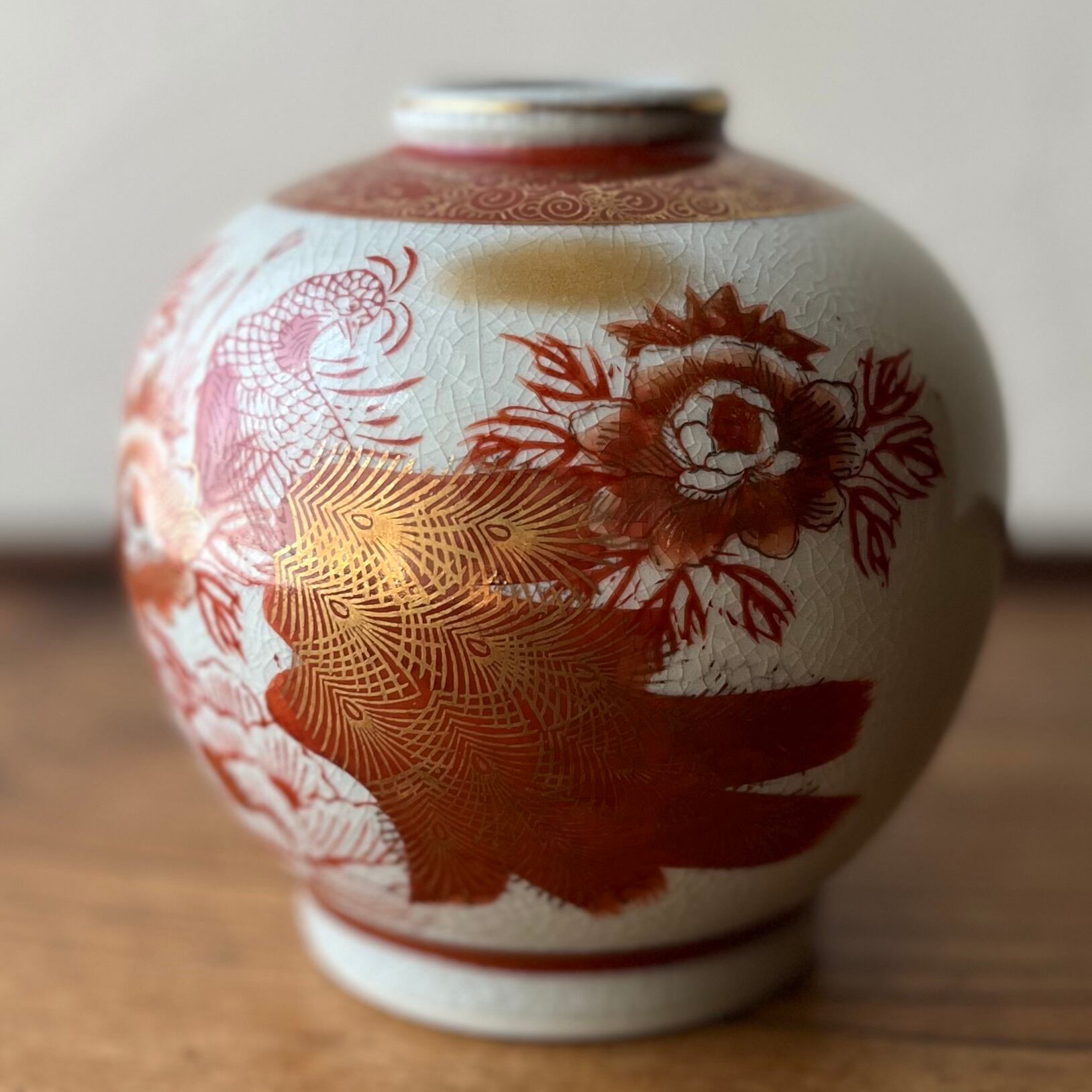 九谷焼 赤絵 小壺 孔雀に牡丹 花瓶 花器 金彩