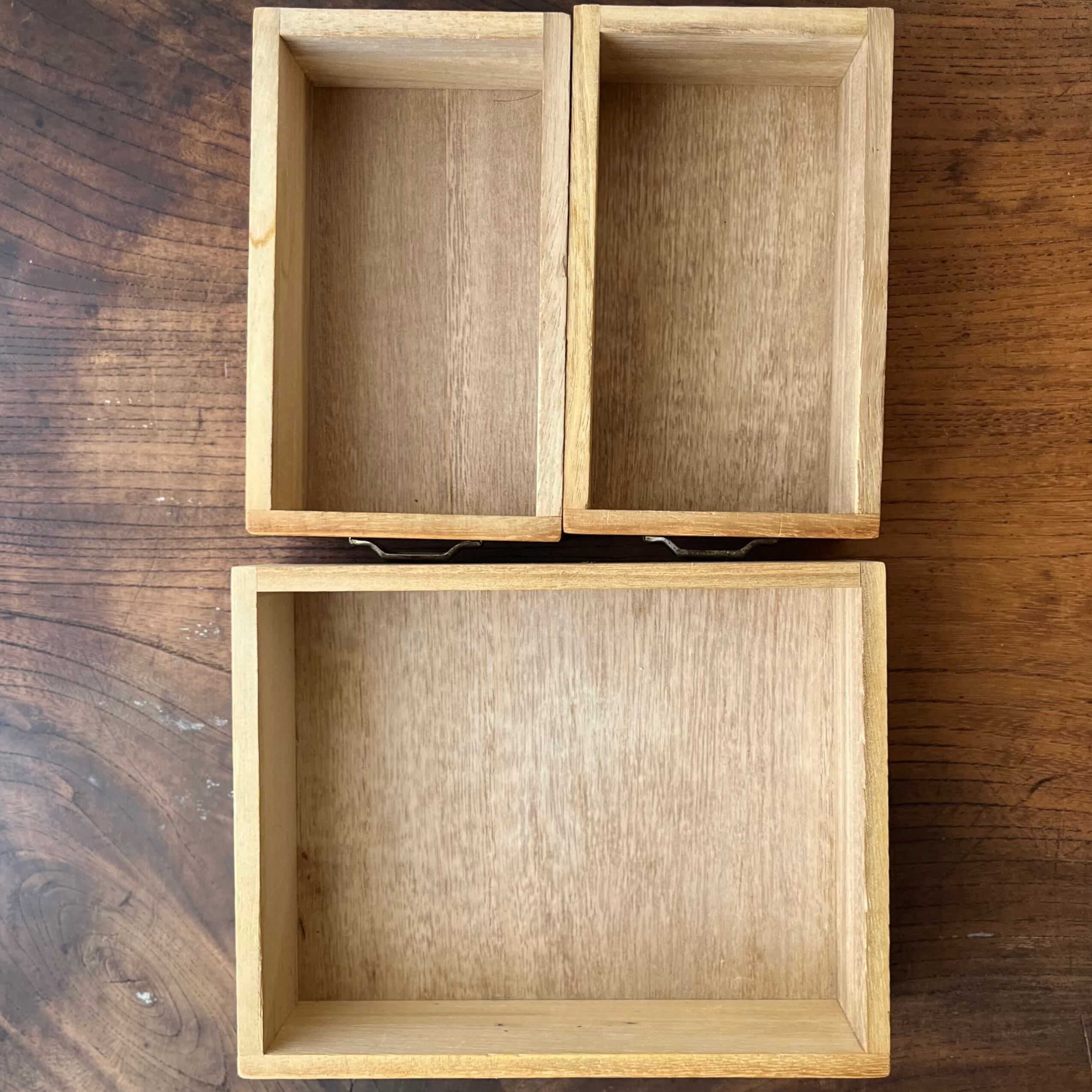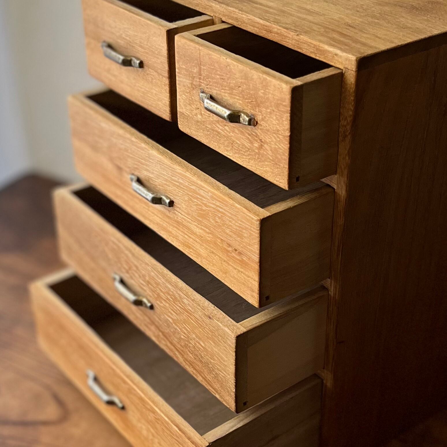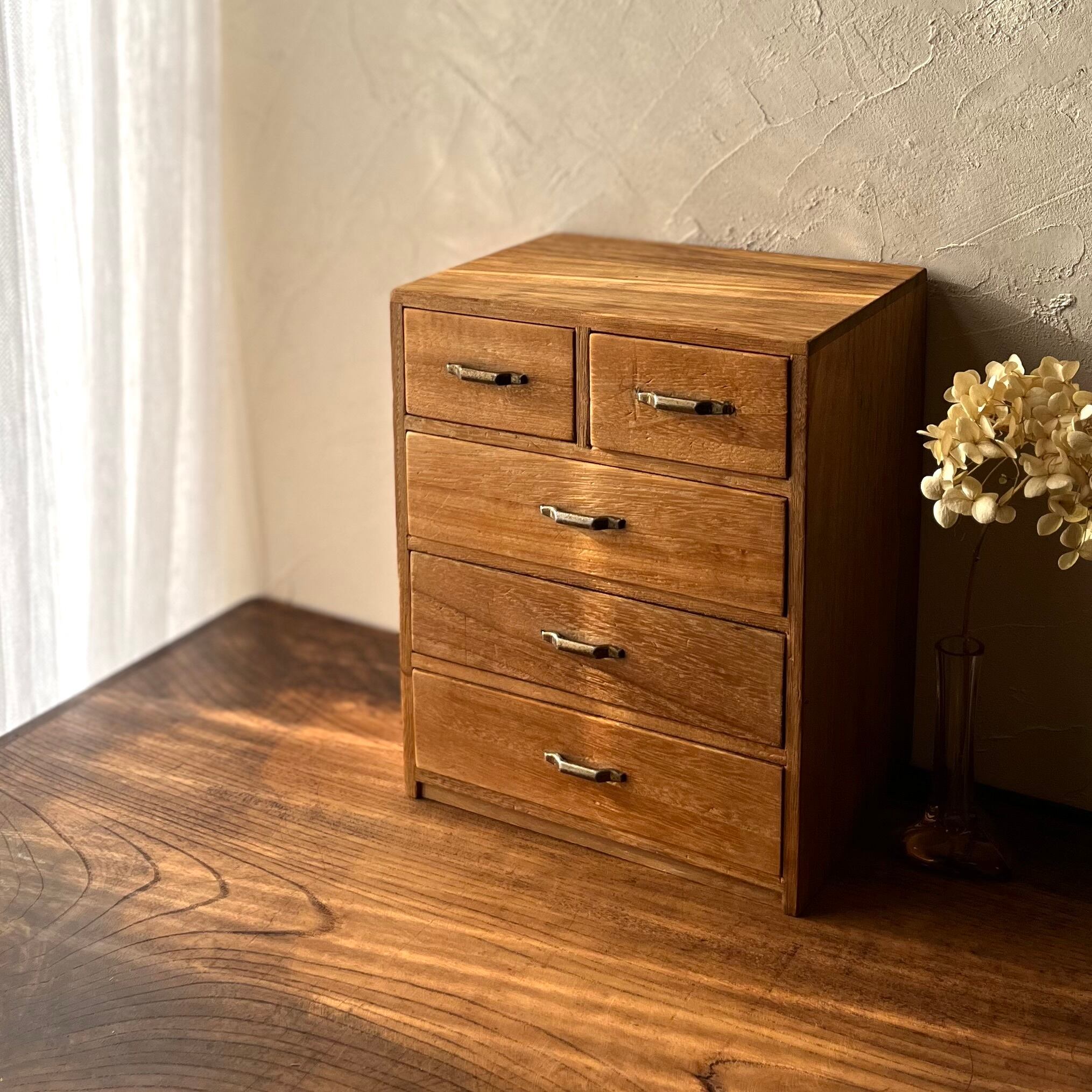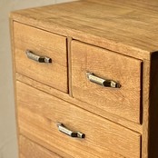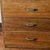 ・引出し上段右のツマミに、接着剤のようなものが付着しています。ツマミは引出しに打ち付ける構造になっていますので、取れにくくするために接着剤を付着させたのかもしれません。使用に問題はありません。見た目もそれほど気になるものではないと判断しました。分かりずらいかもしれませんが画像をよくご確認くださいませ。
