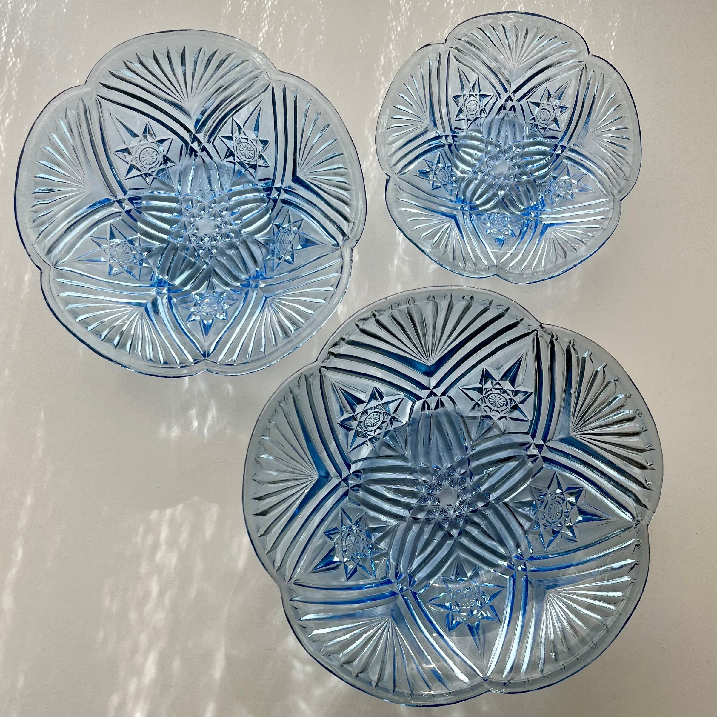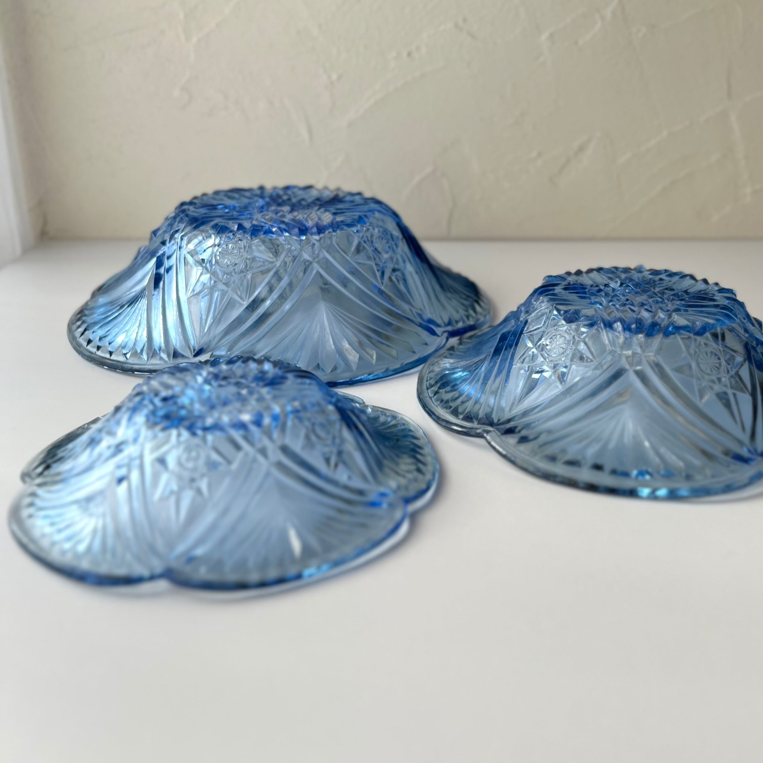 青いガラスの器 サイズ違い3枚セット 輪花型