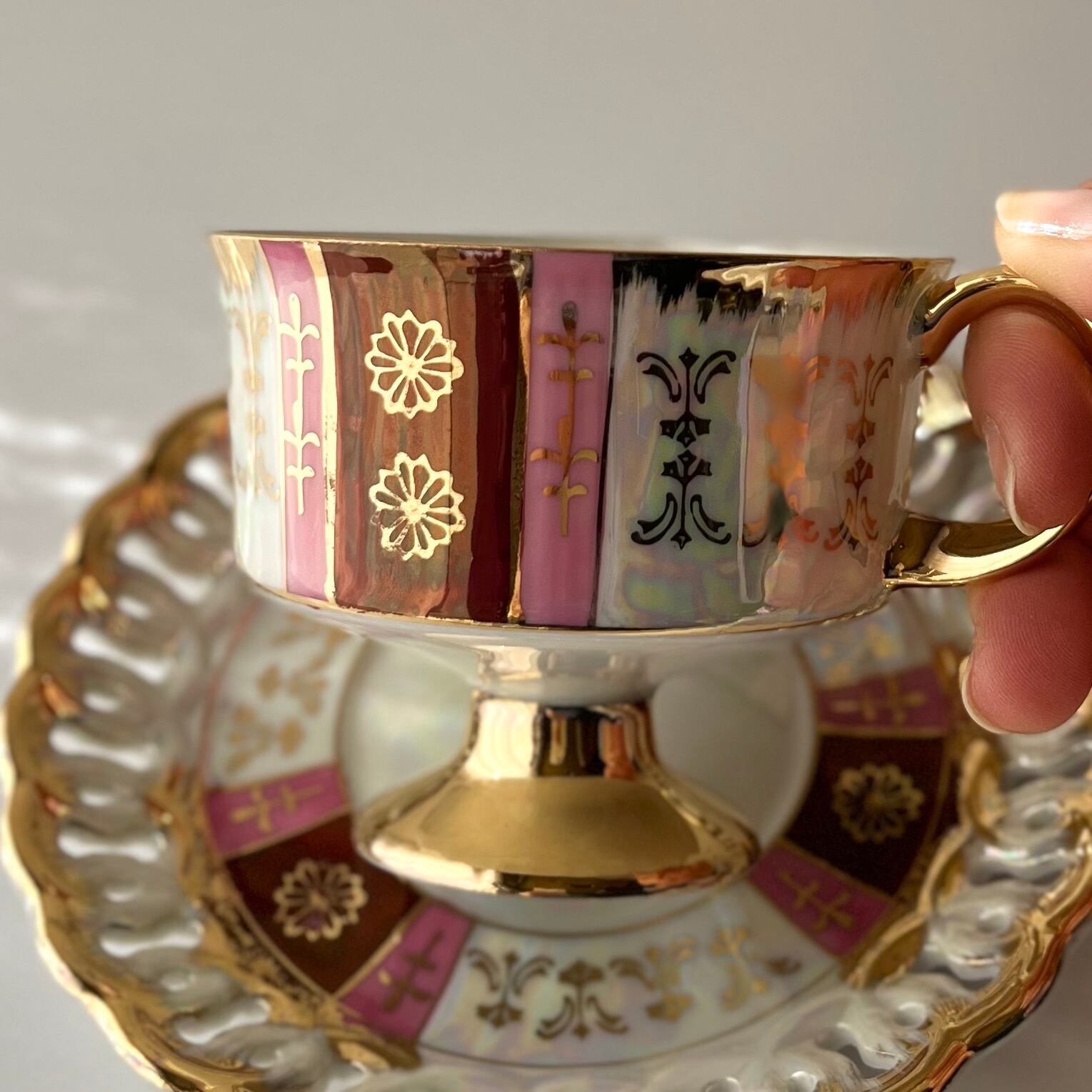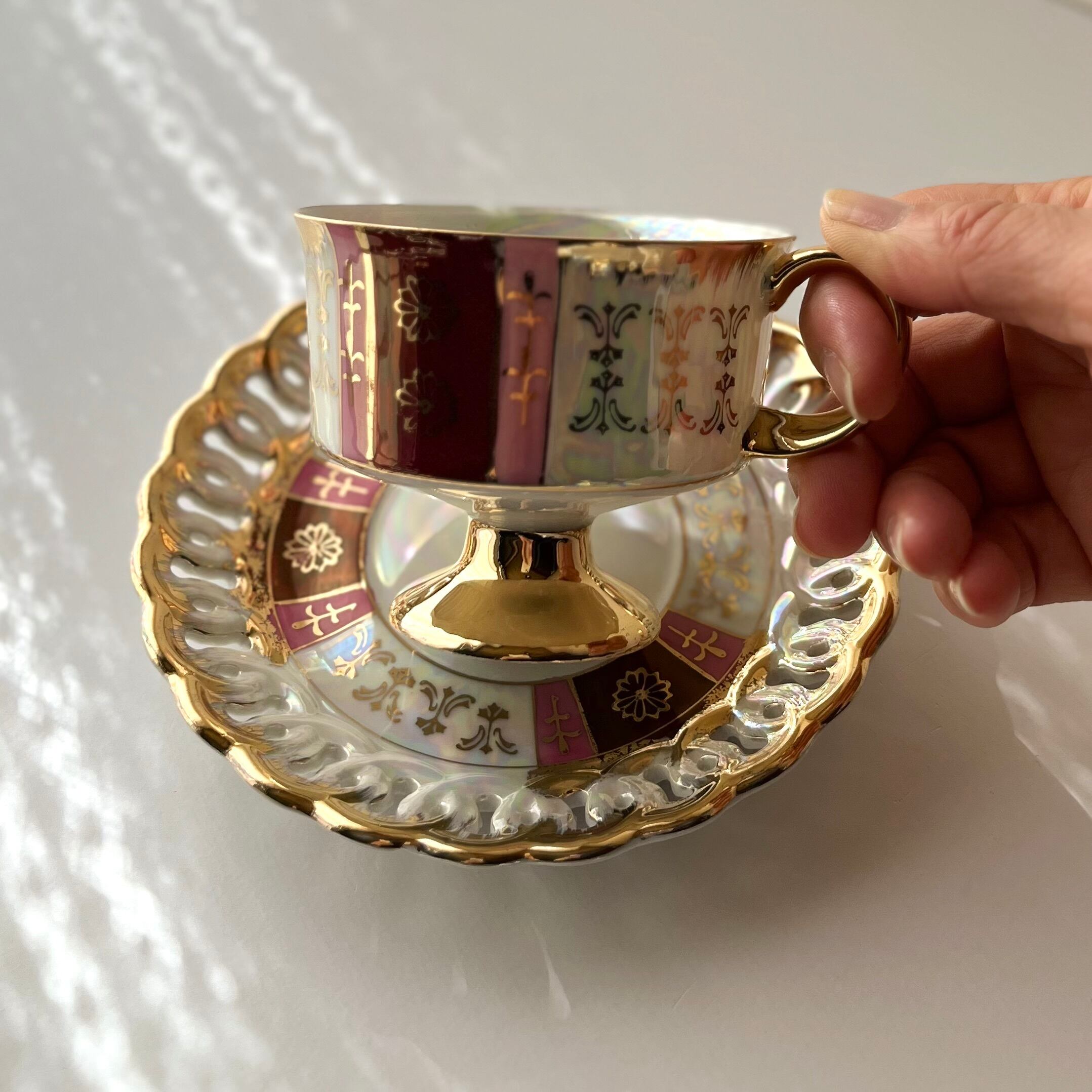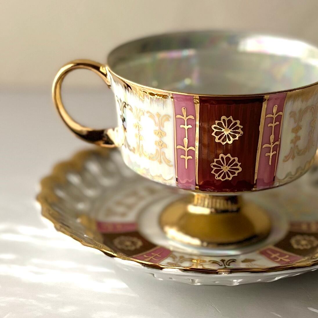 ラスター彩◆コーヒーカップ ビンテージ 金彩 深紅とピンク